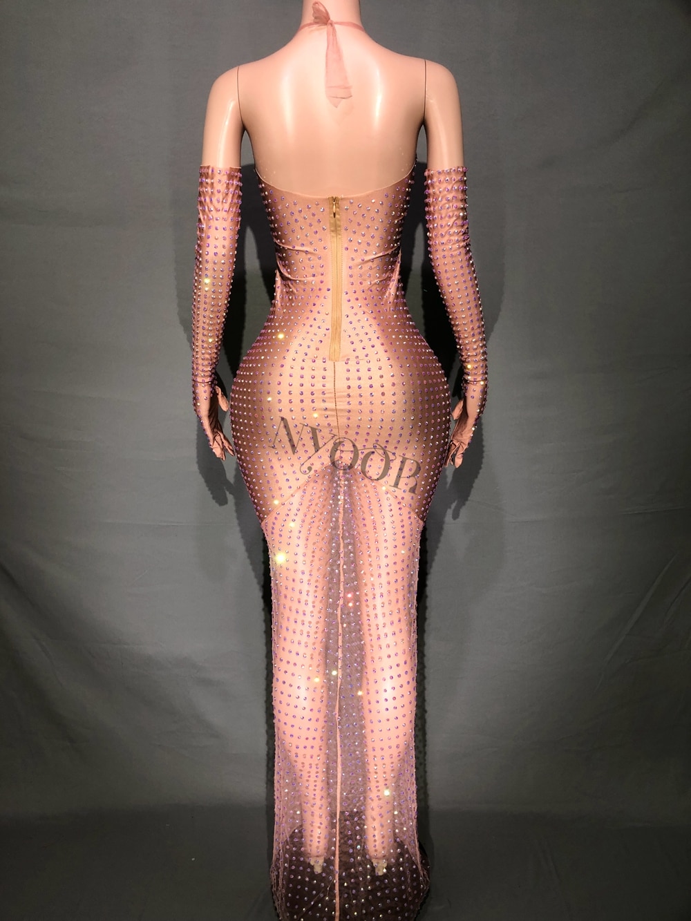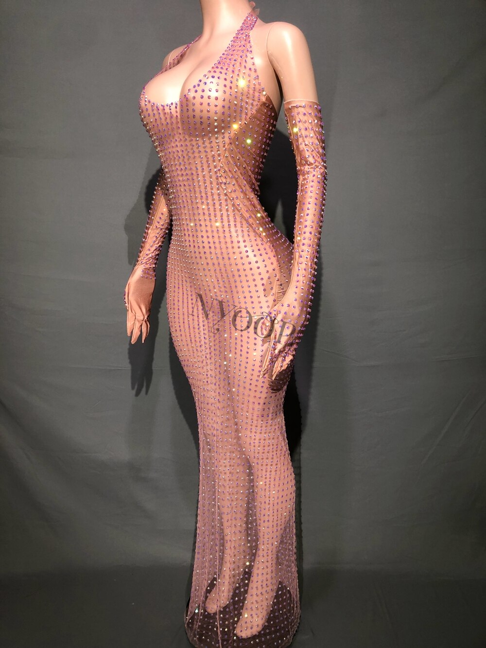 Sparkly Rhinestones Long Dress Gloves Headdress for Women Sexy Mesh See Through Birthday Evening Prom Dresses Stage Outfit Set