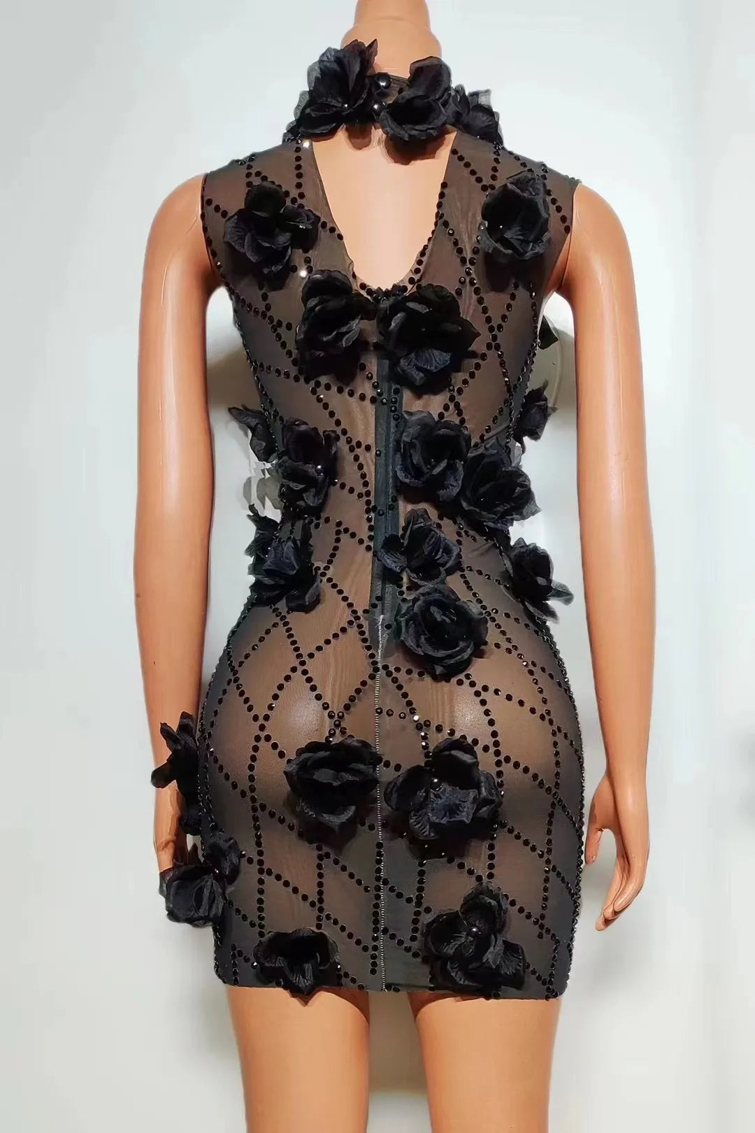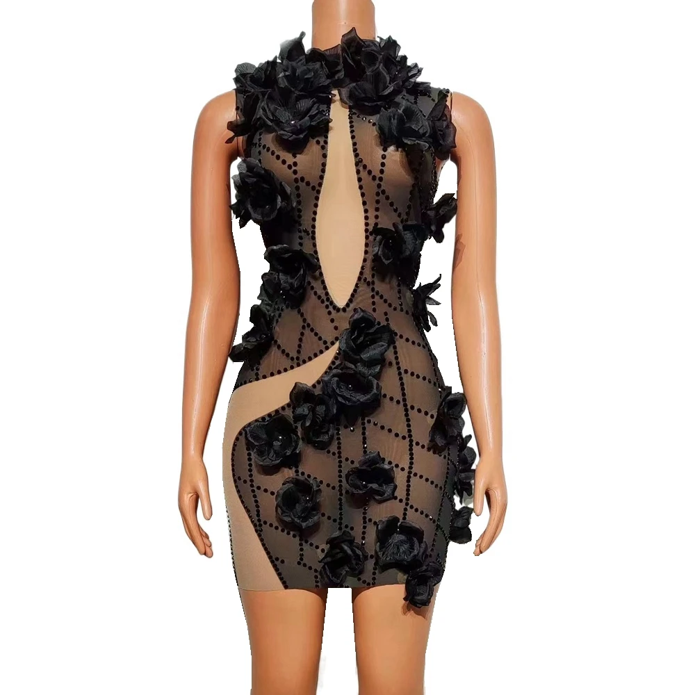 Sparkly Rhinestones Mesh Transparent Flowers Short Dress for Women Sexy Party Prom Birthday Wedding Party Dress Photo Shoot Wear