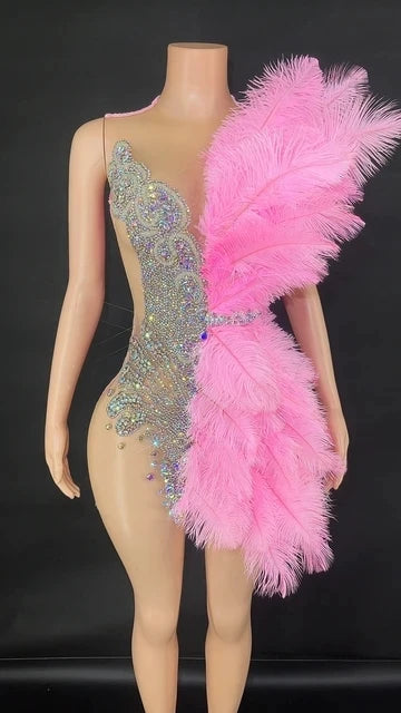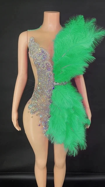 Sparkly Rhinestones Mesh Velvet Sleeveless Feathers Short Dress Women Sexy Celebrate Birthday Evening Dress Latin Dance Costume