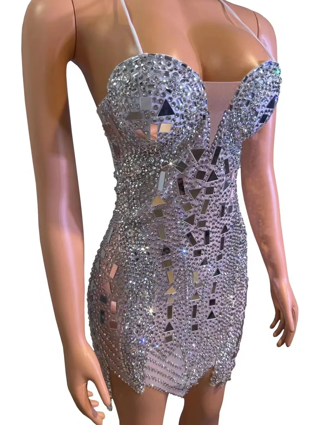 Stand out in style with our sparkly rhinestones mirror V-neck bra short dress. This sexy and glamorous dress is perfect for birthday parties, club nights, dance performances, or any special occasion. The intricate rhinestone detailing and mirror V-neck design add a touch of sparkle and sophistication. The mesh fabric brings a hint of allure to this stunning dress, making it a show-stopping piece for any event. Make a bold statement and radiate confidence in this eye-catching and stylish outfit.