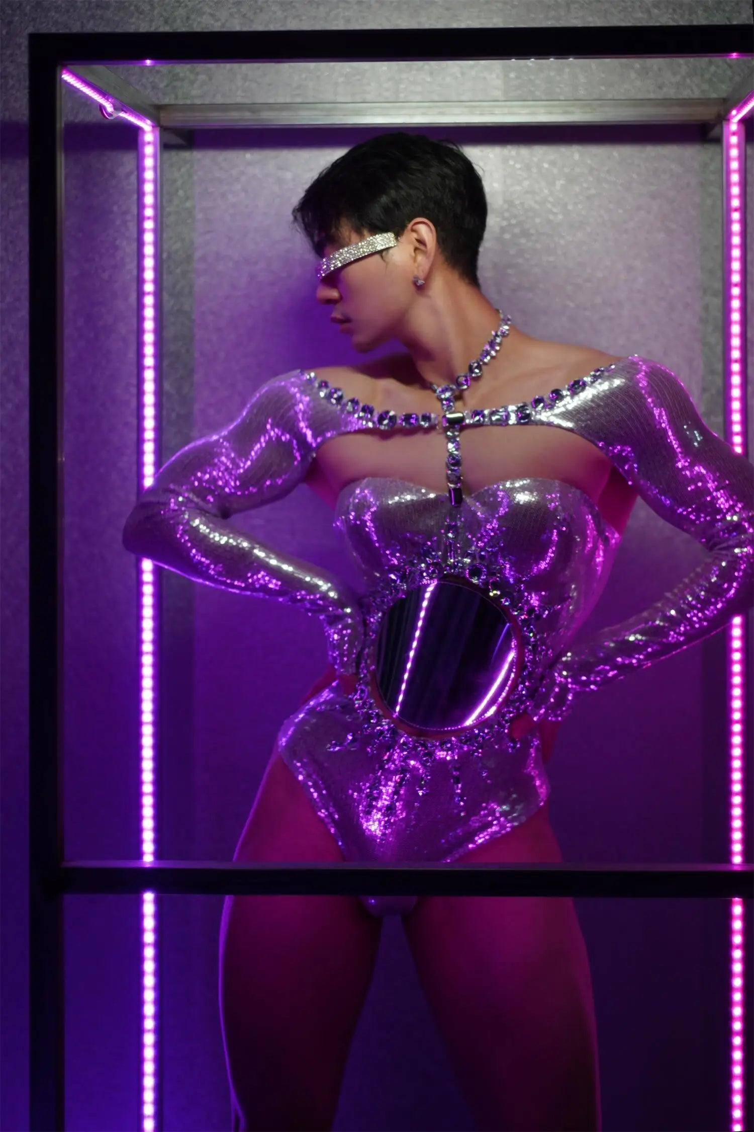 A dazzlingSparkly Rhinestones & Mirrors Bodycon Bodysuitdesigned for women and men who perform, celebrate, or attend high‑impact events (prom, evening, stage shows, drag, club). Combines reflective mirror accents, rhinestones, and a figure‑hugging silhouette for maximum sparkle under lights.