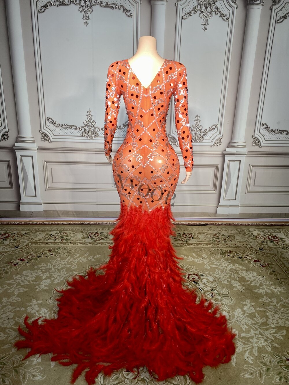 Sparkly Rhinestones Red Sequins Floor-length Feathers Dress for Women Elegant Birthday Celebrate Wedding Evening Prom Dress