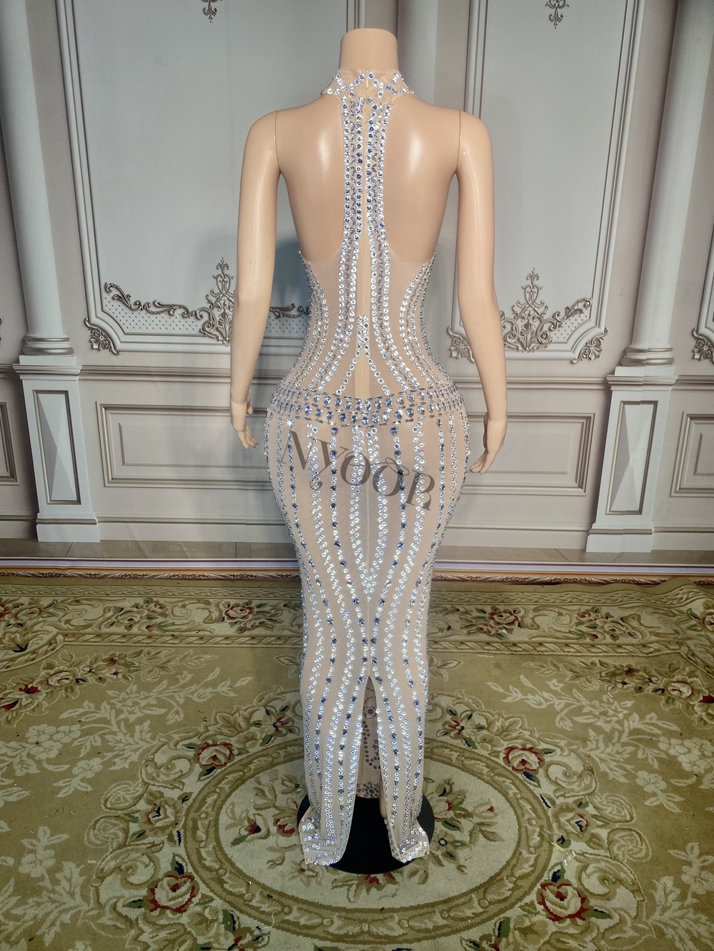 Sparkly Rhinestones Sleeveless Mesh See Through Long Dress for Women Sexy Birthday Celebrate Evening Prom Dress Photo Shoot Wear