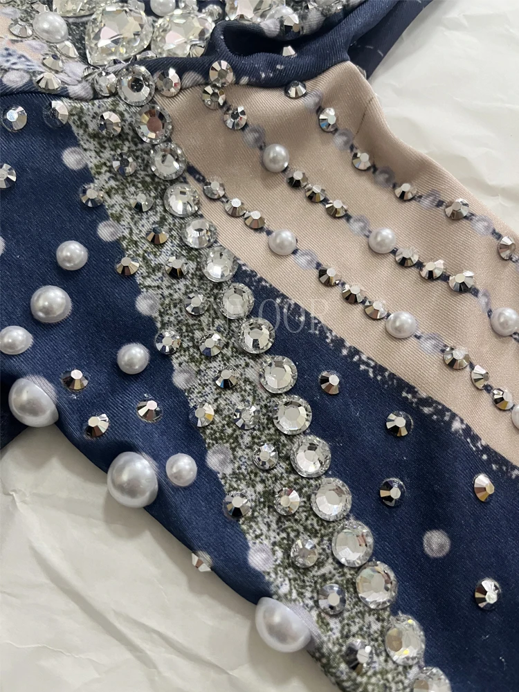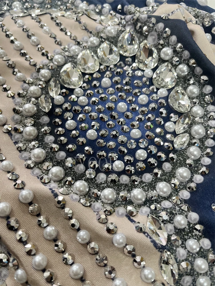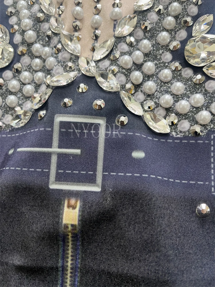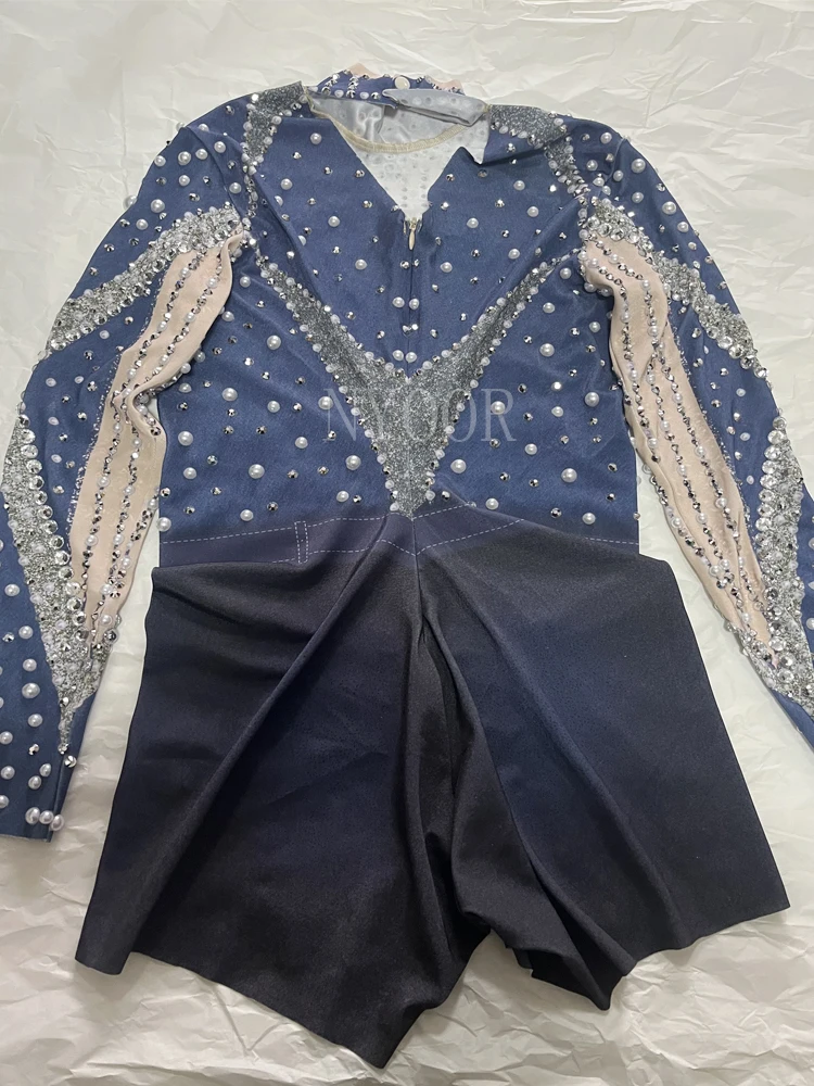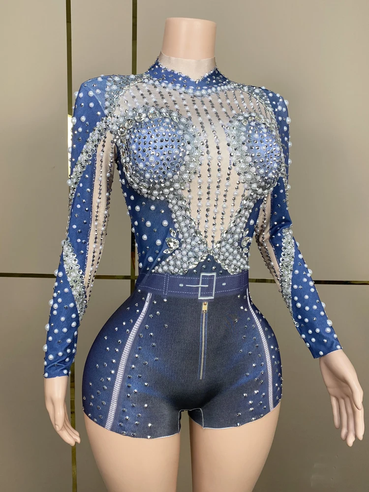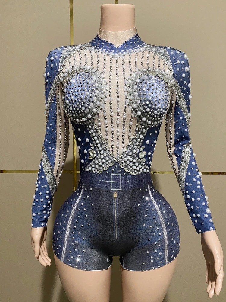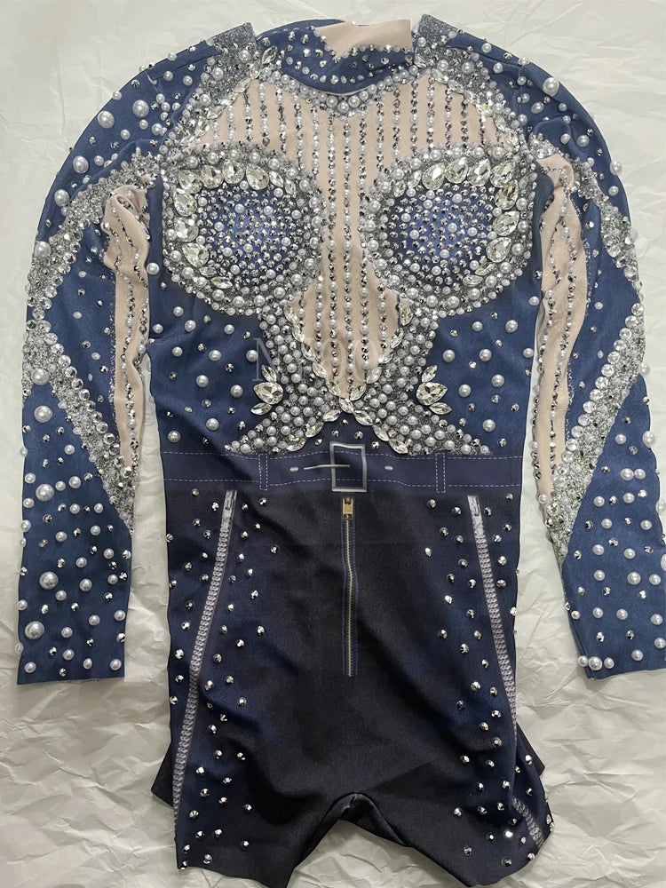 Sparkly Rhinestones White Pearls Long Sleeves Bodysuit ??for Women Sexy Celebrate Evening Prom Birthday Photography Shoot Wear