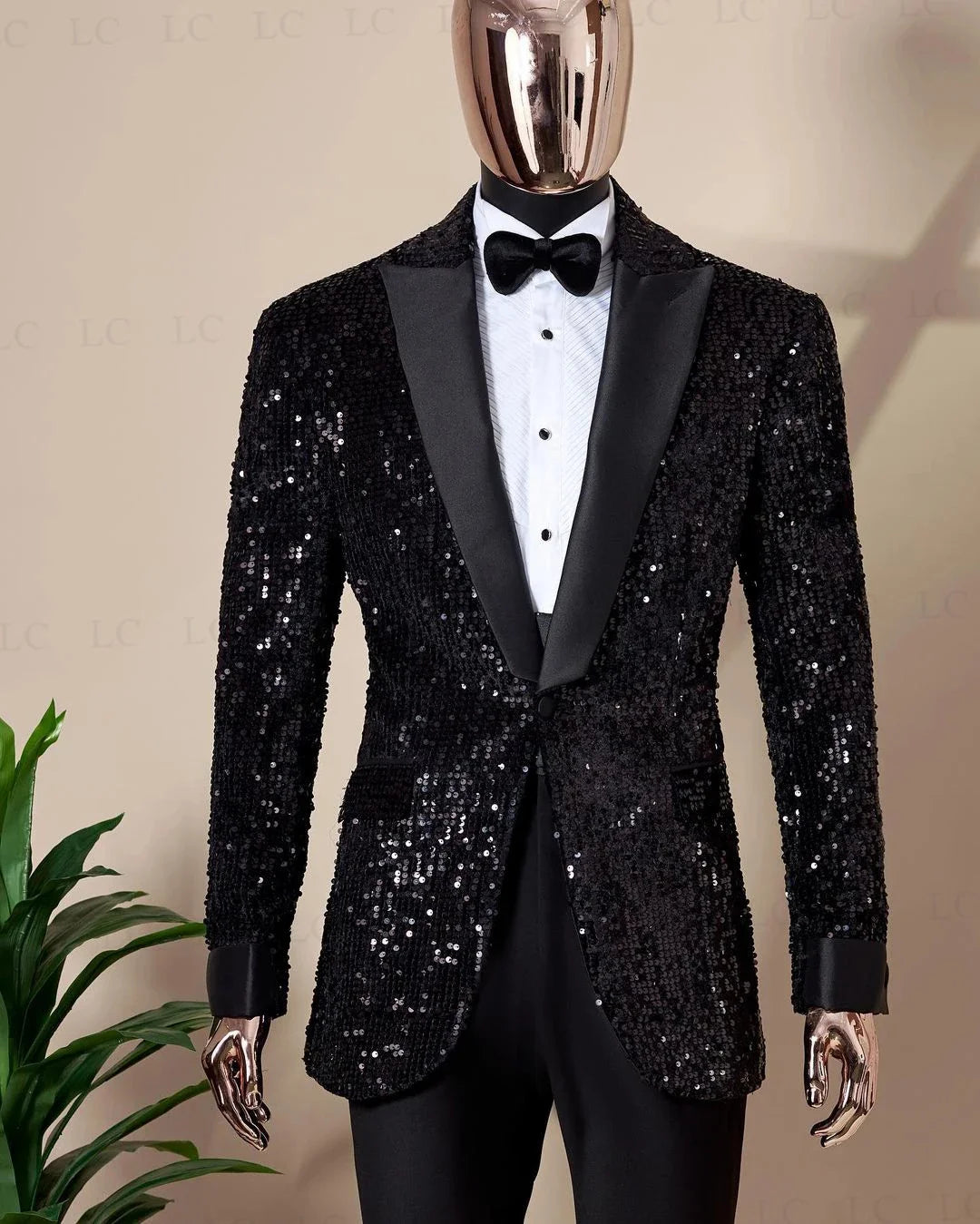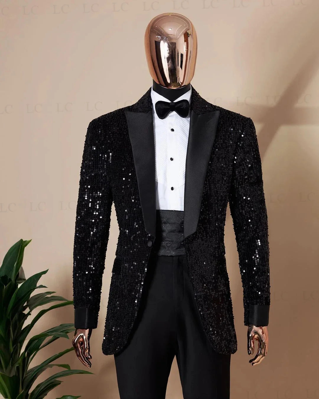 This men's suit set features a sparkly design with satin lapels on the blazer and pants. The sequins detailing adds a touch of glamour to the ensemble. The one-button blazer is slim-fitting and suitable for prom, weddings, and as a groom outfit. Available in plus sizes, this costume homme is a stylish choice for men looking for a sophisticated and eye-catching formal attire.