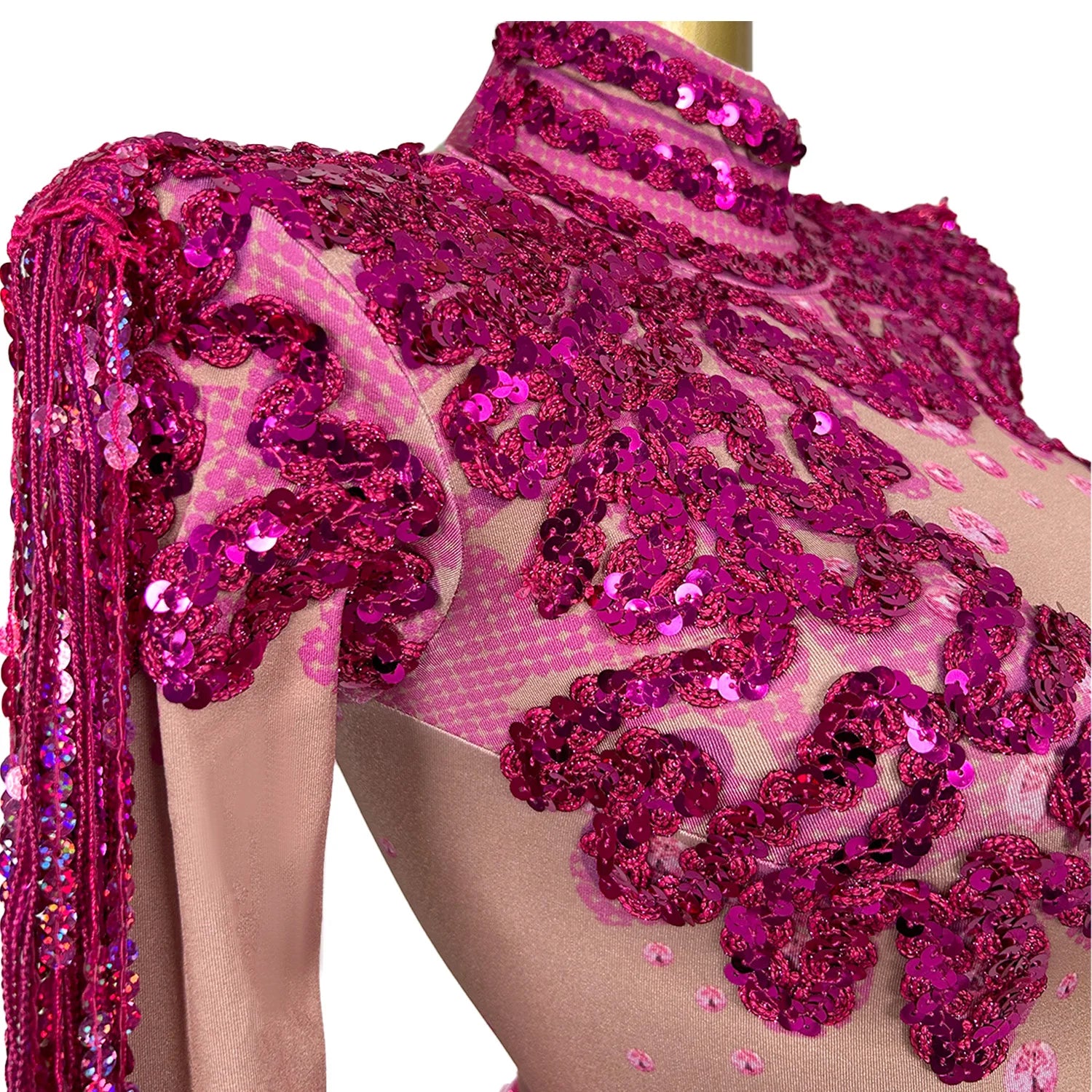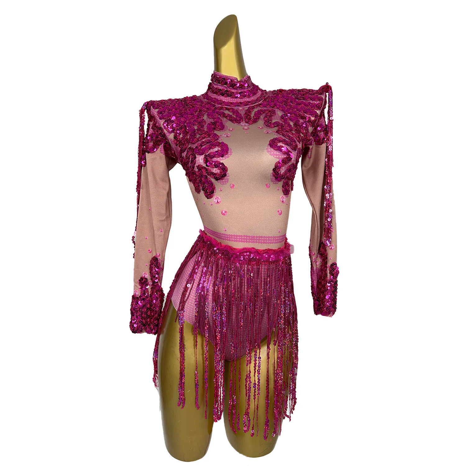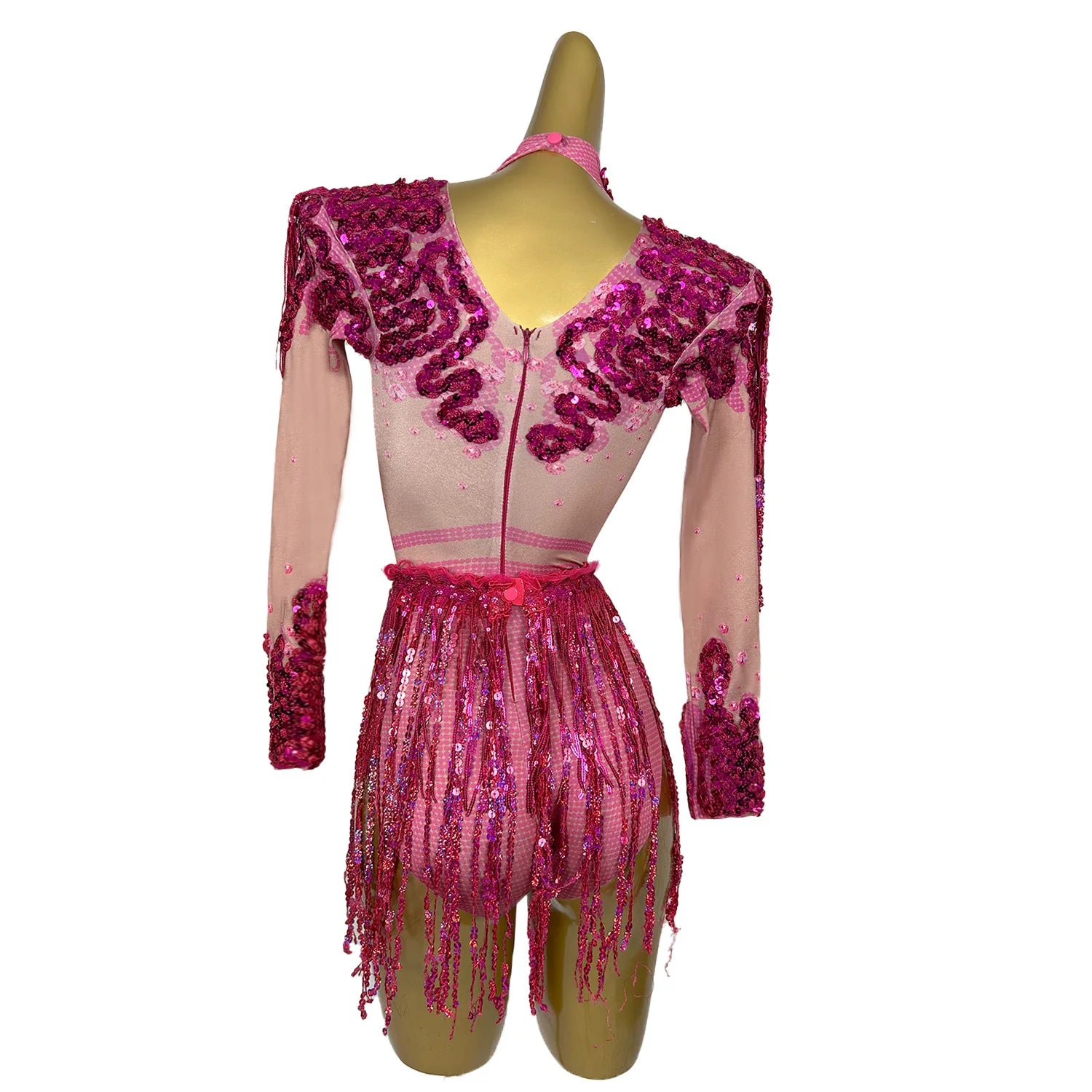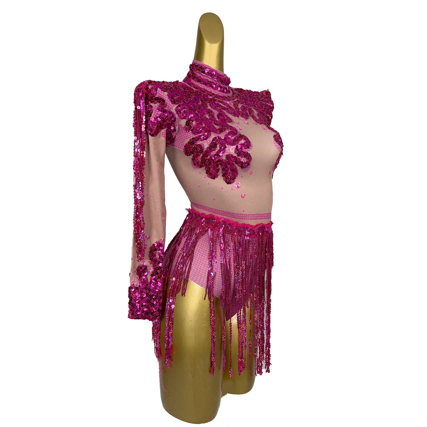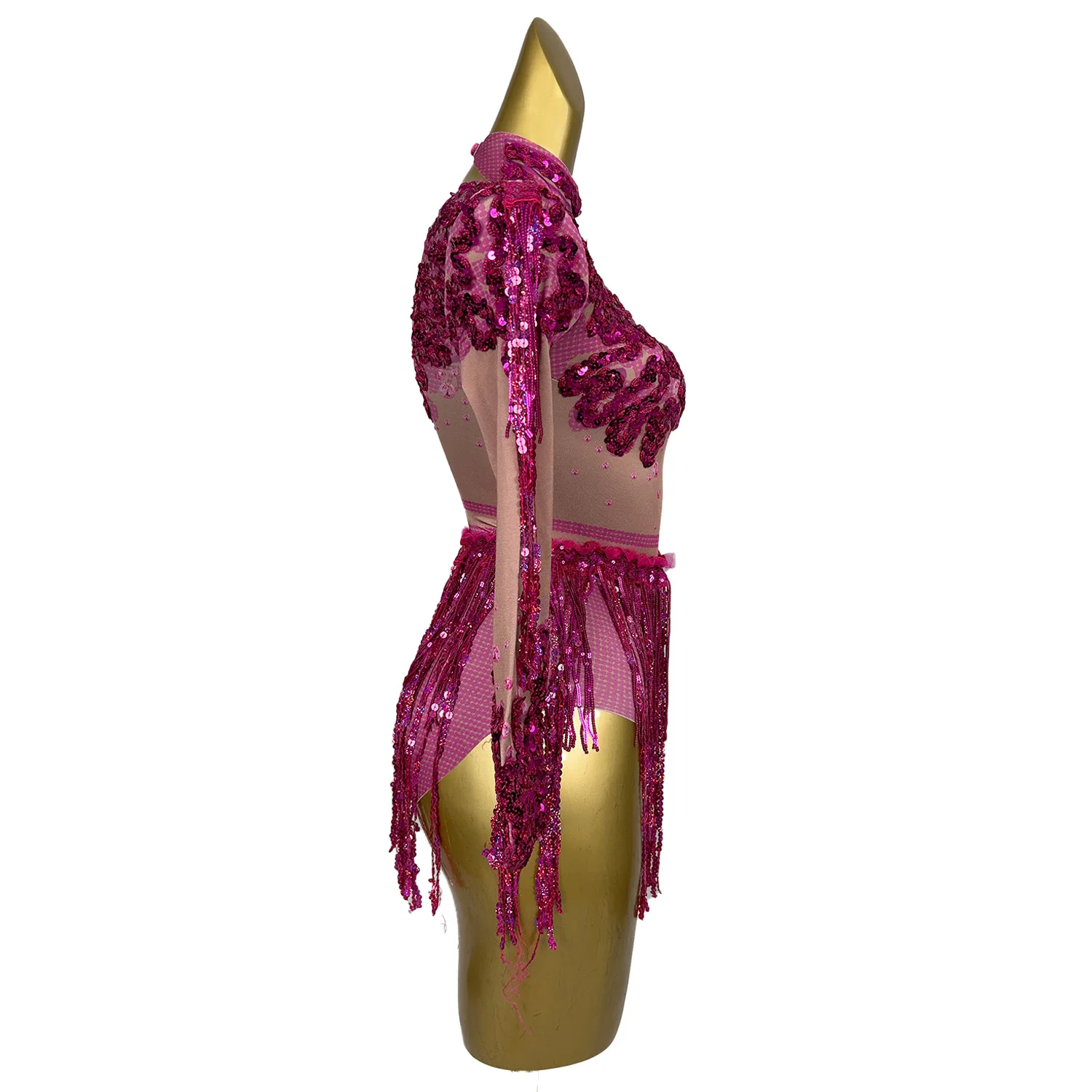 Sparkly Sequines Tassel Pink Mini Dress for Women 2-Piece Set Fashion Sexy Celebrate Evening Party Dancer Stage Wear Nianiang