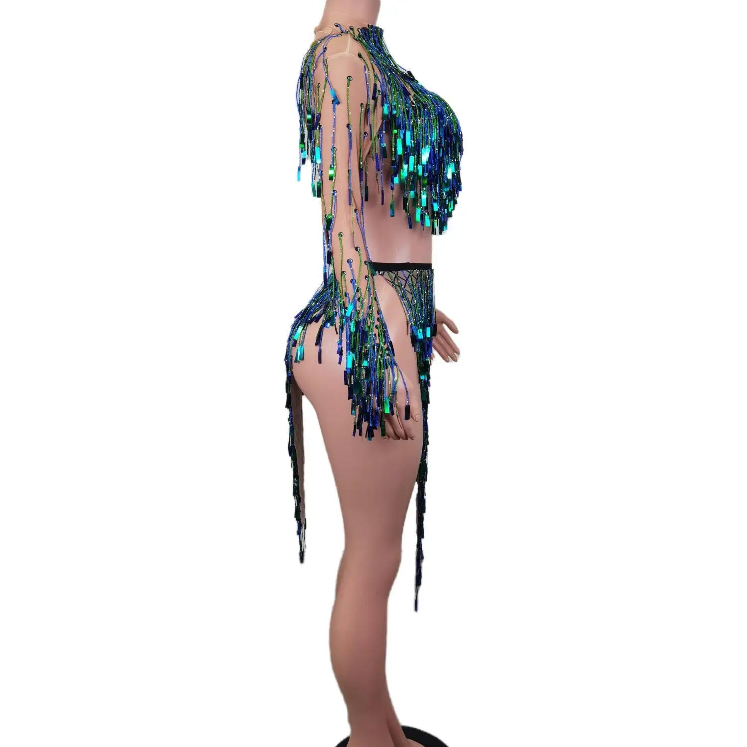 Make a statement in this sparkly sequins top and fringes skirt two-piece set, perfect for club shows, stage performances, and exotic dancewear outfits. The eye-catching sequins and fringes add a touch of glamour and movement, ensuring you stand out on stage or on the dance floor. This outfit is designed to make you feel confident and sexy, giving you the perfect ensemble to showcase your style and captivate the audience. Get ready to dazzle in this show-stopping costume that exudes confidence and allure.