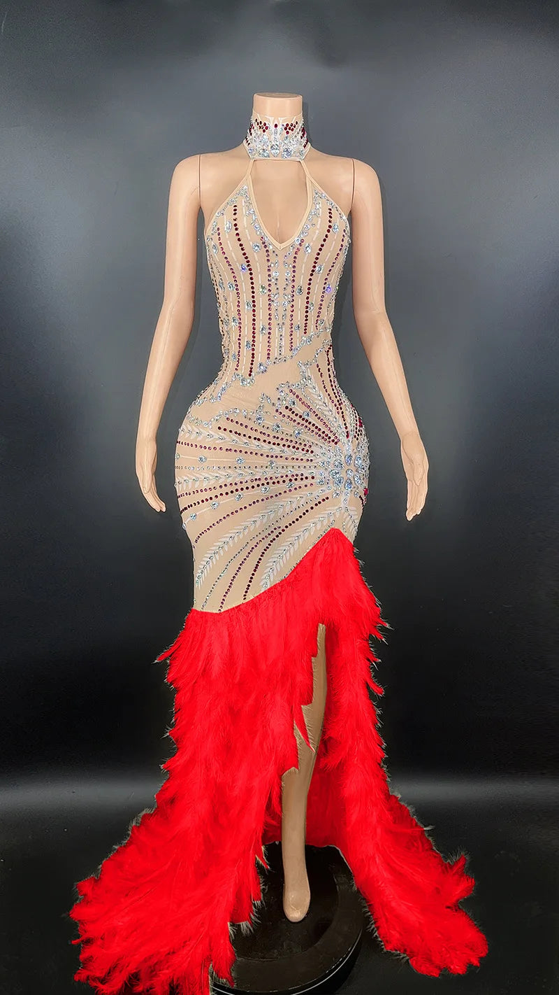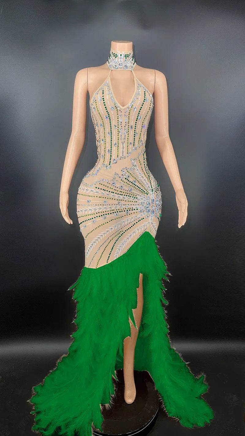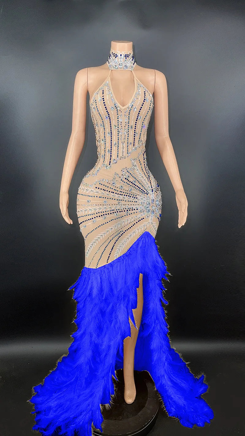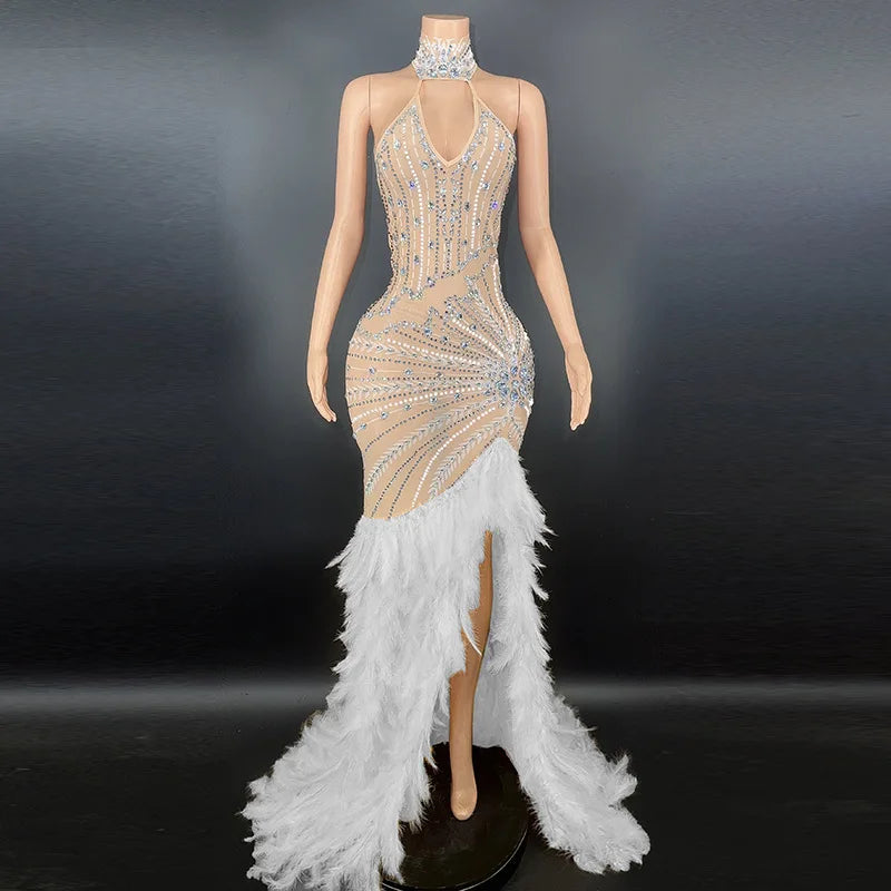 This stunning long dress is adorned with sparkly silver rhinestones and features feather embellishments, creating a luxurious and eye-catching look. The transparent fabric adds an element of allure, making it an ideal choice for evening events, birthday celebrations, and costume parties. This dress is designed to make a statement and is perfect for those looking for a glamorous and striking ensemble.