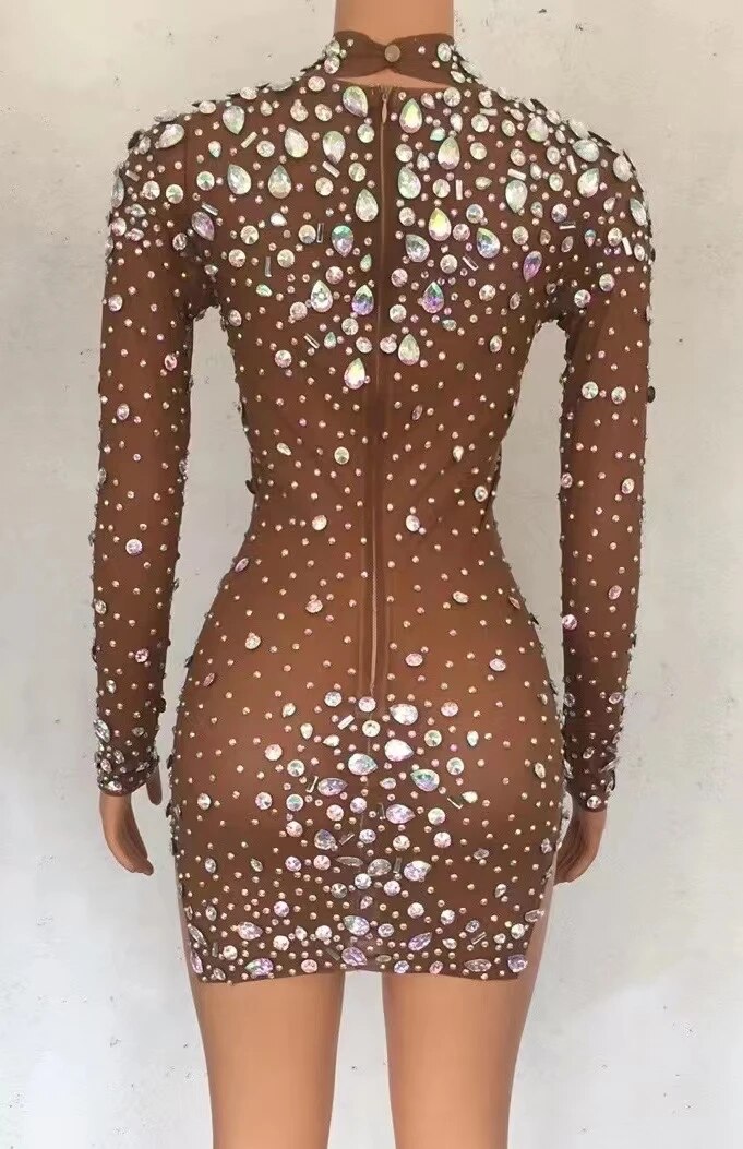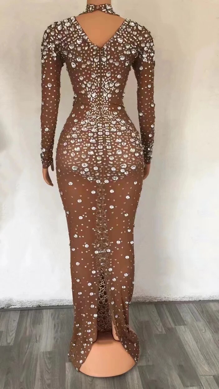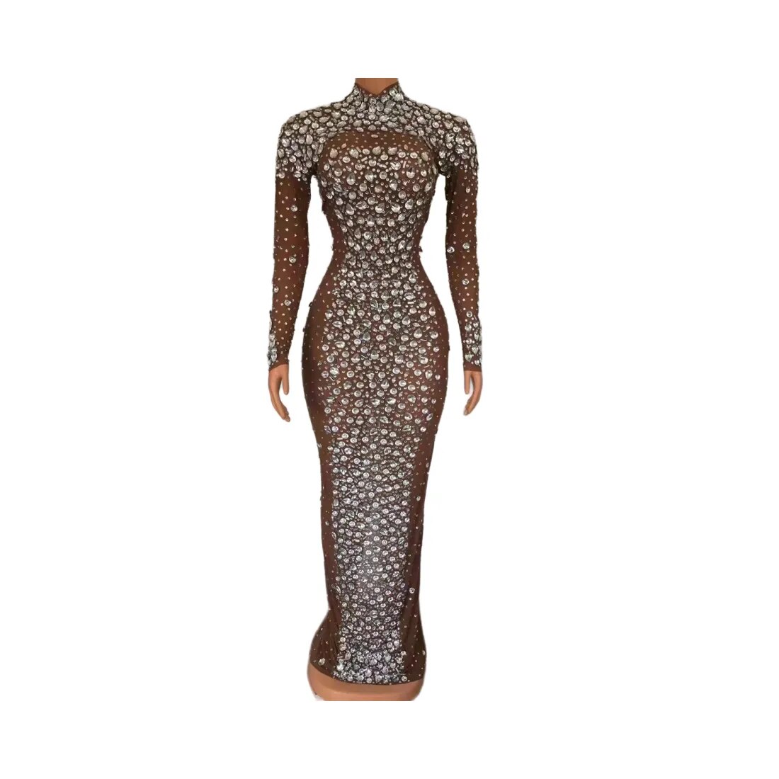 Sparkly Silver Big Rhinestone Transparent LongDress Evening Birthday Celebrate LuxuriousCostume Dancer Flashing Dress