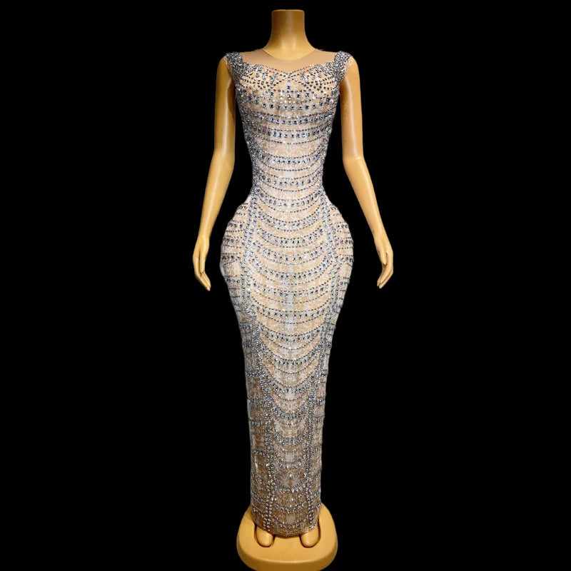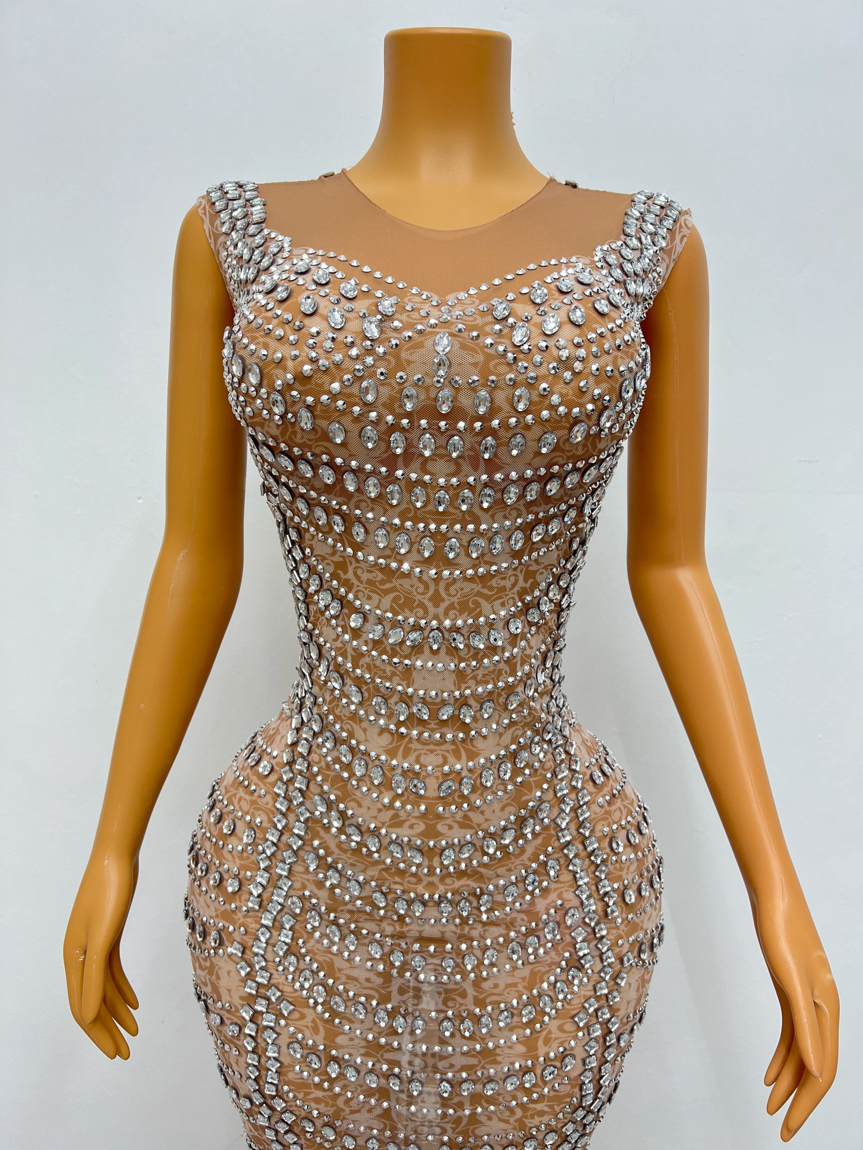Shine and dazzle in this stunning sleeveless dress! Adorned with sparkly silver crystals and a transparent mesh outfit, this dress is perfect for evening events, birthday celebrations, and performances. The lace pattern adds a touch of elegance to this eye-catching ensemble.