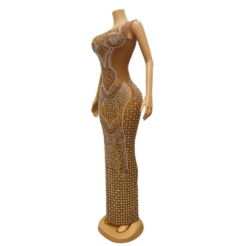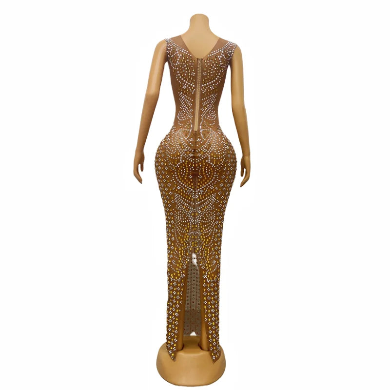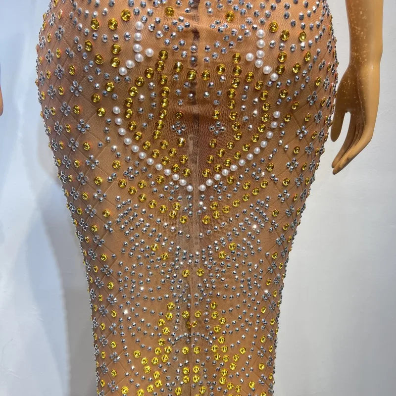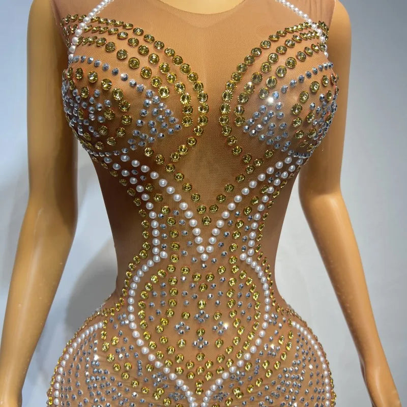 This sleeveless dress is adorned with sparkly silver and gold rhinestones and pearls, creating a glamorous and eye-catching look, perfect for evening events, birthday celebrations, and other special occasions. The sexy mesh nude costume design adds an alluring touch to this outfit.