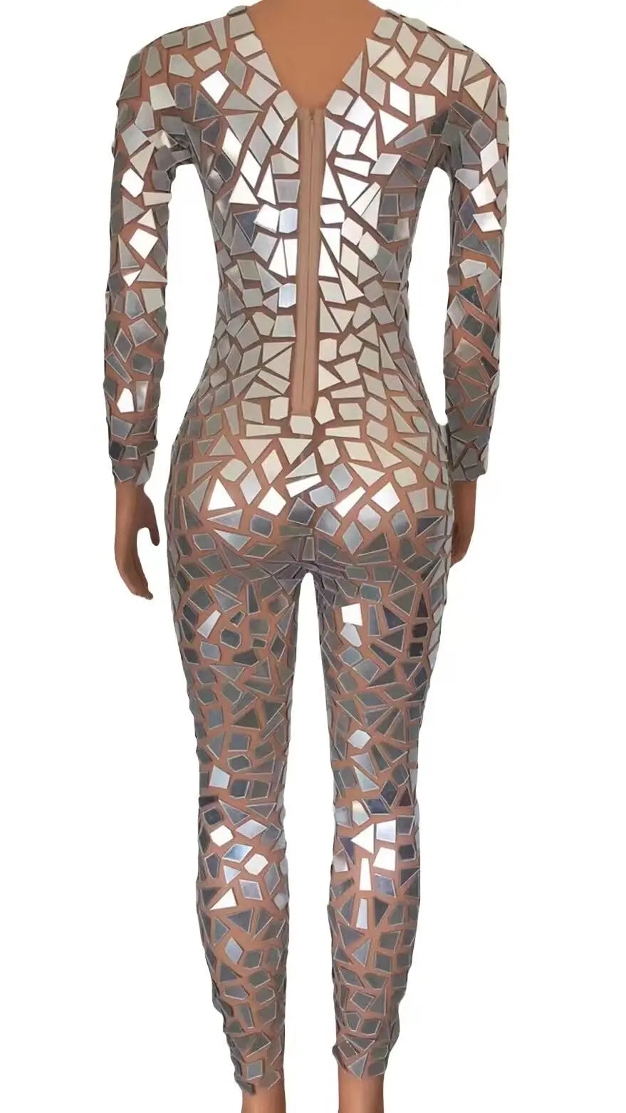 Dazzle on the dance floor with this Sparkly Silver Mirrors Transparent Jumpsuit. This sexy costume is perfect for birthday celebrations and dance performances. The bodysuit leggings are designed to make you stand out and feel fabulous as you celebrate in style.
