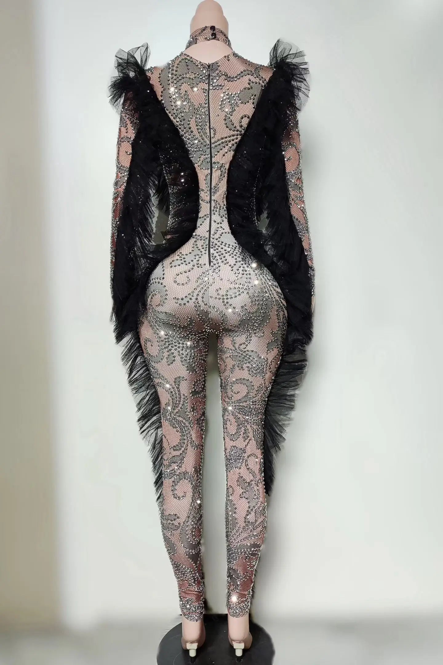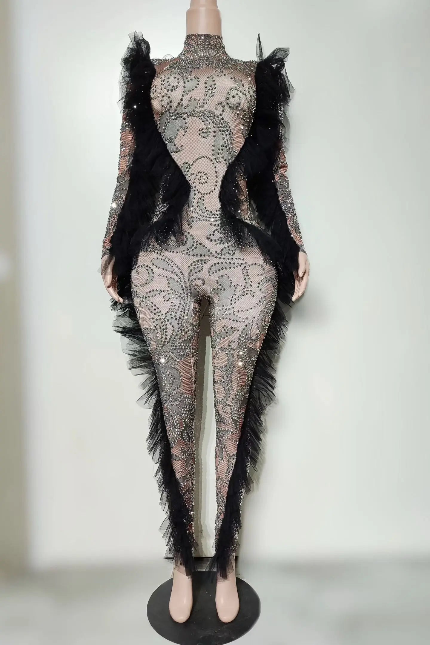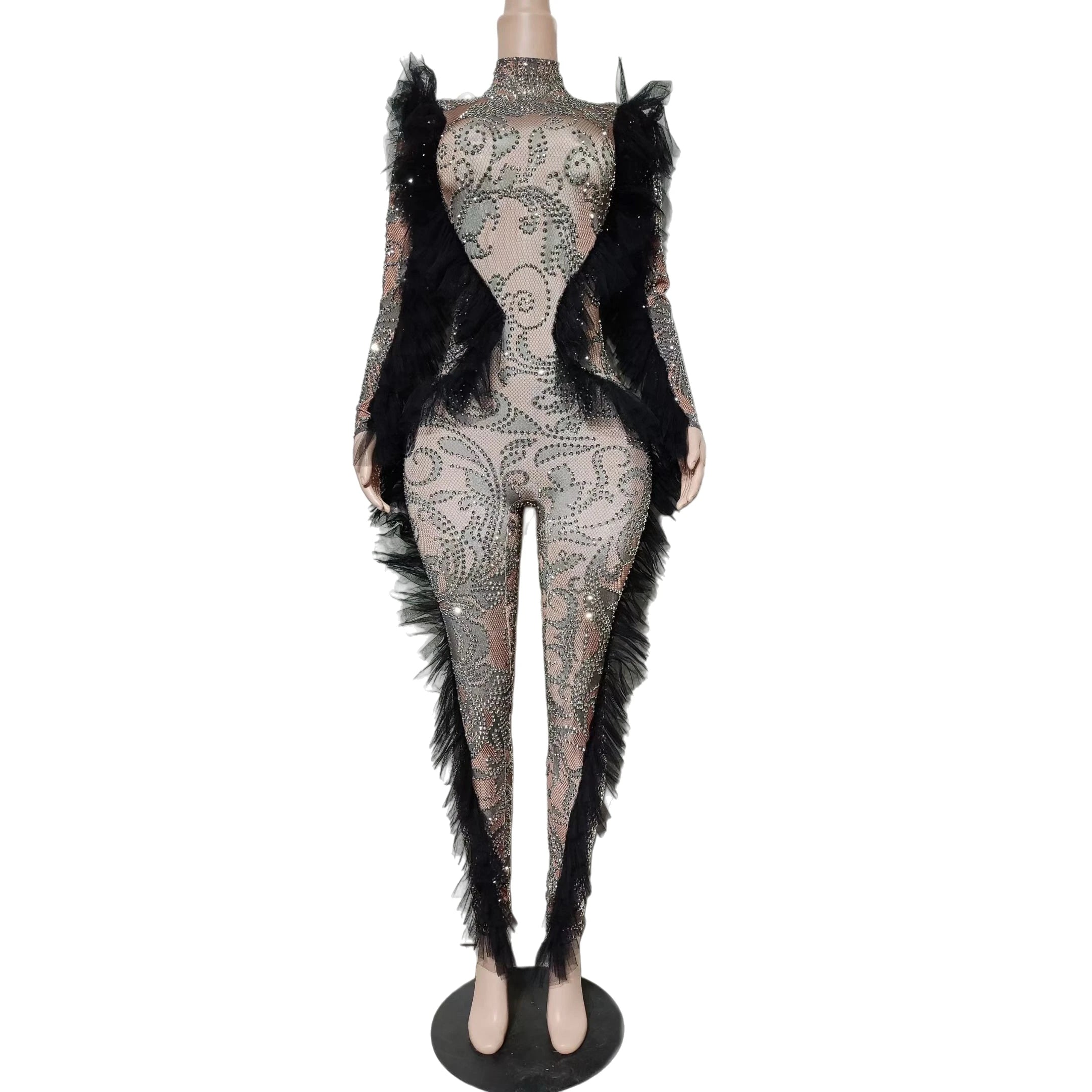 Sparkly Silver Rhinestone Black Mesh Tight Fitting Jumpsuit Women Spandex Elastic Club Party Drag Queen Performer Wear