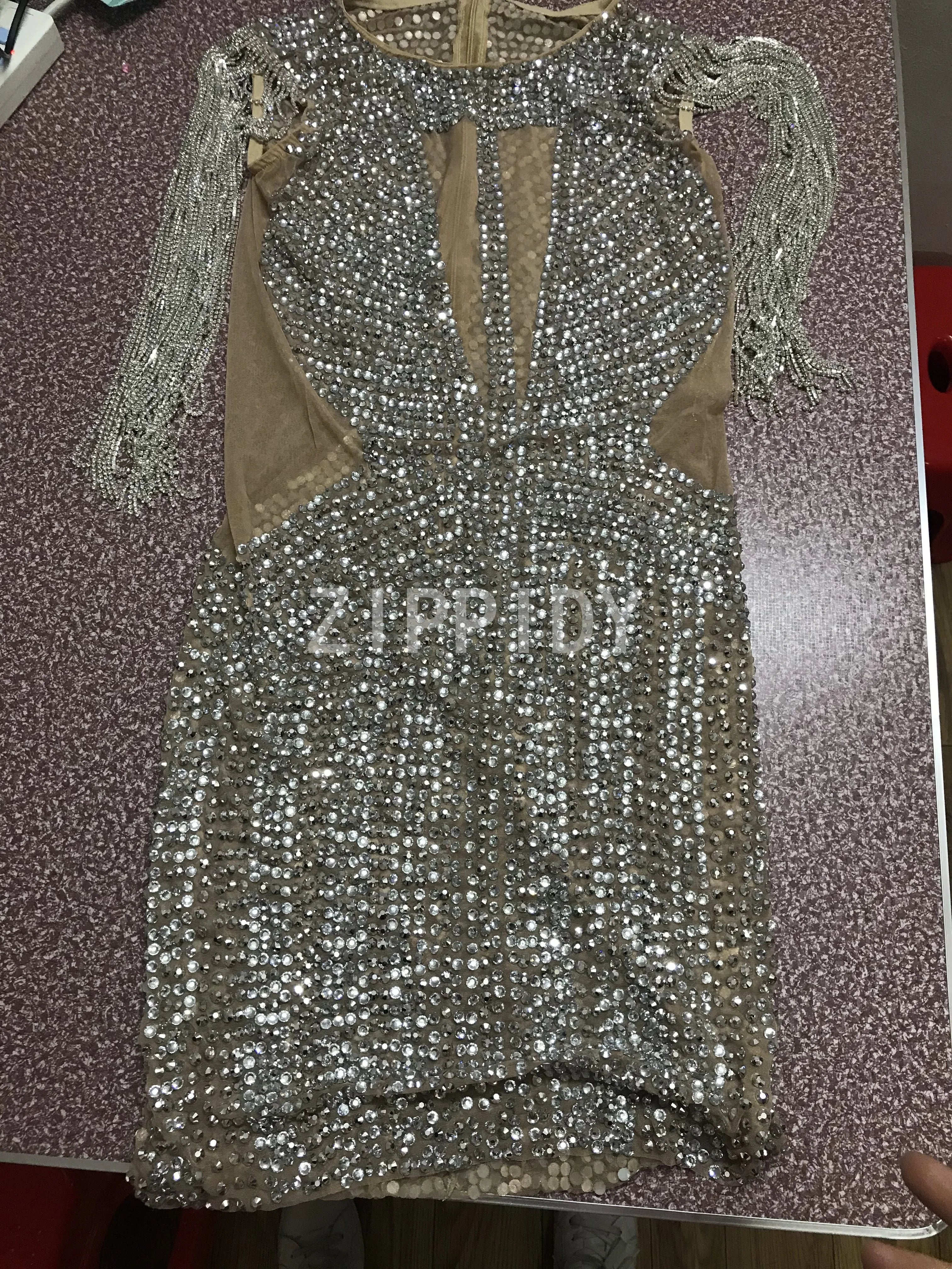 Sparkly Silver Rhinestone Fringe Transparent Short Dress Birthday Celebrate Chain Shoulder Outfit Women Dancer Evening Dress