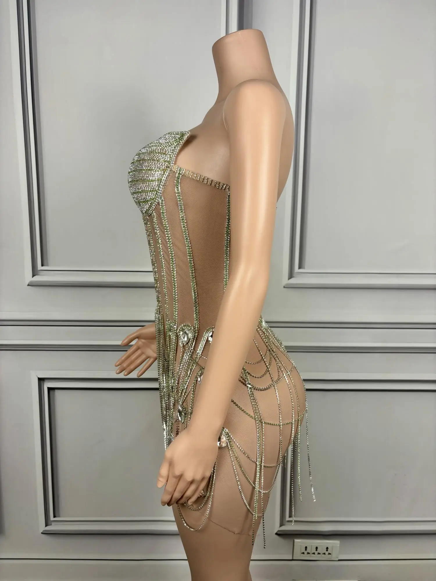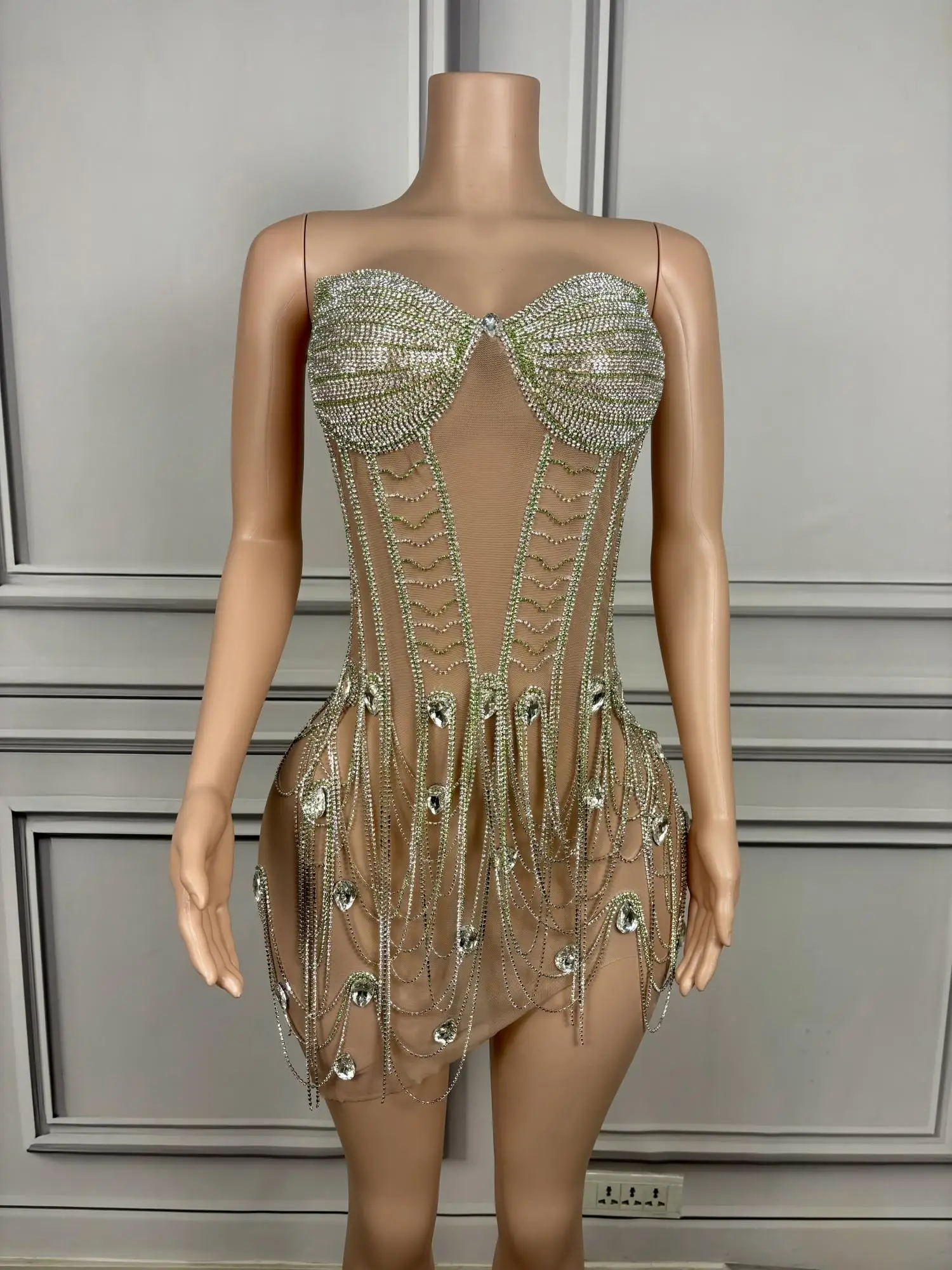 Sparkly Silver Rhinestones Fringe Transparent Dress for Women's Birthday Celebrate Mesh Outfit Bar Dancer Prom Gowns
