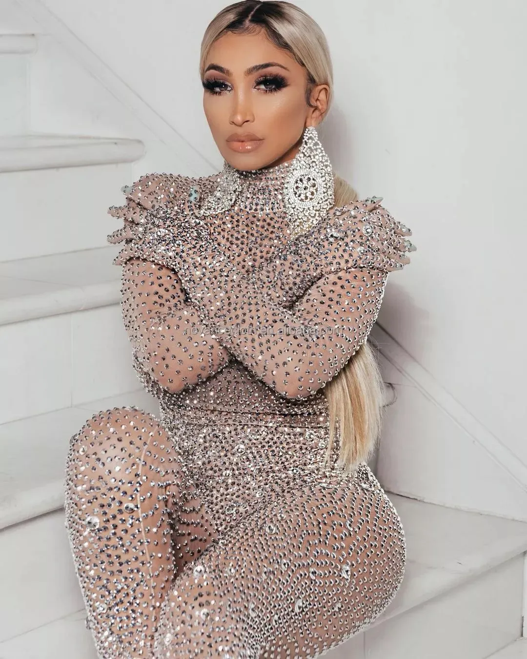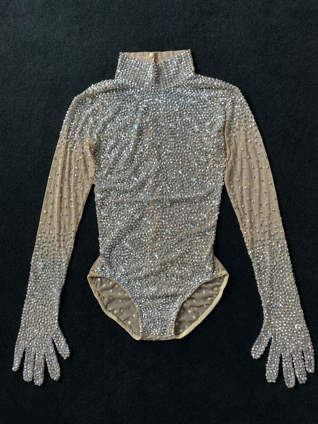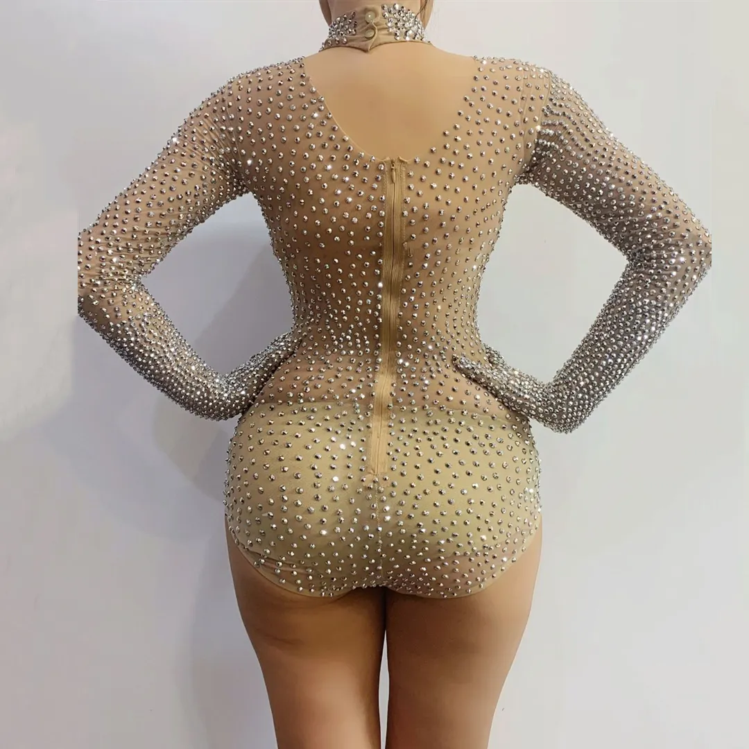 Sparkly Silver Rhinestones Leotard Women Birthday Nightclub Party Outfit Sexy Dance Bodysuit Performance Show Stage Wear