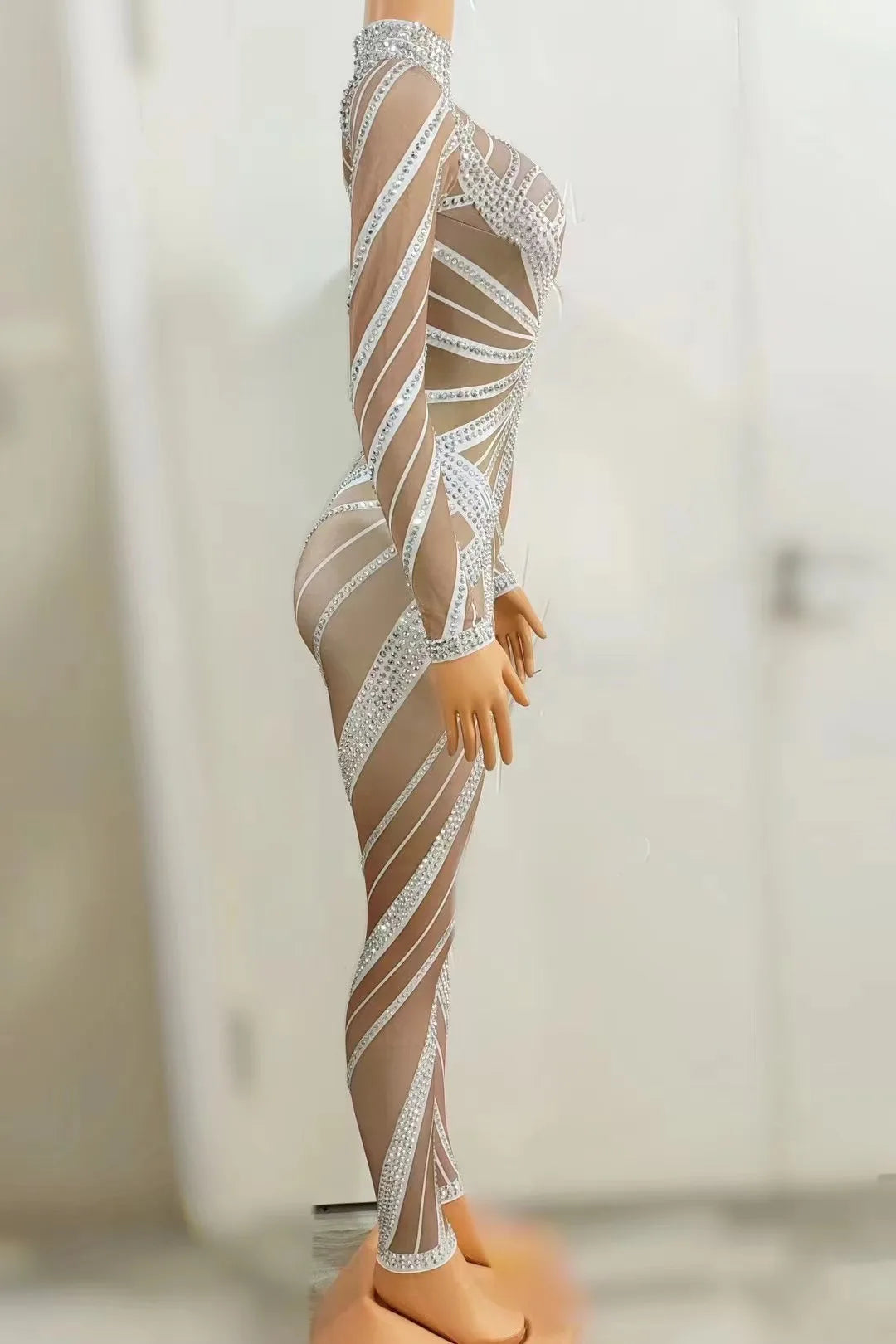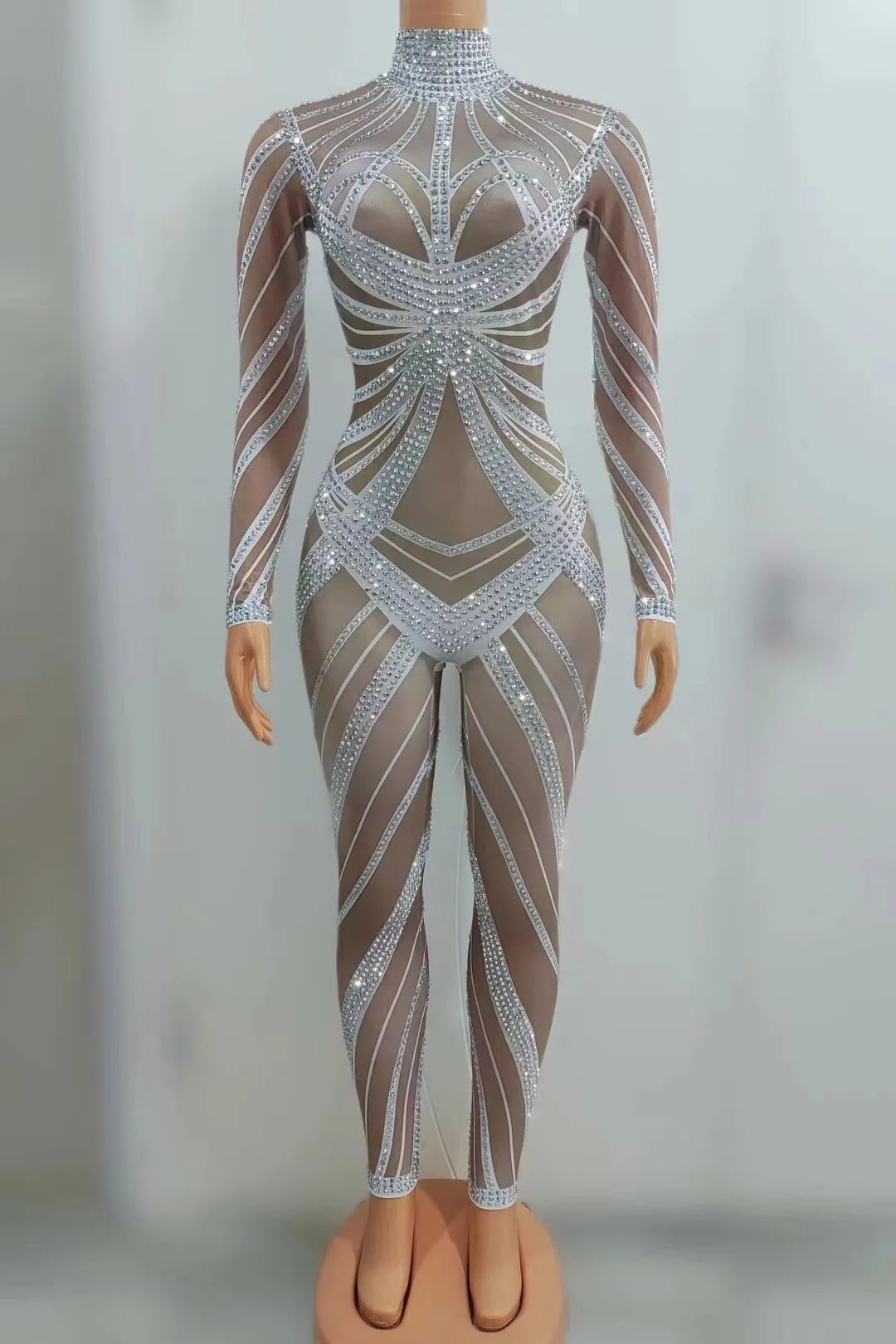 - Steal the show in our Sparkly Silver Rhinestone Stretch Jumpsuit. Designed for performers and party-goers, this sexy jumpsuit features hand-applied rhinestones across a shimmering silver stretch fabric that sculpts your silhouette while allowing full freedom of movement. Ideal for nightclub dancers, singers, and photoshoots, the piece offers a secure fit with reinforced seams and a hidden zipper. Pair with statement heels and bold makeup for an unforgettable look.