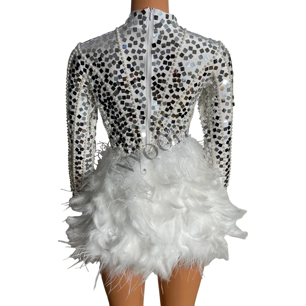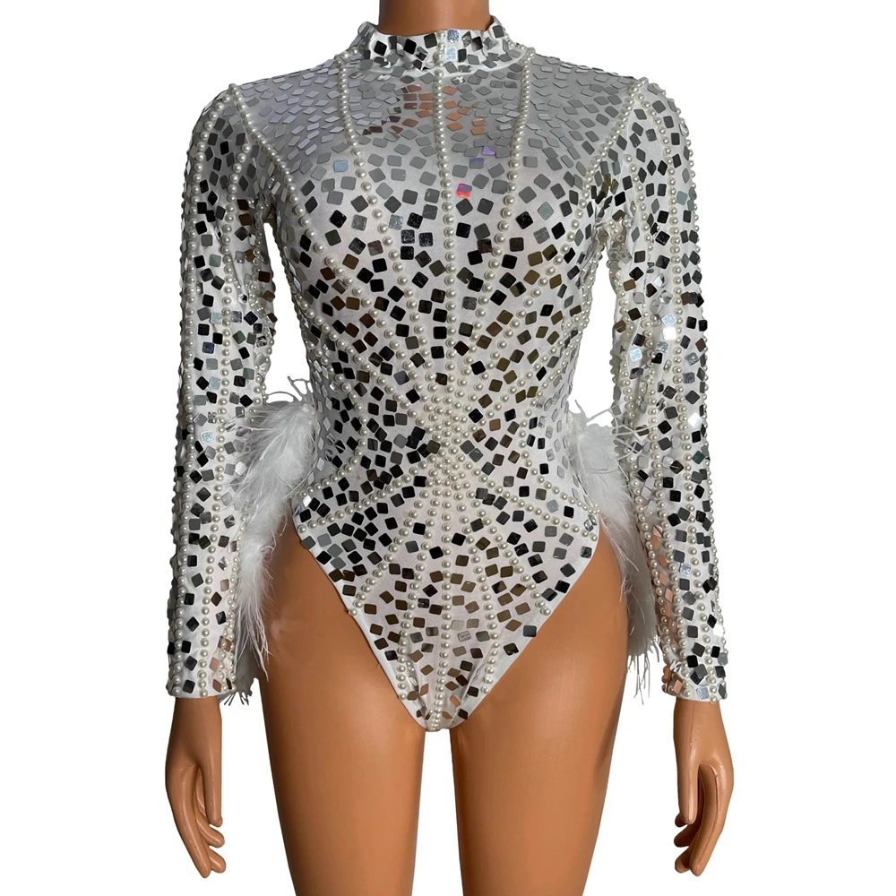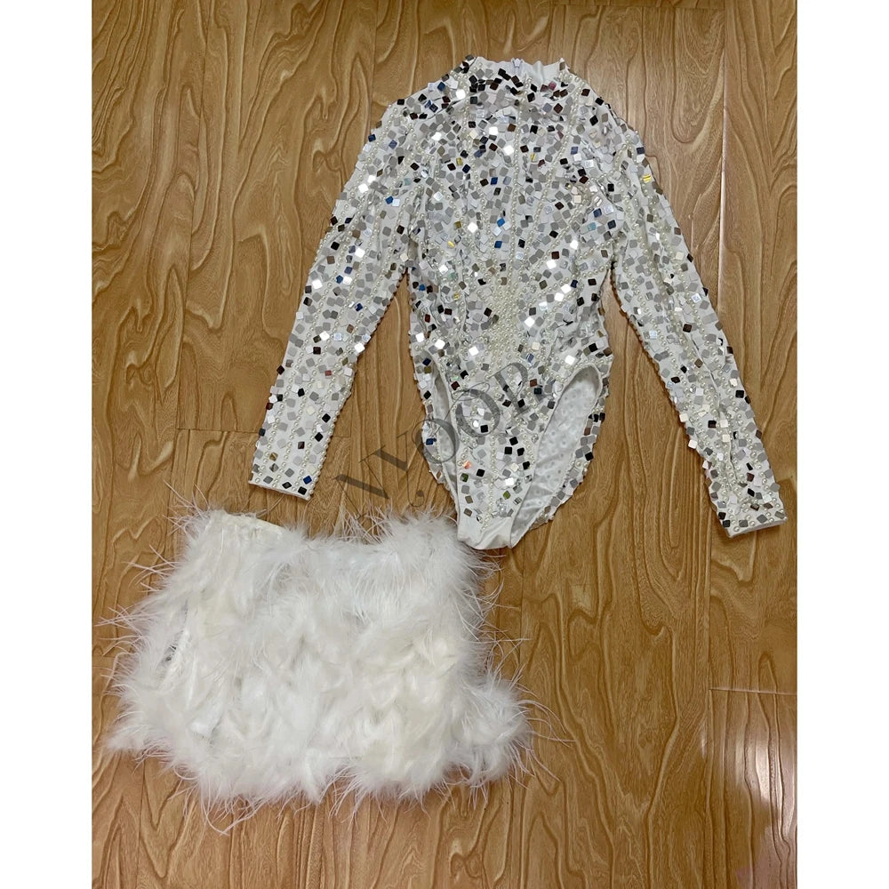 Step into the spotlight with our Sparkly Silver Sequins and Pearl White Feathers Bodysuit 2 PCS Set. This luxurious women's outfit combines eye-catching silver sequins with elegant pearl white feathers, making it an ideal choice for nightlife and performance settings. Perfect for dance costumes and stage wear, this sexy ensemble ensures you’ll stand out at any event. Elevate your look and exude confidence with this stunning costume that shines with every movement!