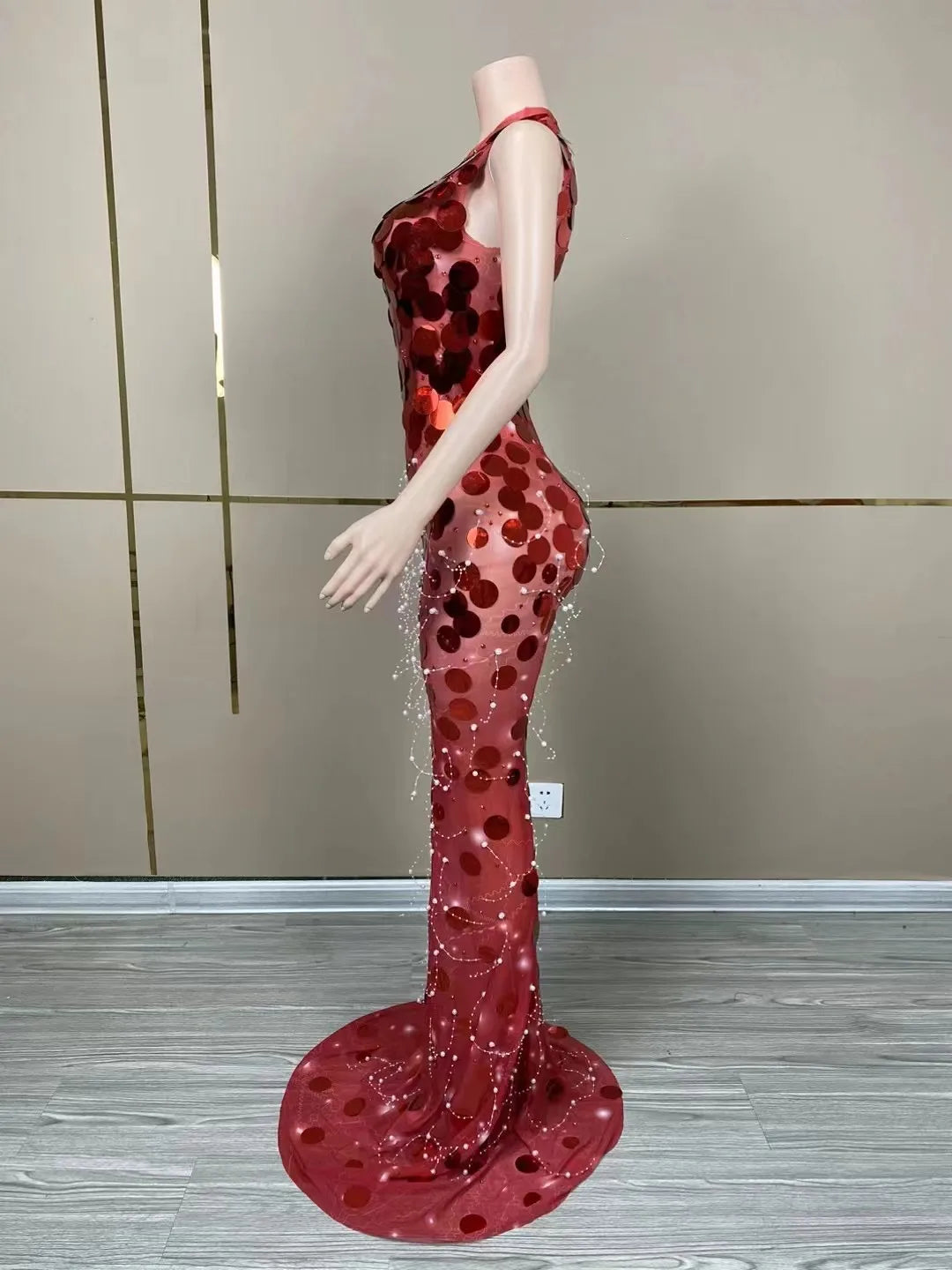 Sparkly Sleeveless Floor Length Round Sequins Dress Women Singer Birthday Evening Prom Outfit Red Photoshoot Dress