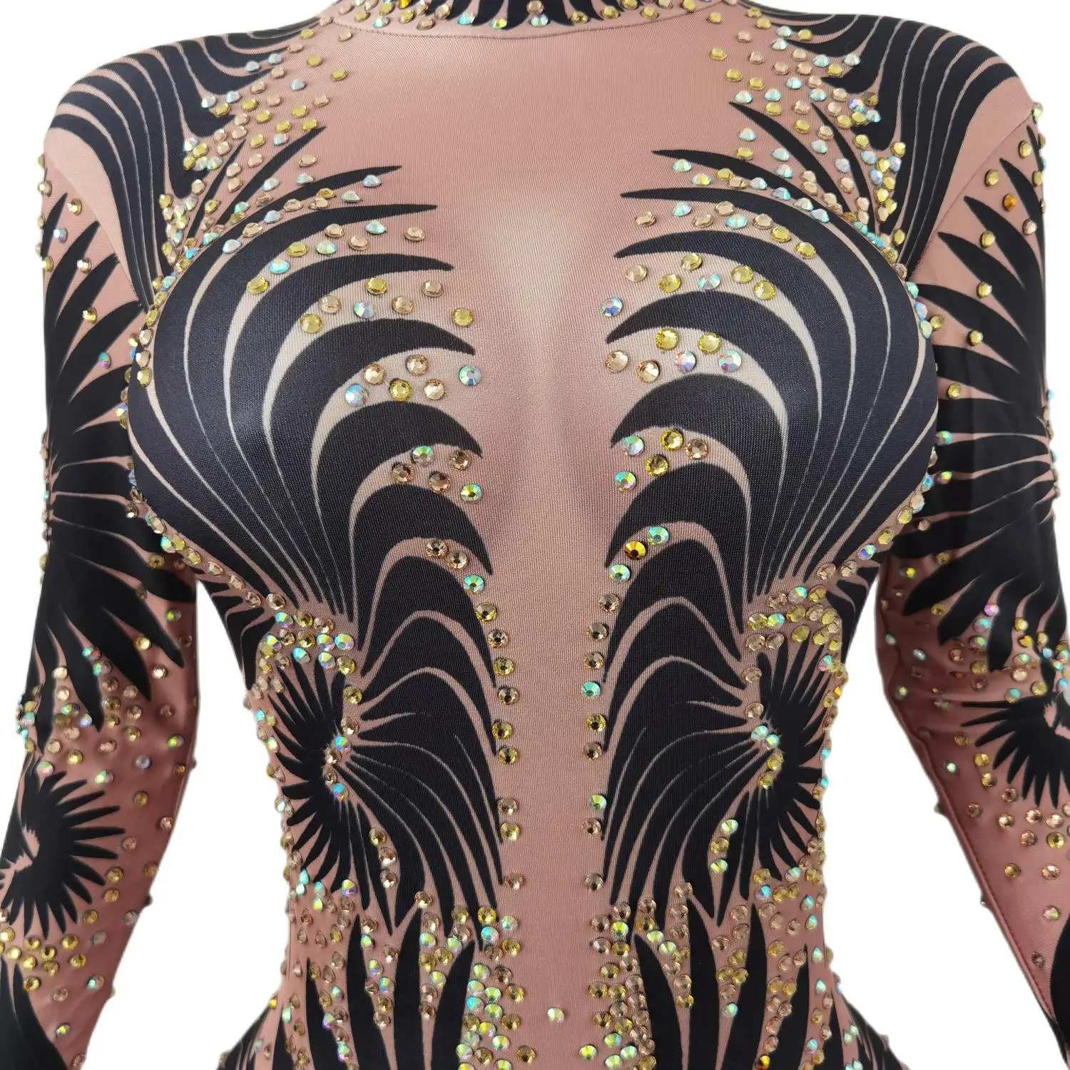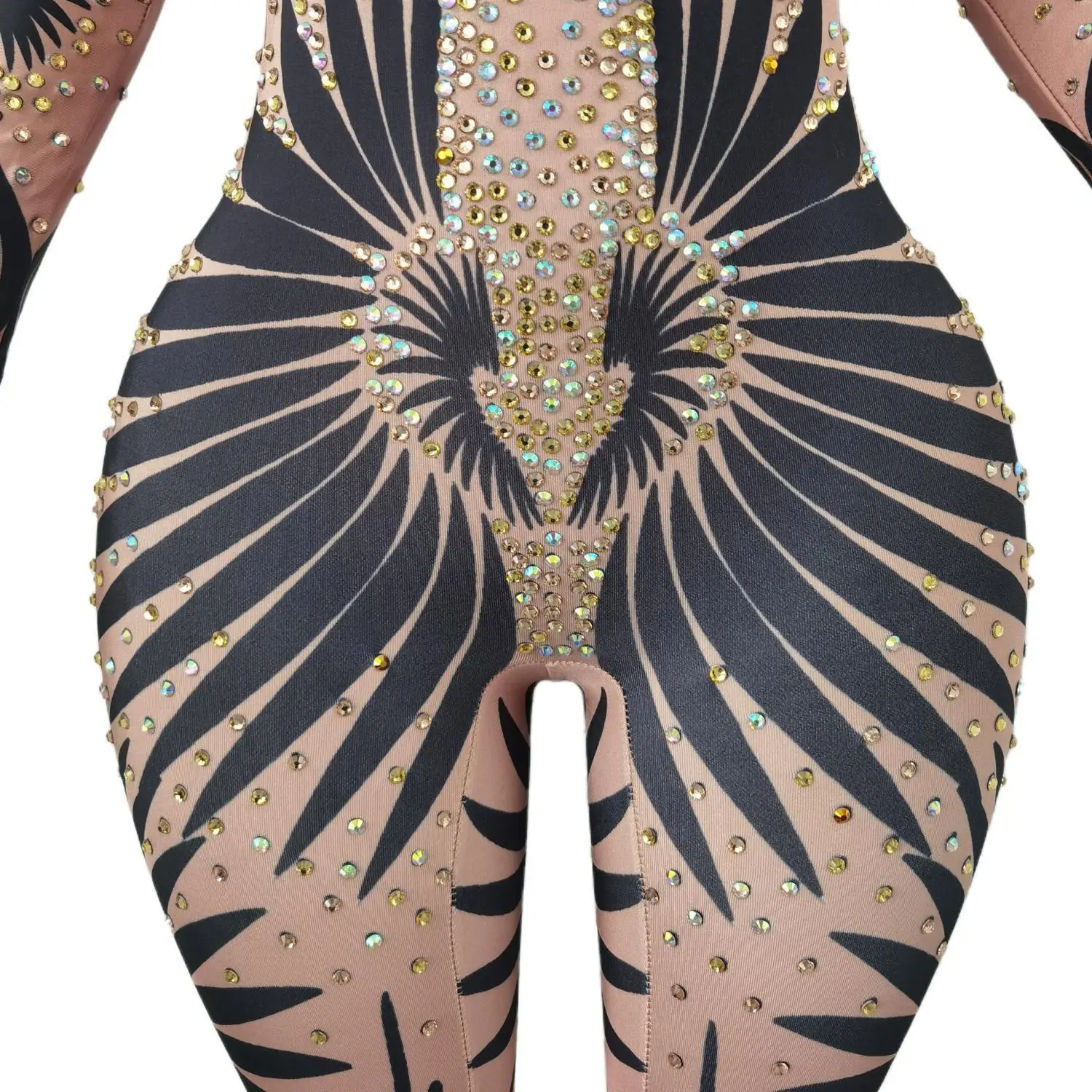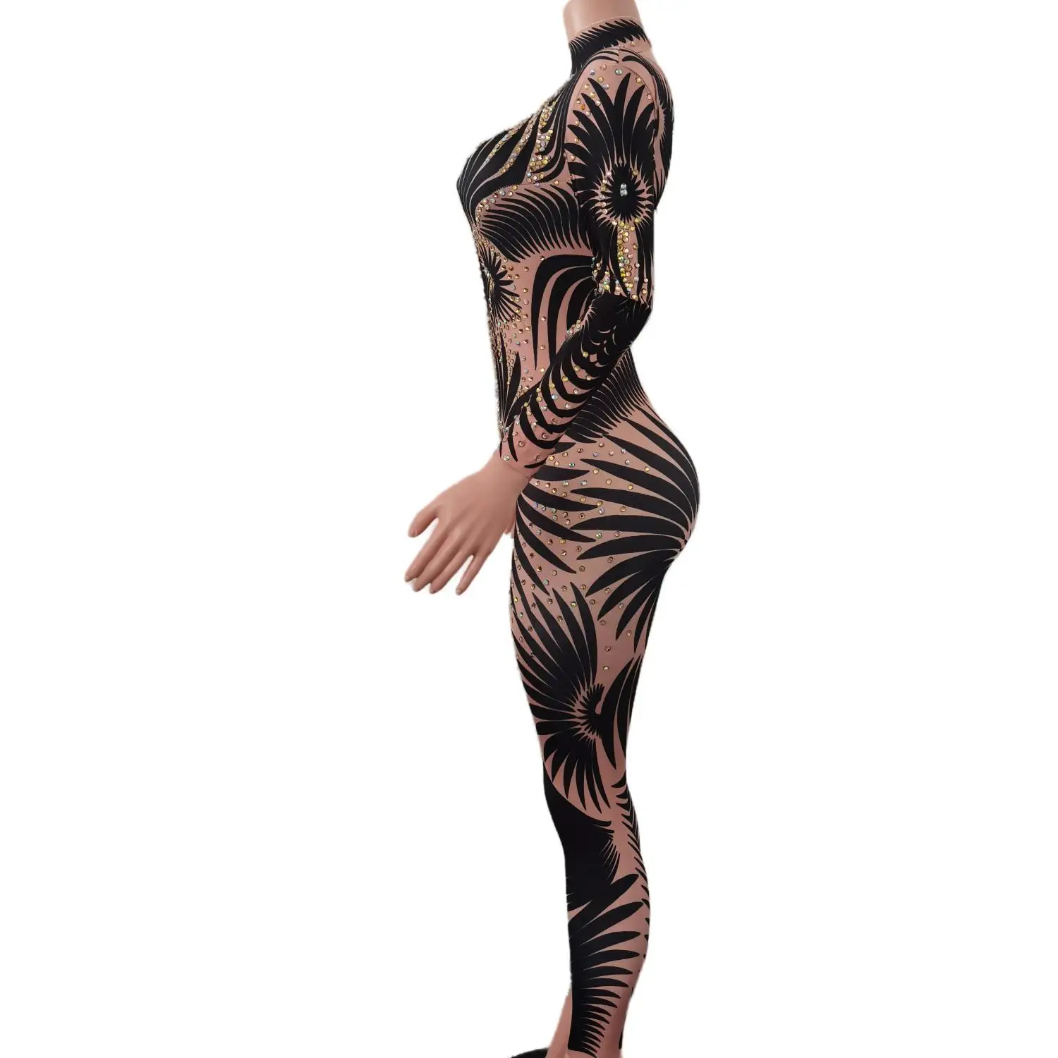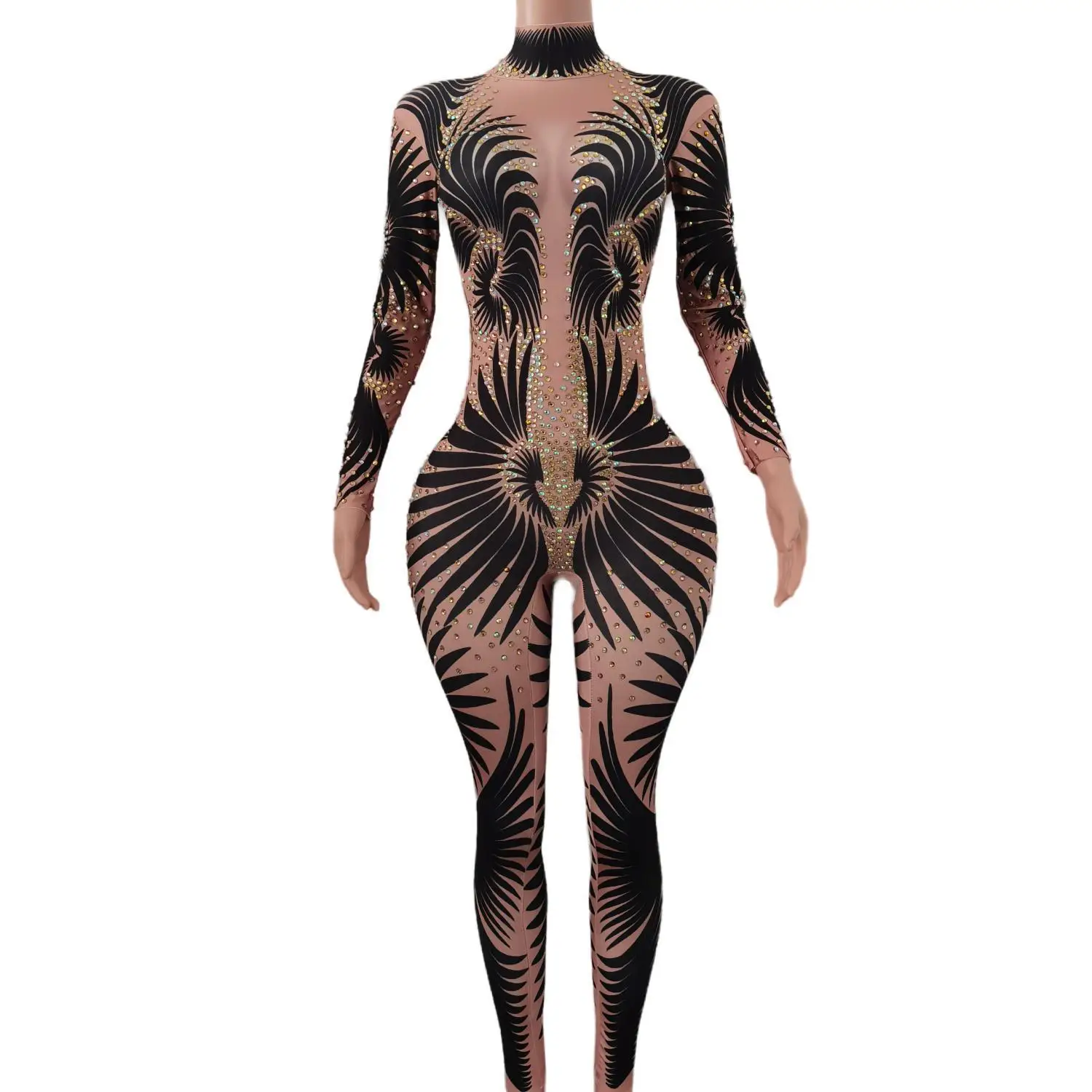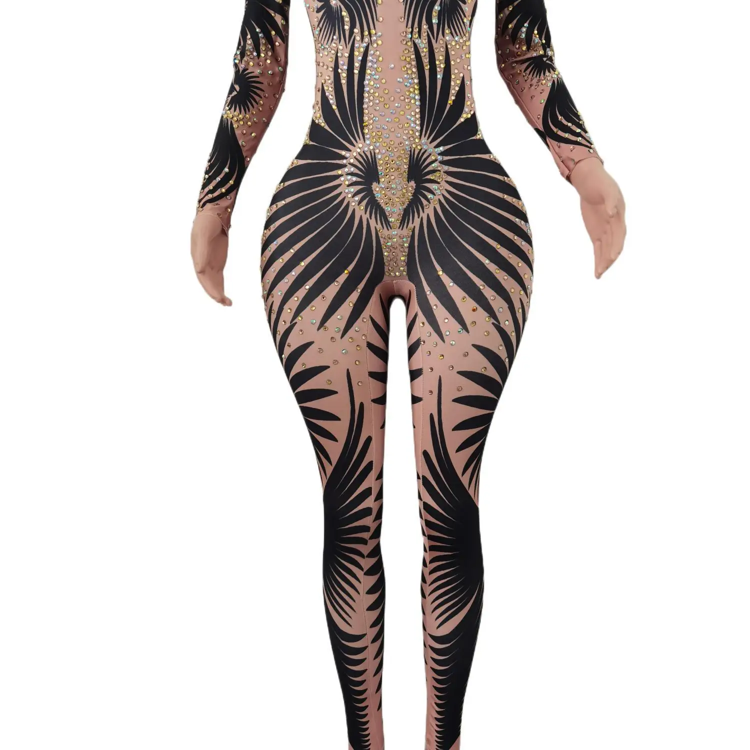 Sparkly Stone Feather Print Jumpsuit Women Sexy Birthday Party Bodysuit Prom Dresses Pole Dancer Performance Costume Feibiao