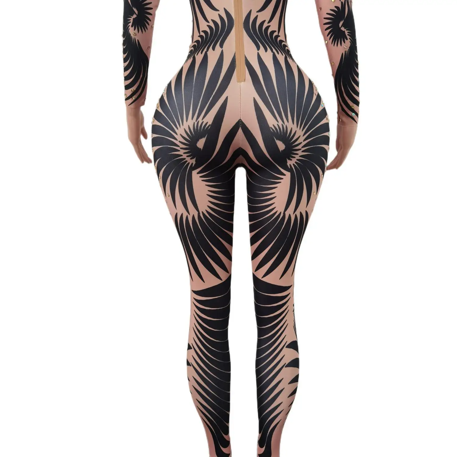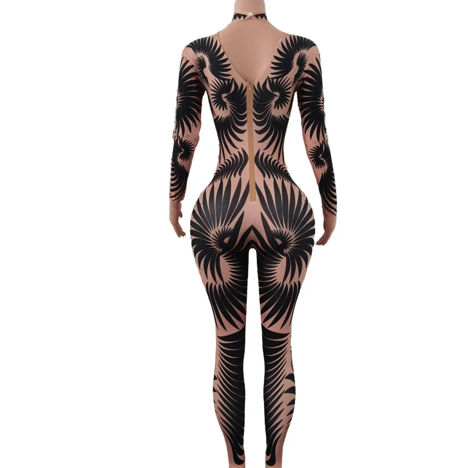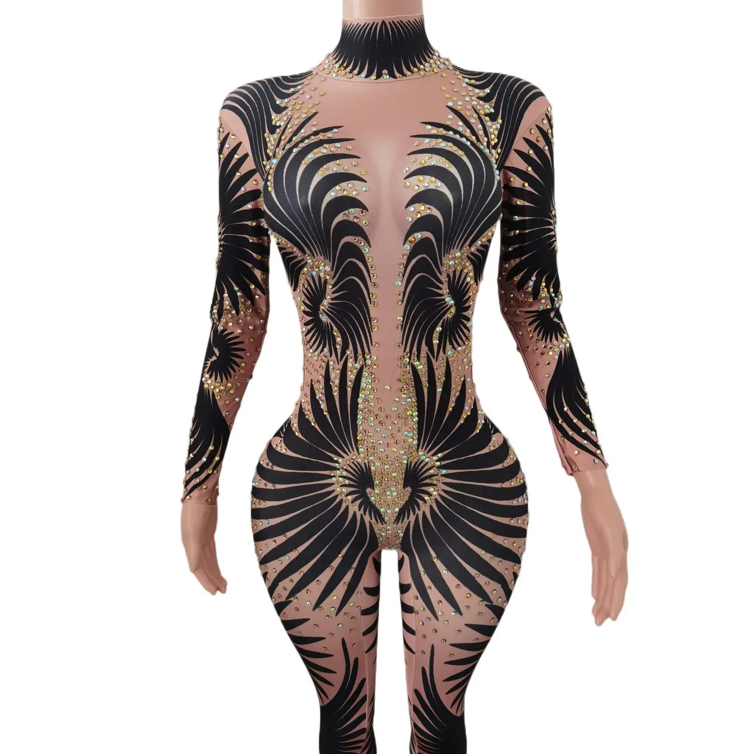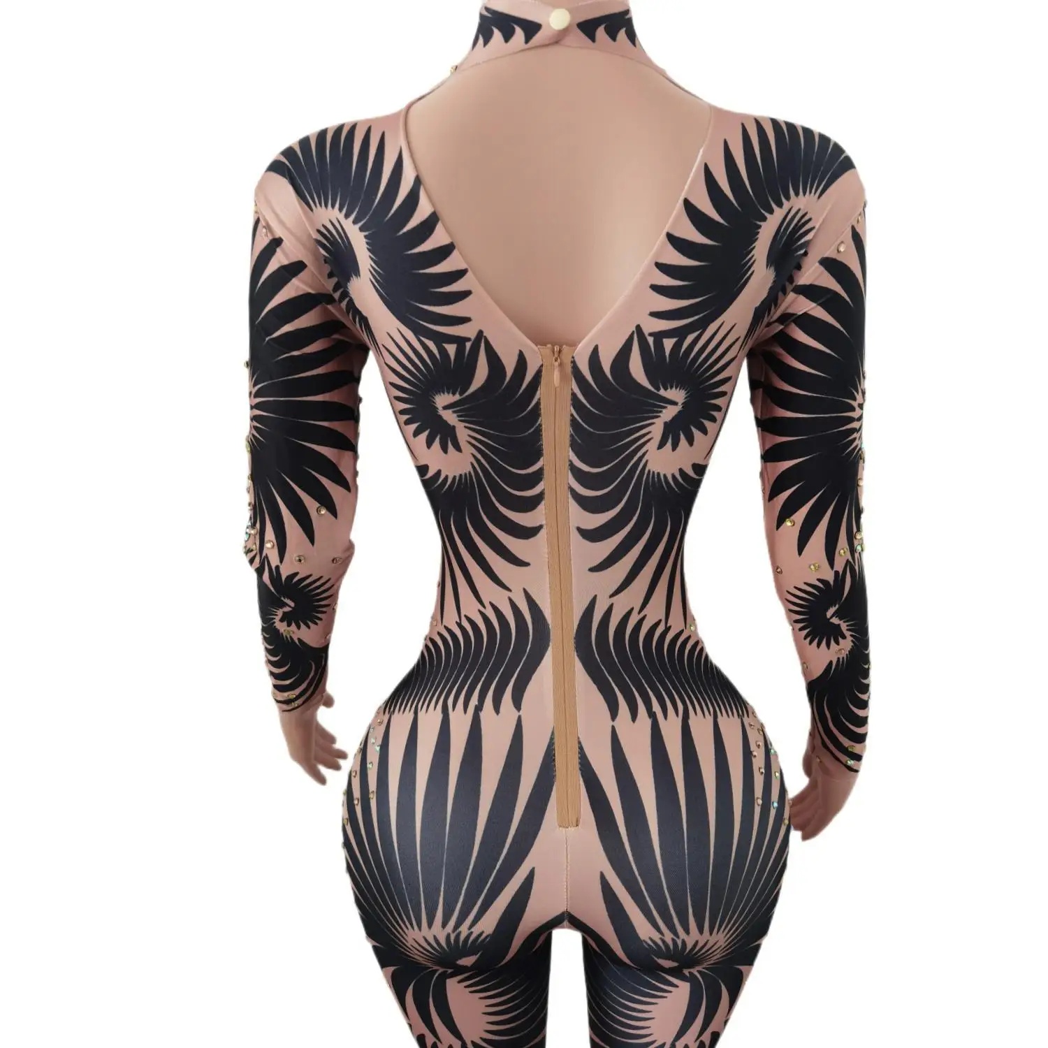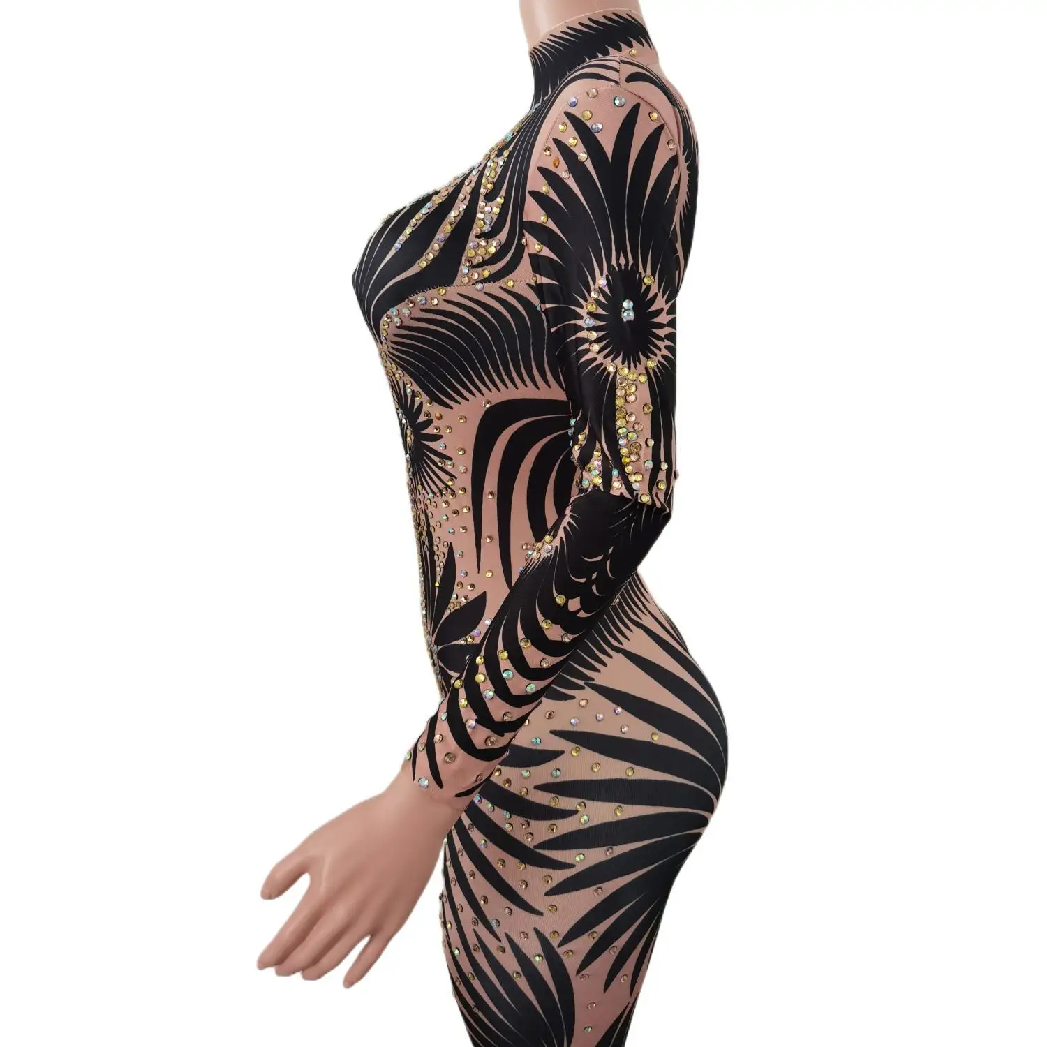 Sparkly Stone Feather Print Jumpsuit Women Sexy Birthday Party Bodysuit Prom Dresses Pole Dancer Performance Costume Feibiao