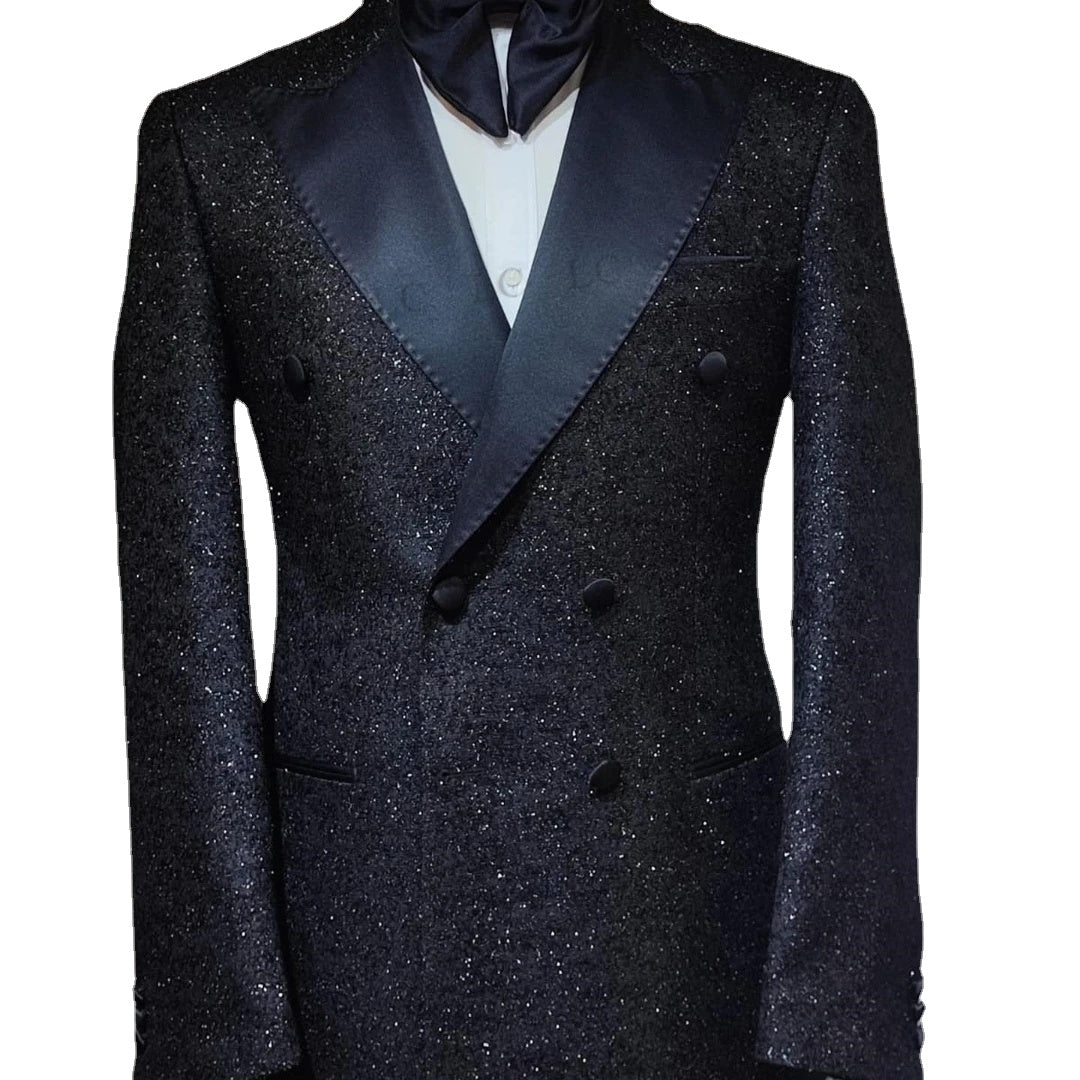 Shine bright in this sparkly 2-piece men's suit set featuring a blazer and pants embellished with beads and satin details. The peaked lapel design adds a touch of elegance, making it suitable for formal events, workwear, parties, weddings, and groom attire. Available in plus sizes and tailored for a perfect fit.