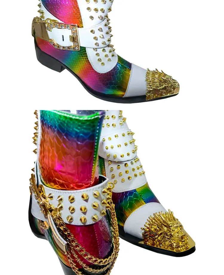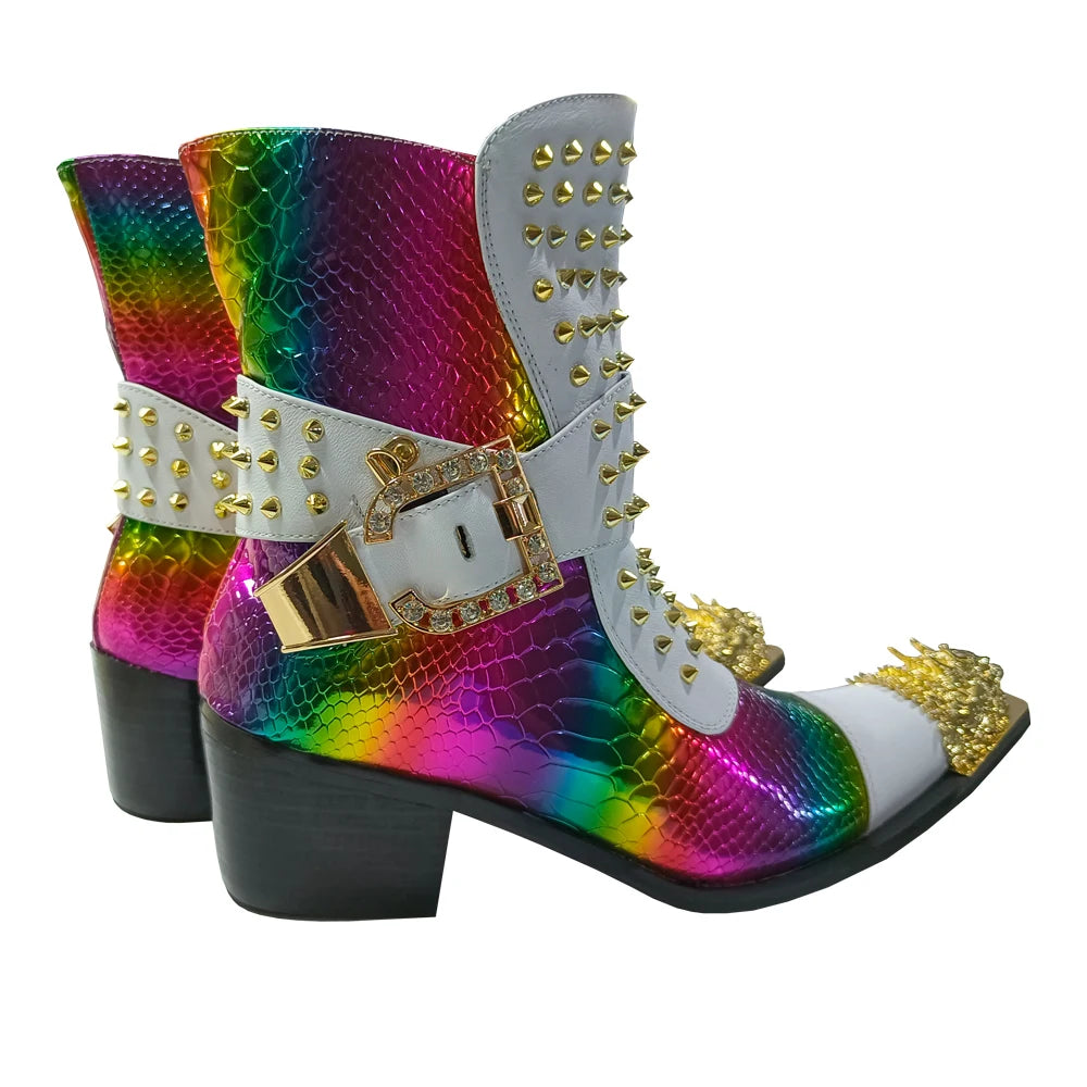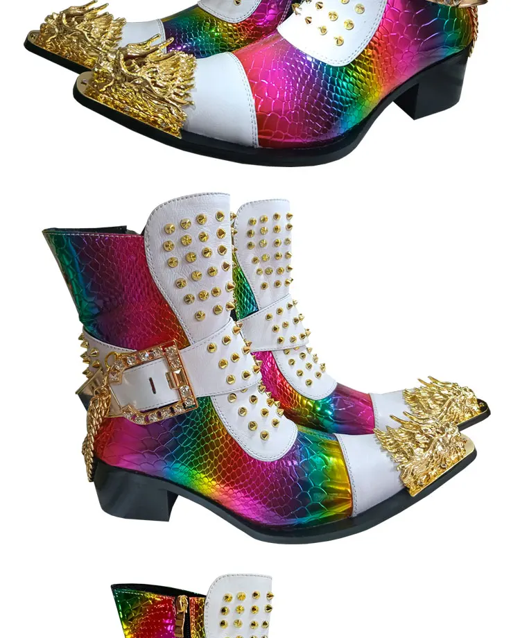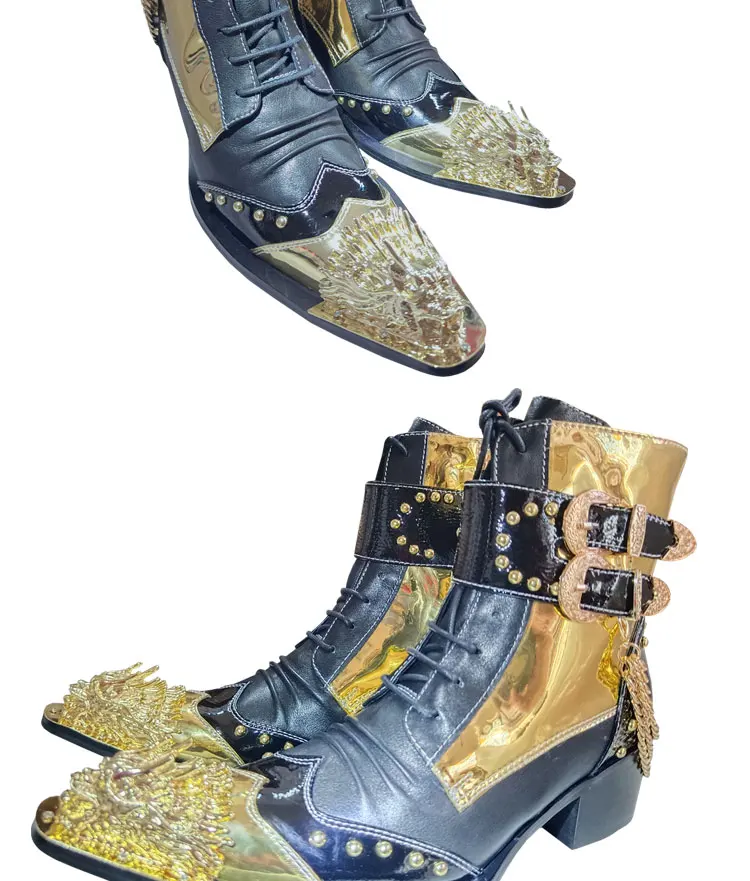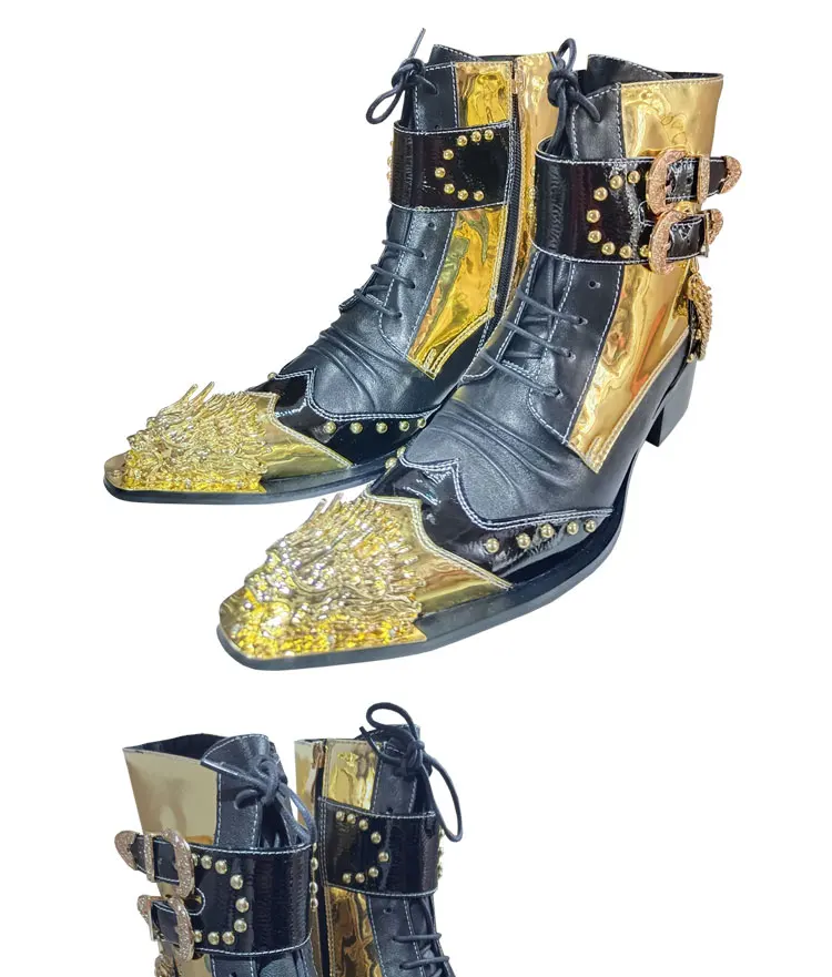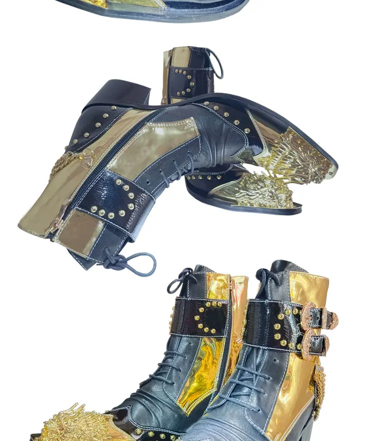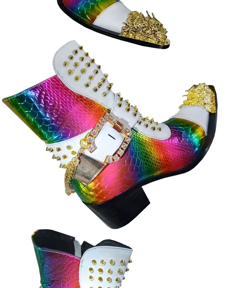Spring High Heel Men's Boots Pointed Rivet Belt Buckle Genuine Leather Model Catwalk Luxury Increase Social Contact High Boots