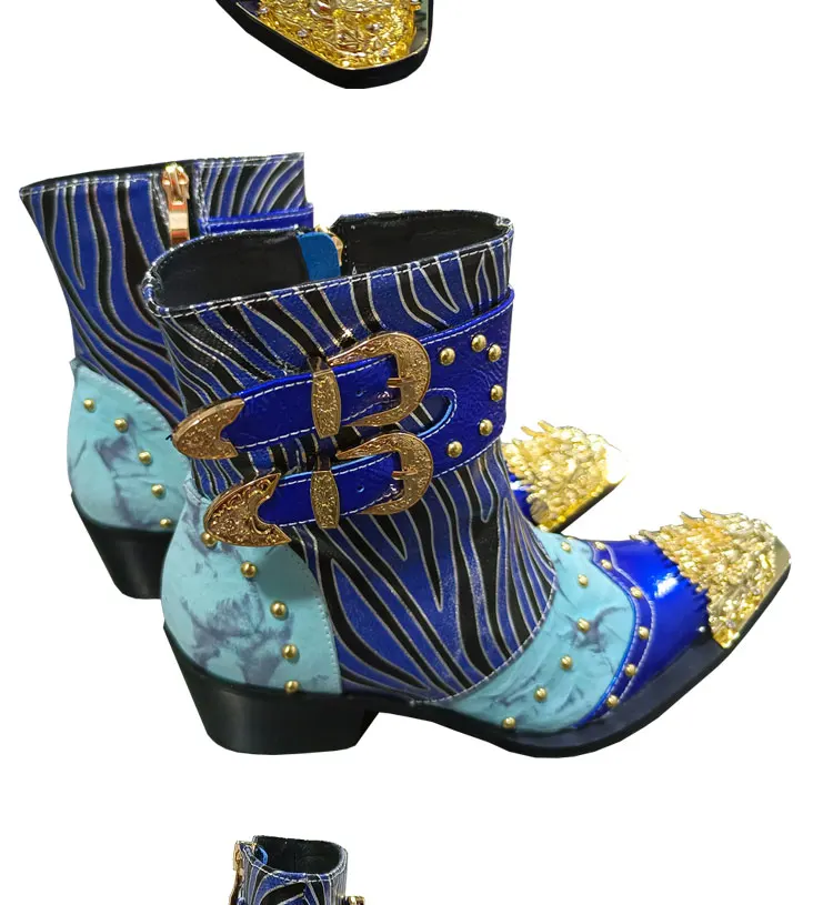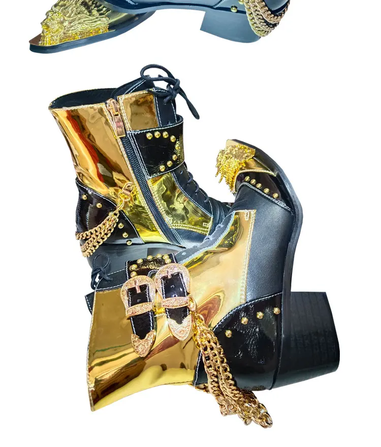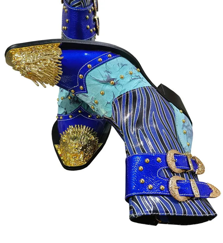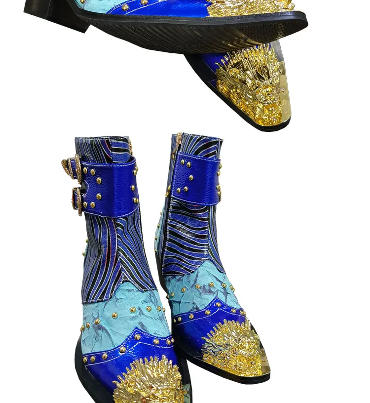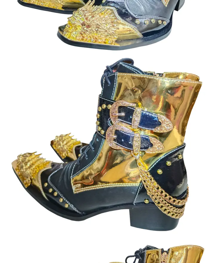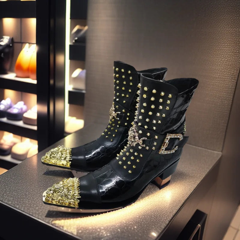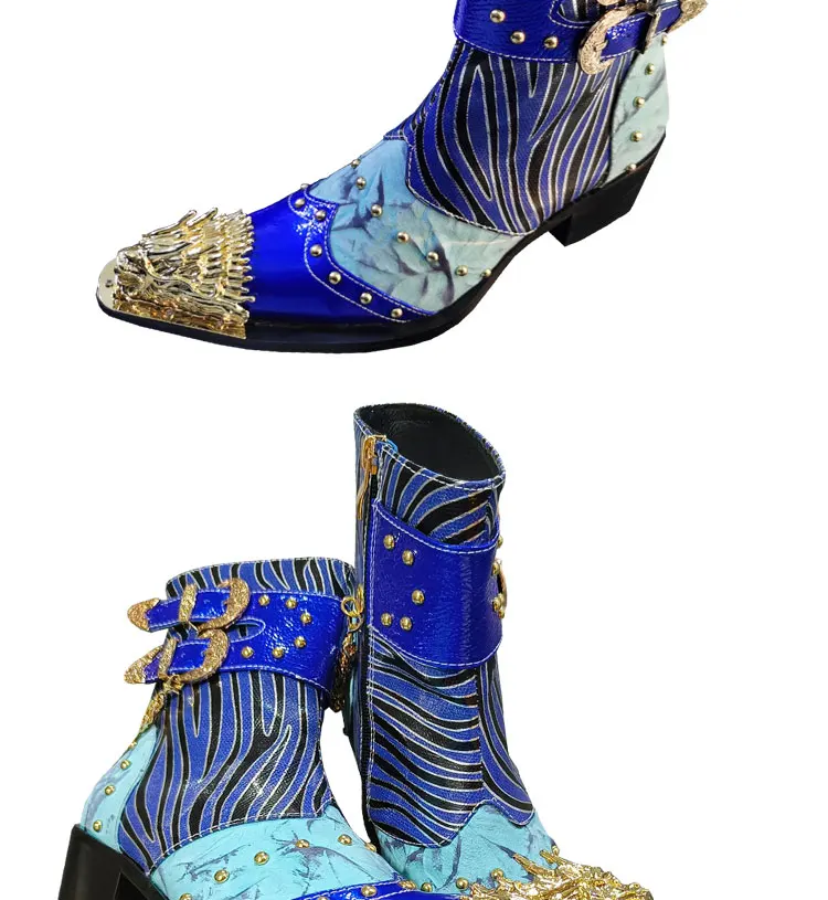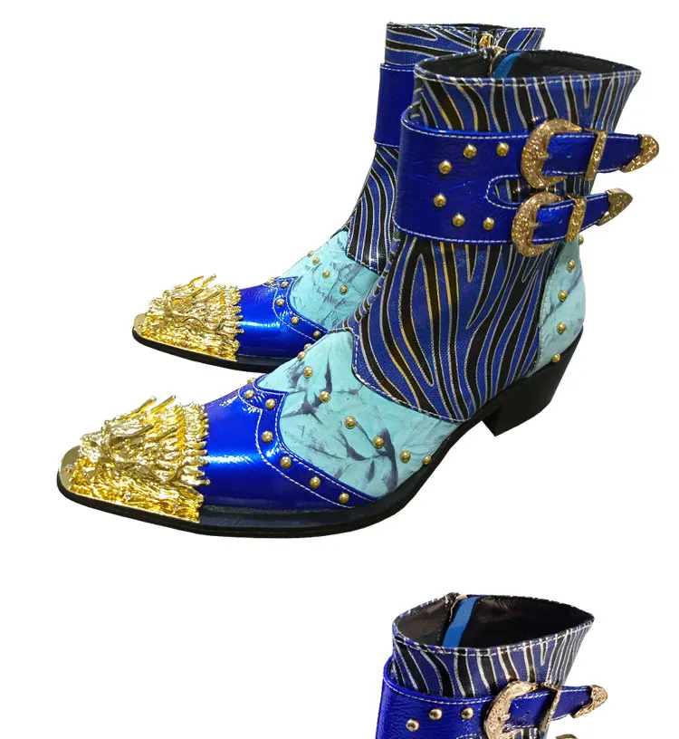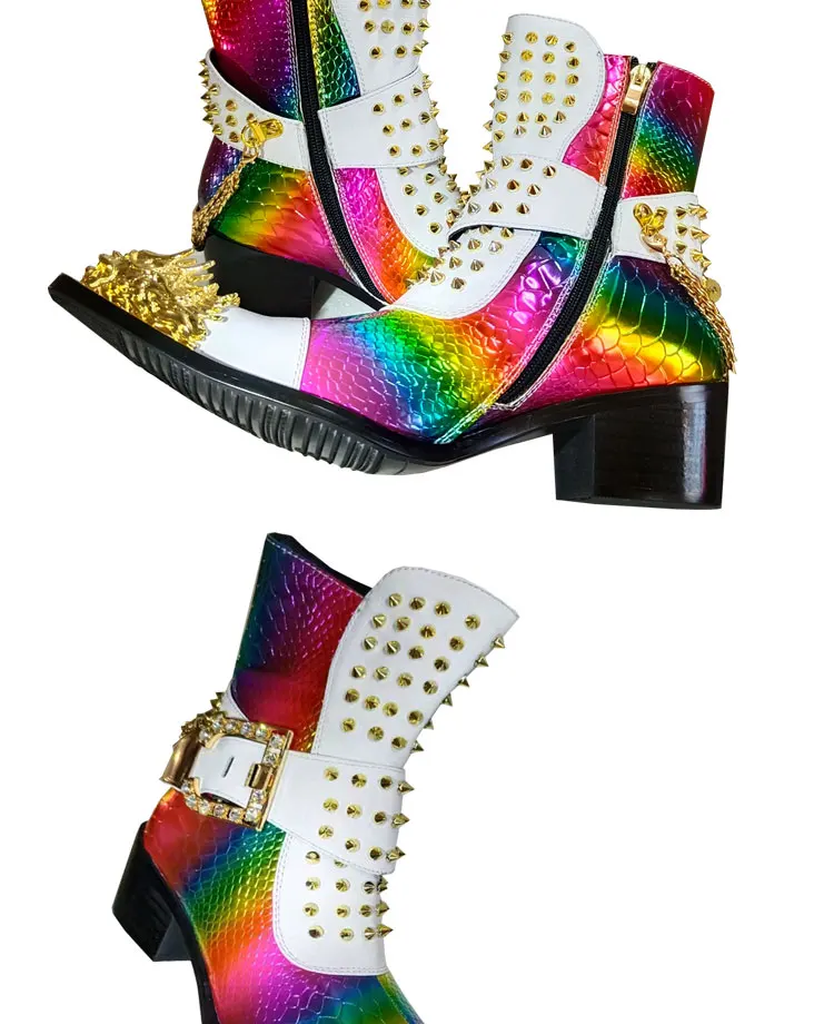 Spring High Heel Men's Boots Pointed Rivet Belt Buckle Genuine Leather Model Catwalk Luxury Increase Social Contact High Boots