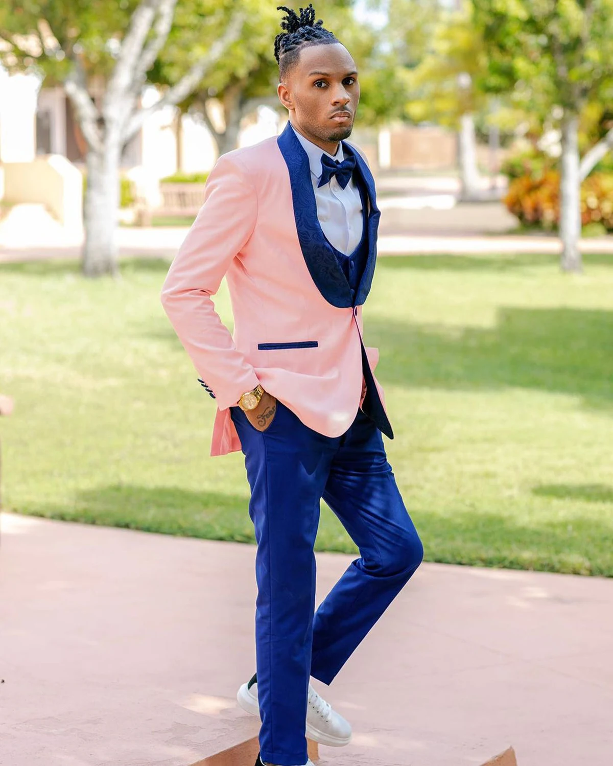 This spring pink men's suit is designed with a shawl lapel and a slim fit, making it perfect for casual wedding tuxedos. The 3-piece set includes a jacket, vest, and pants, suitable for party and birthday wear.