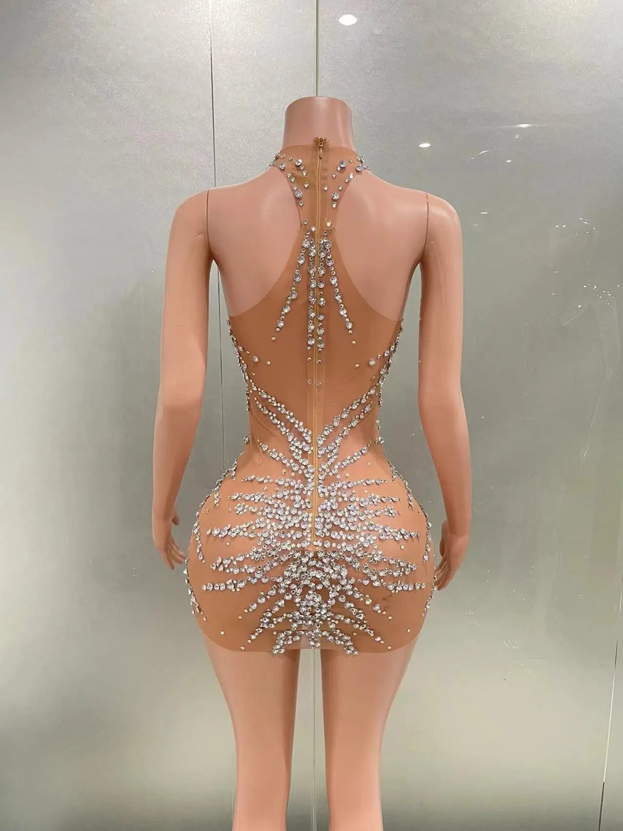 Make a dazzling entrance in this silver rhinestone-studded transparent mesh prom dress. Designed to sparkle under lights, the sultry silhouette blends sheer mesh with strategic lining and shimmering embellishments — ideal for birthdays, parties, proms, clubs, and special nightlife events.