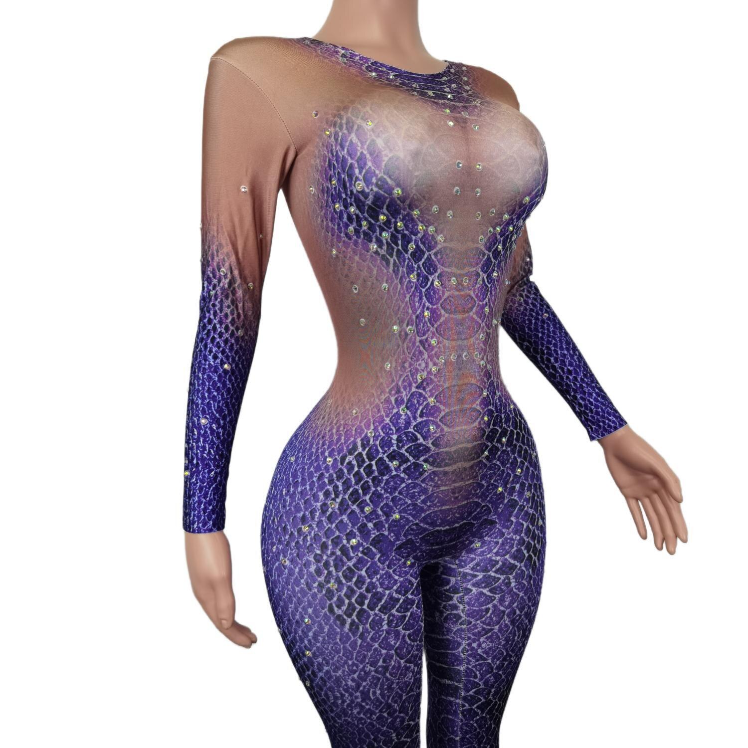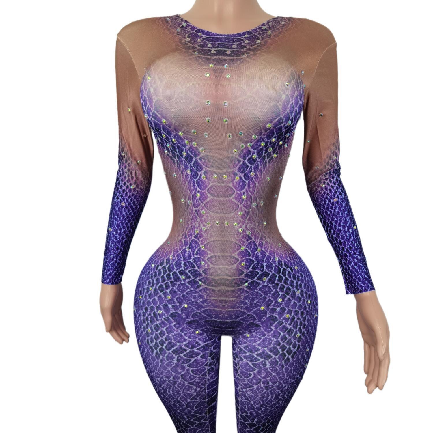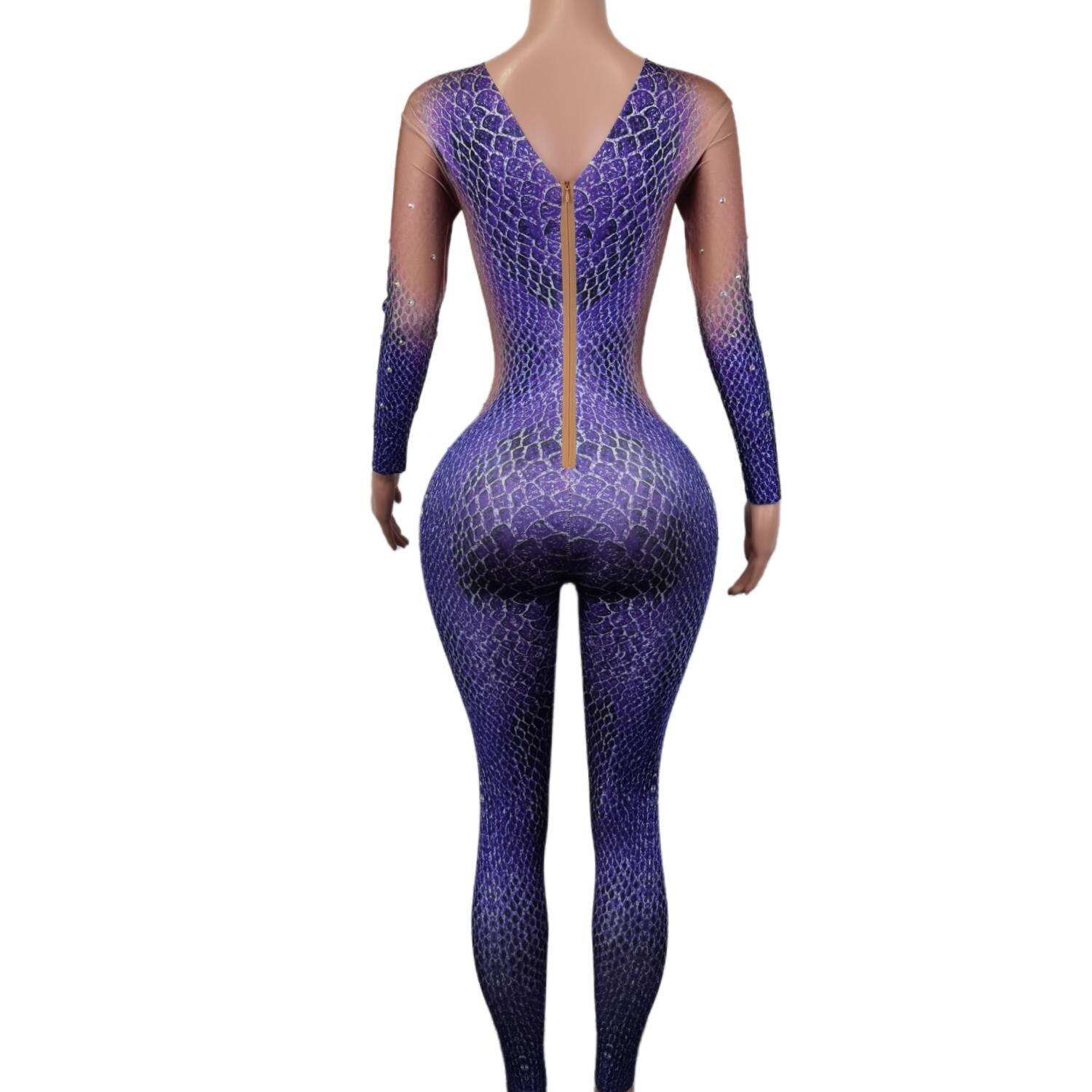 Stretch Tight Jumpsuits for Women Purple Snakeskin Pattern Rhinestone Bodysuits Cosplay Costumes Nightclub Showgirl Wear Zishe