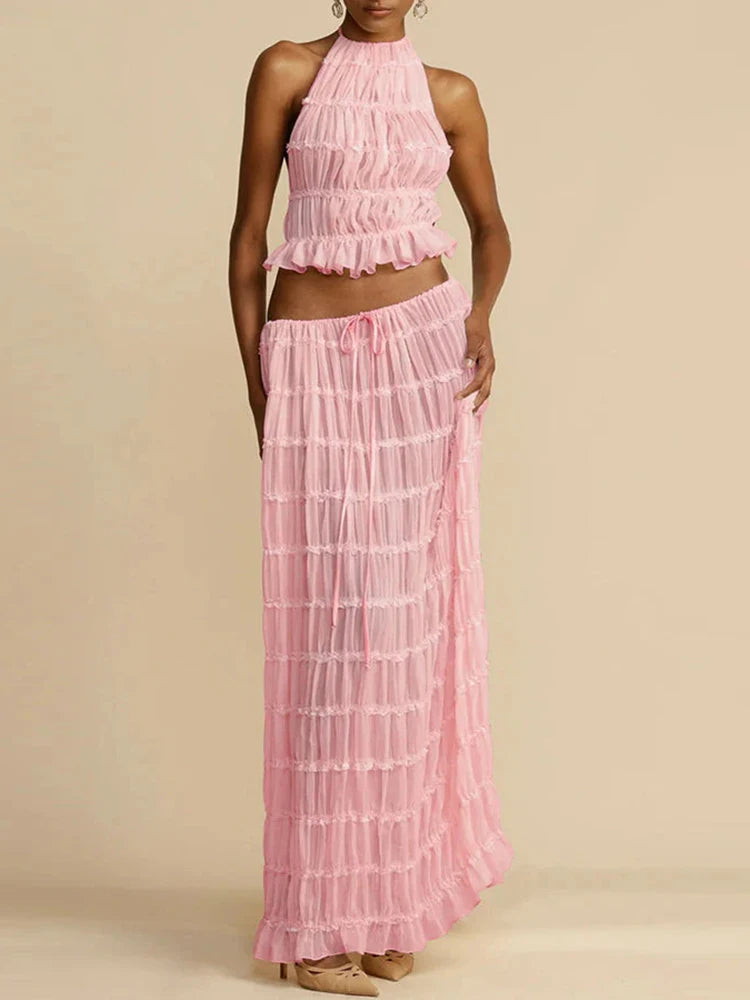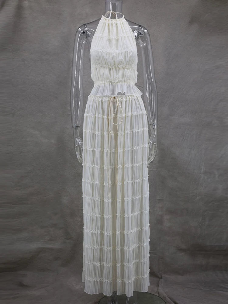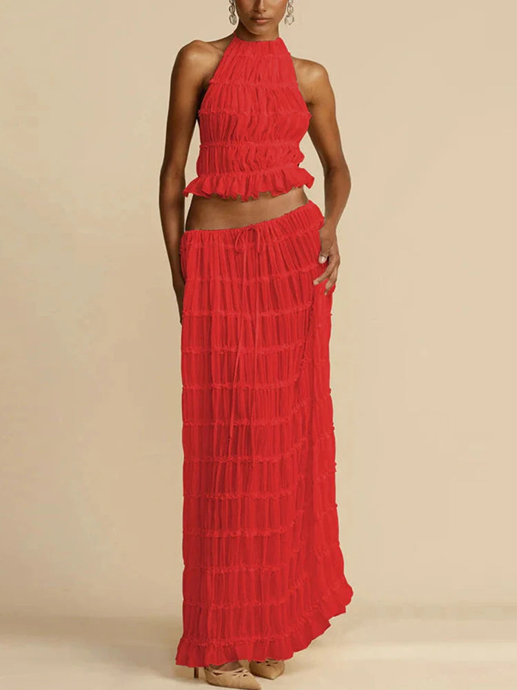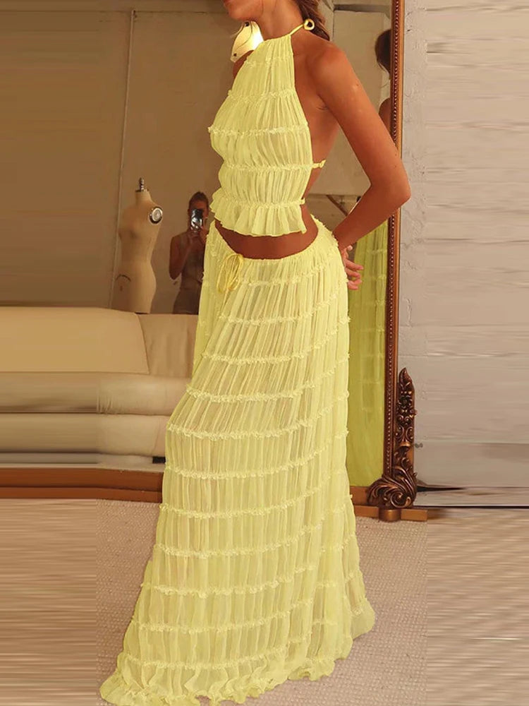 Channel your inner beach goddess with this summer-ready two-piece set for women, featuring a sexy sleeveless backless top paired with a high waist skirt that is see-through with ruffles, ideal for beach parties and holiday celebrations. The breezy and playful design of this set makes it a must-have for the warm summer days by the water. The sleeveless backless top adds a touch of allure and style, perfect for soaking up the sun, while the high waist skirt with see-through ruffles creates a whimsical and flirty look that is sure to turn heads. Stand out with confidence and grace in this eye-catching and trendy outfit that is designed to make you shine at any beach party or holiday gathering. Embrace the carefree spirit of summer and showcase your chic style with this set that combines flirtatious details with a beach-ready vibe, ensuring you make a splash at any beach party or vacation celebration with your fashion-forward ensemble.