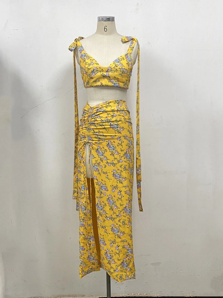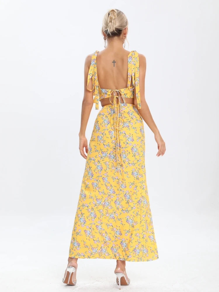 Get ready for summer with this stylish Summer Women Sleeveless Print Top and Split Skirt Two-Piece Set! This set features a sleeveless print top with a sexy lace-up backless design, paired with a split long skirt for a beach party-ready look. The vibrant print on the top adds a fun and summery touch, while the split skirt allows for movement and a touch of elegance. Perfect for beach parties and summer gatherings, this set is both fashionable and comfortable. Make a statement with this chic and trendy ensemble that exudes a carefree and stylish vibe. Embrace the summer season in style with this eye-catching two-piece set that is sure to turn heads and make you stand out at any beach party or summer event.