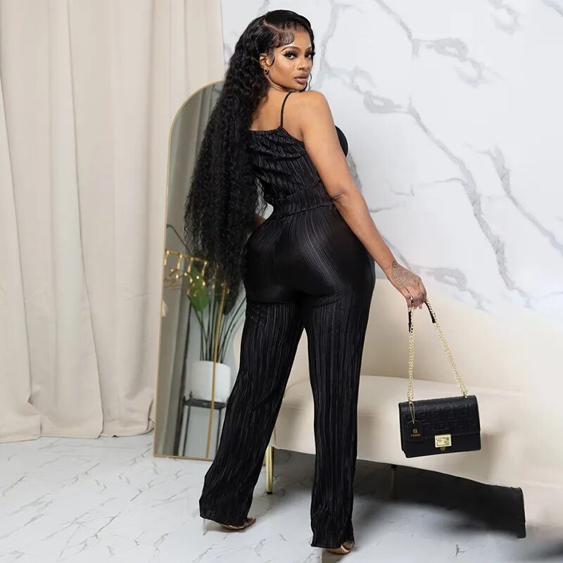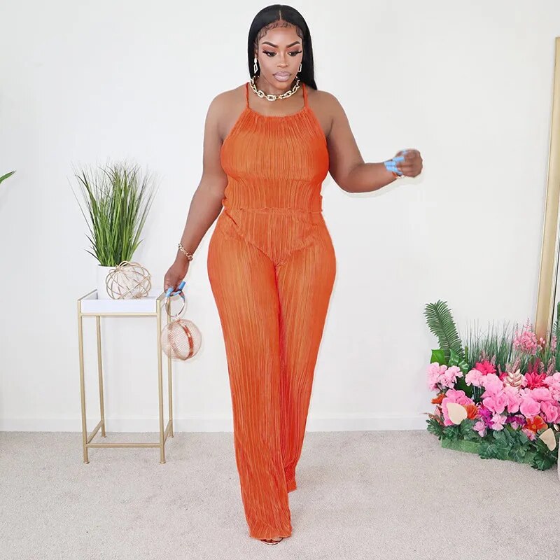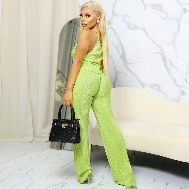 Pleated Women's Set Camis Crop Tops And Wide Leg Long Pants High Waist Sexy Casual Holiday Party Summer 2pcs Set Outfits