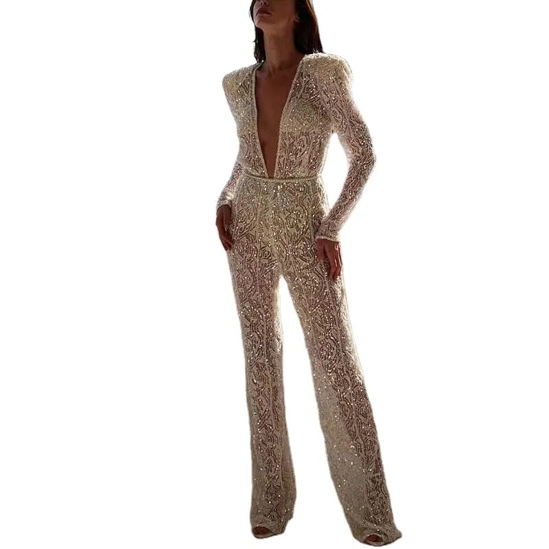 The New Women's Sexy Long-sleeved, Deep-v Silver Sequin Two-piece Party Dress Pant Jumpsuit