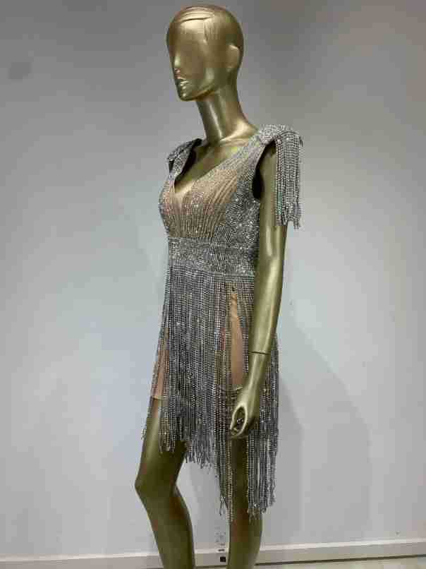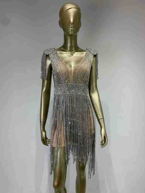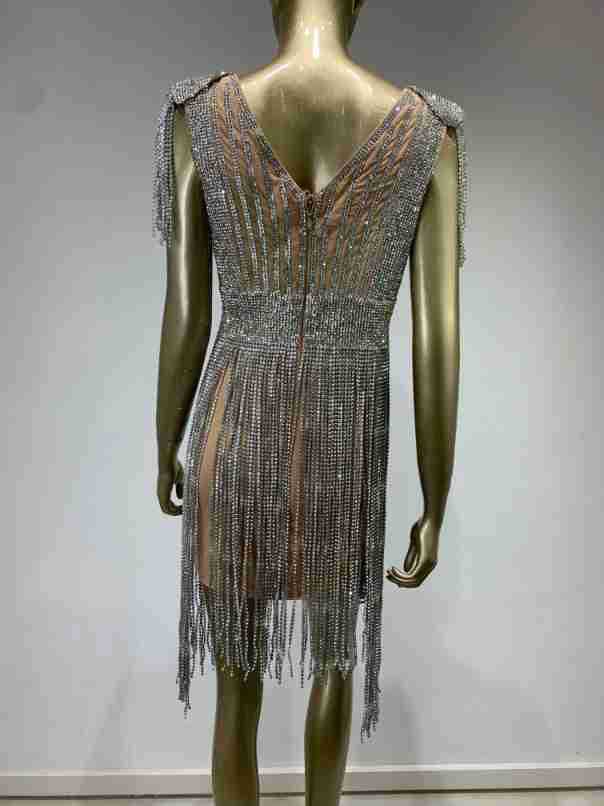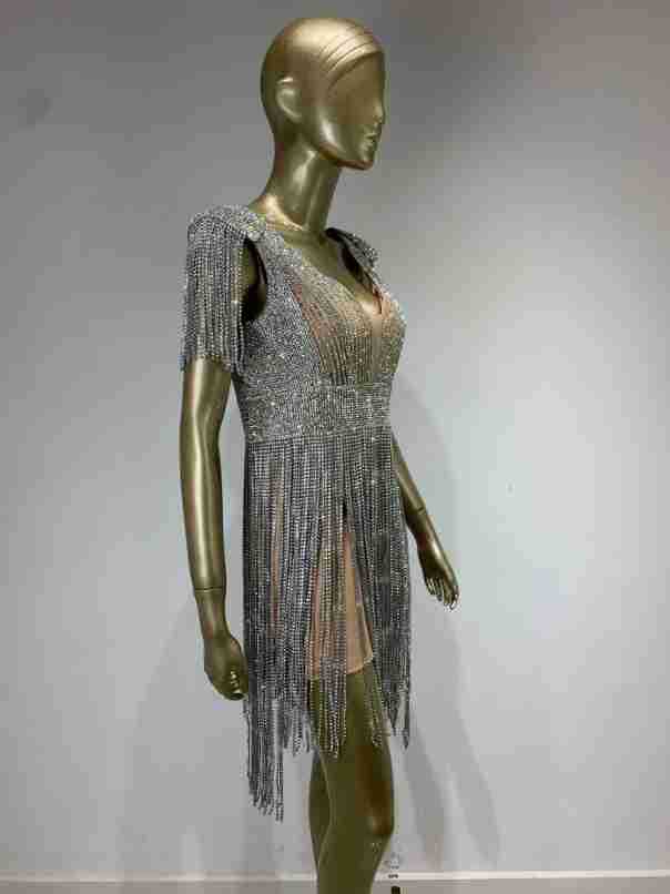 Handmake Women Silver Diamond Chain Bodycon Mini Dress Nightclub Party Birthday Celebrate Performance Costume
