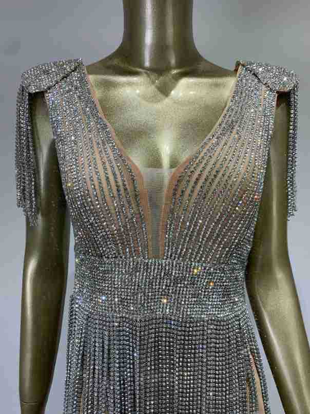 Top Quality Handmake Women Silver Diamond Chain Bodycon Mini Dress Nightclub Party Birthday Celebrate Performance Costume