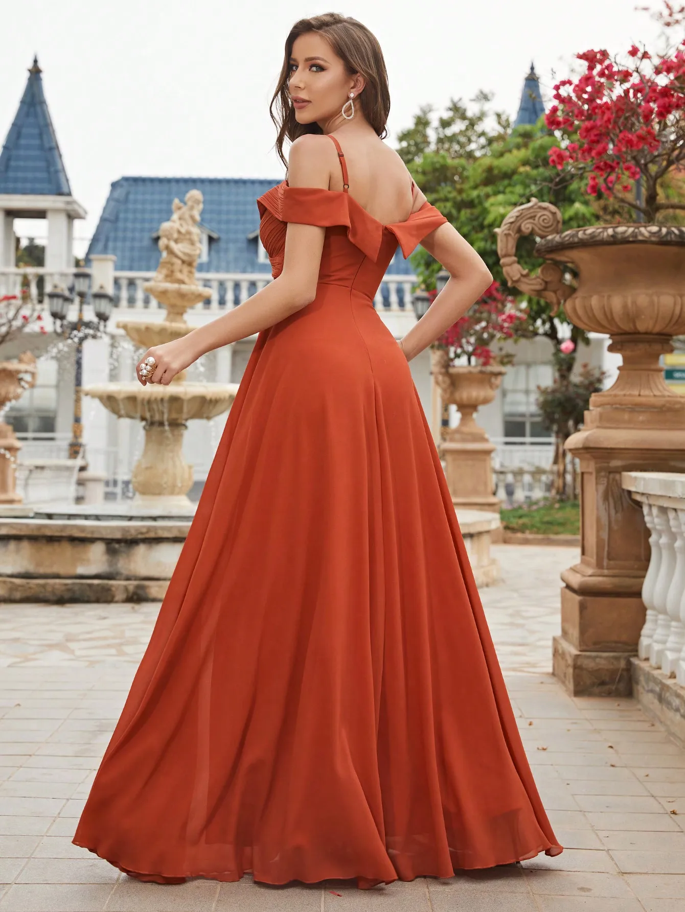 Unithorse Cold Shoulder Ruched Floor Length Chiffon Bridesmaid Dress