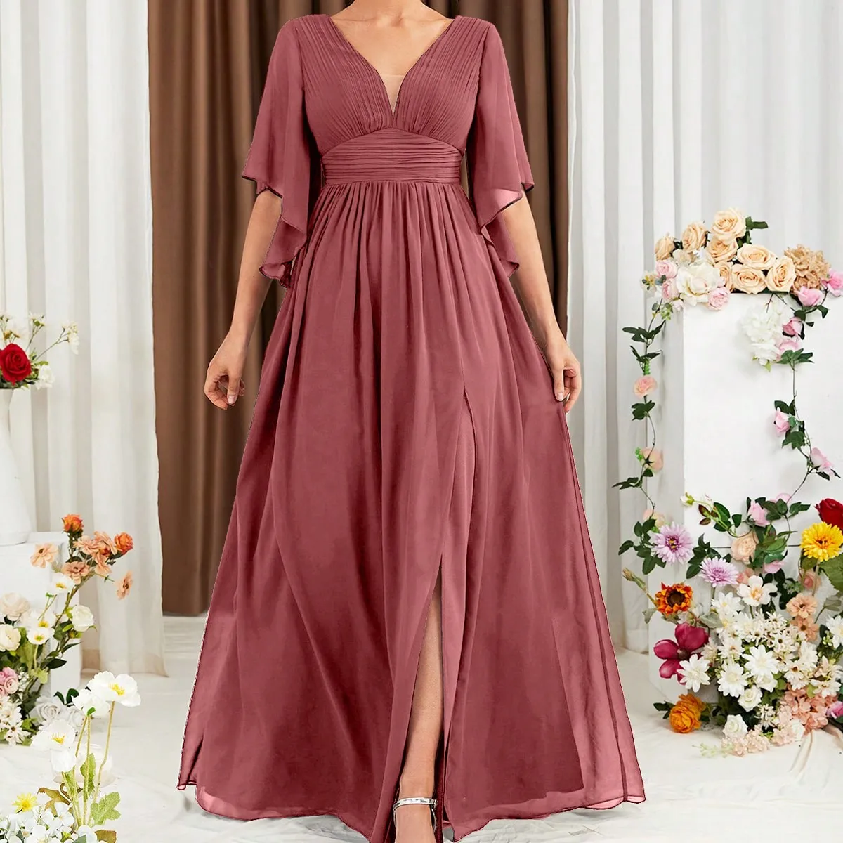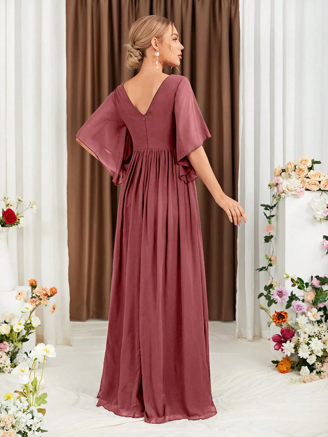 Unithorse Plunging Neck Butterfly Sleeve Split Thigh Chiffon Bridesmaid Dress