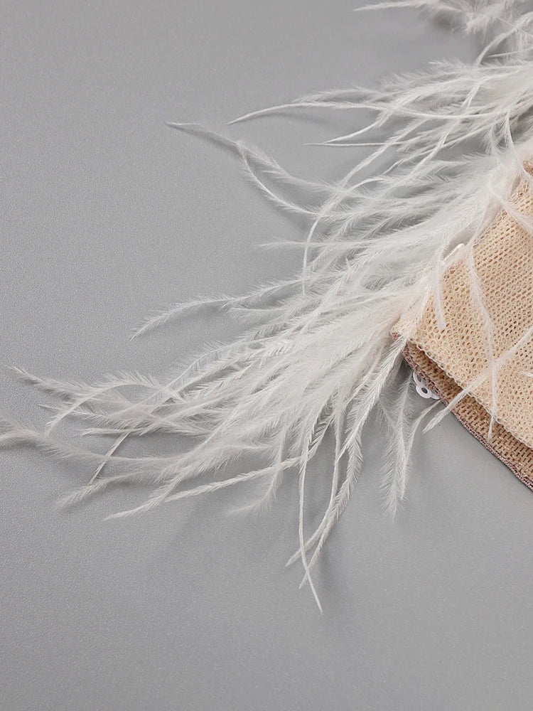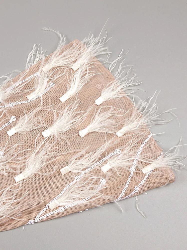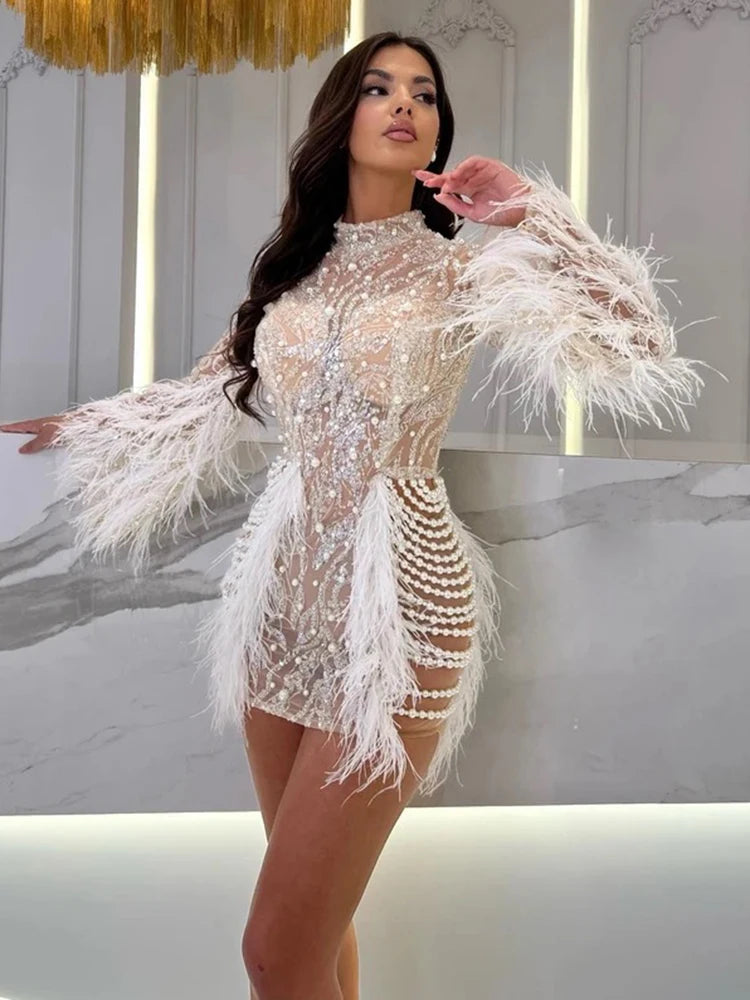 VC Luxury Dress for Women Elegant and Pretty Feathers Sequins Long Sleeves Prom Short Dress