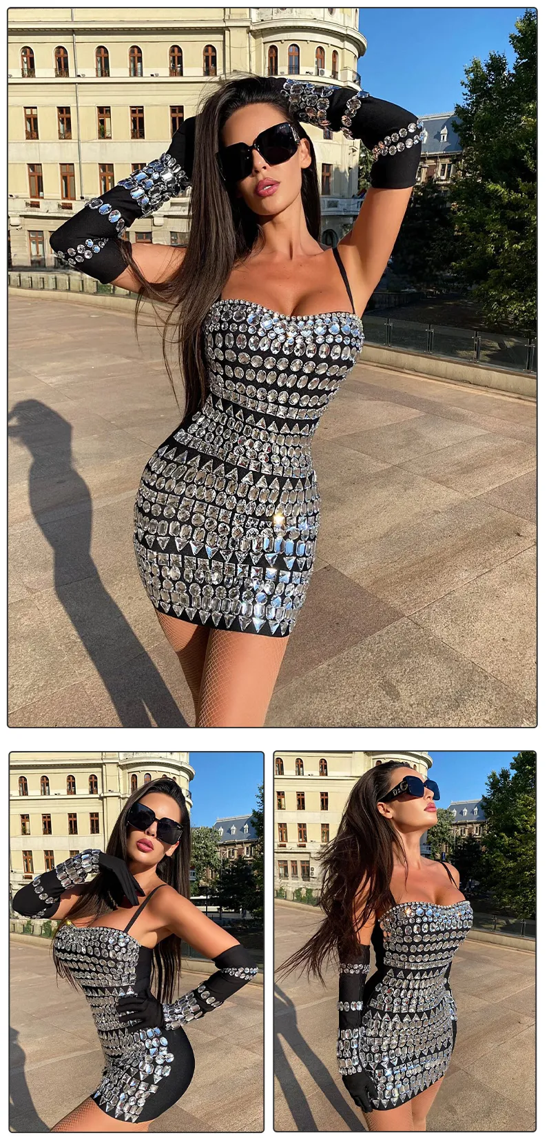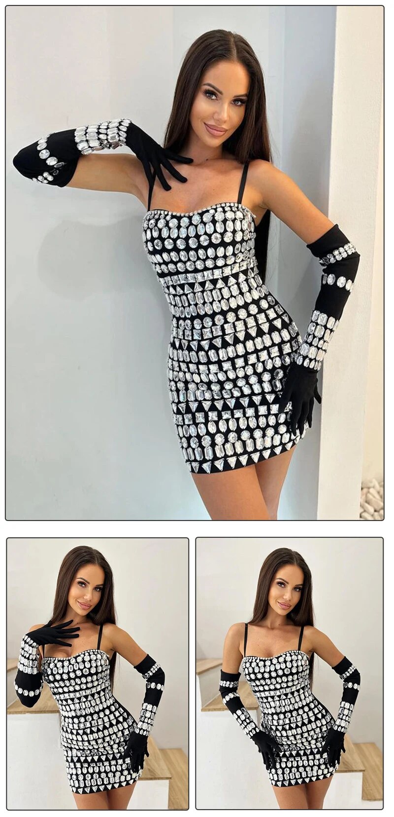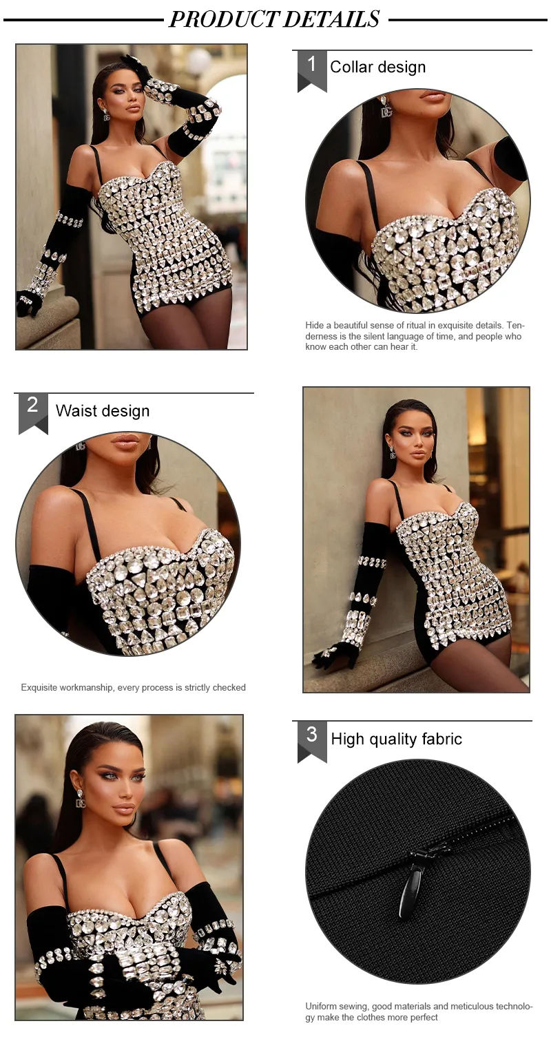 Luxury Party Dress For Women Clubwear Long Sleeve Gloves Bodycon Bandage Black Mini Dress With Beads Diamond Decoration