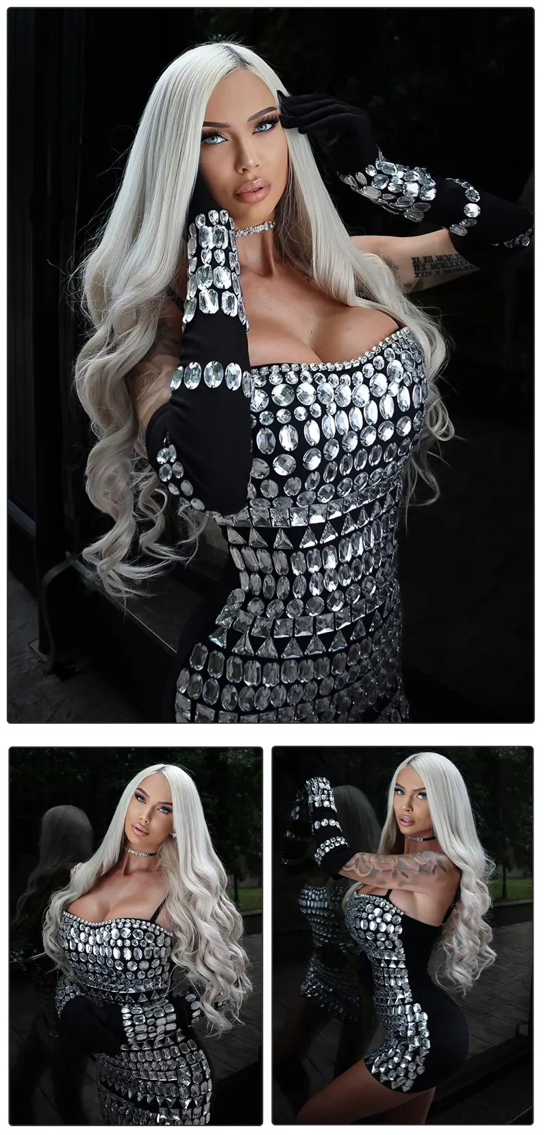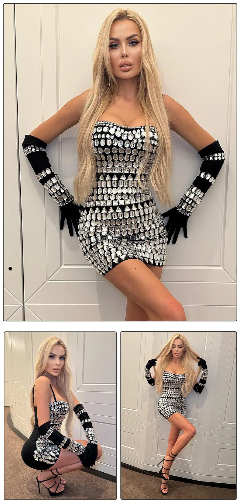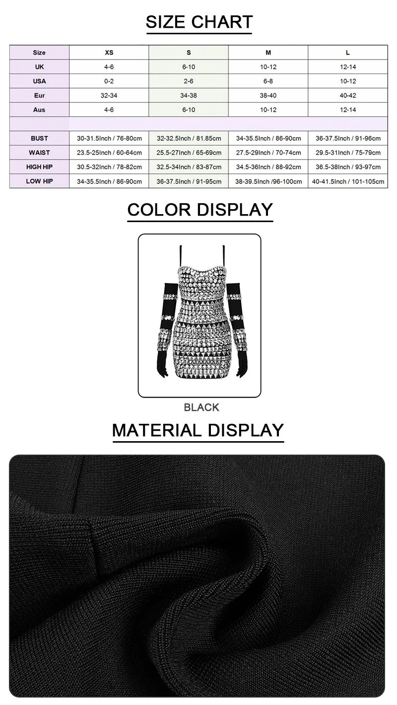 Luxury Party Dress For Women Clubwear Long Sleeve Gloves Bodycon Bandage Black Mini Dress With Beads Diamond Decoration