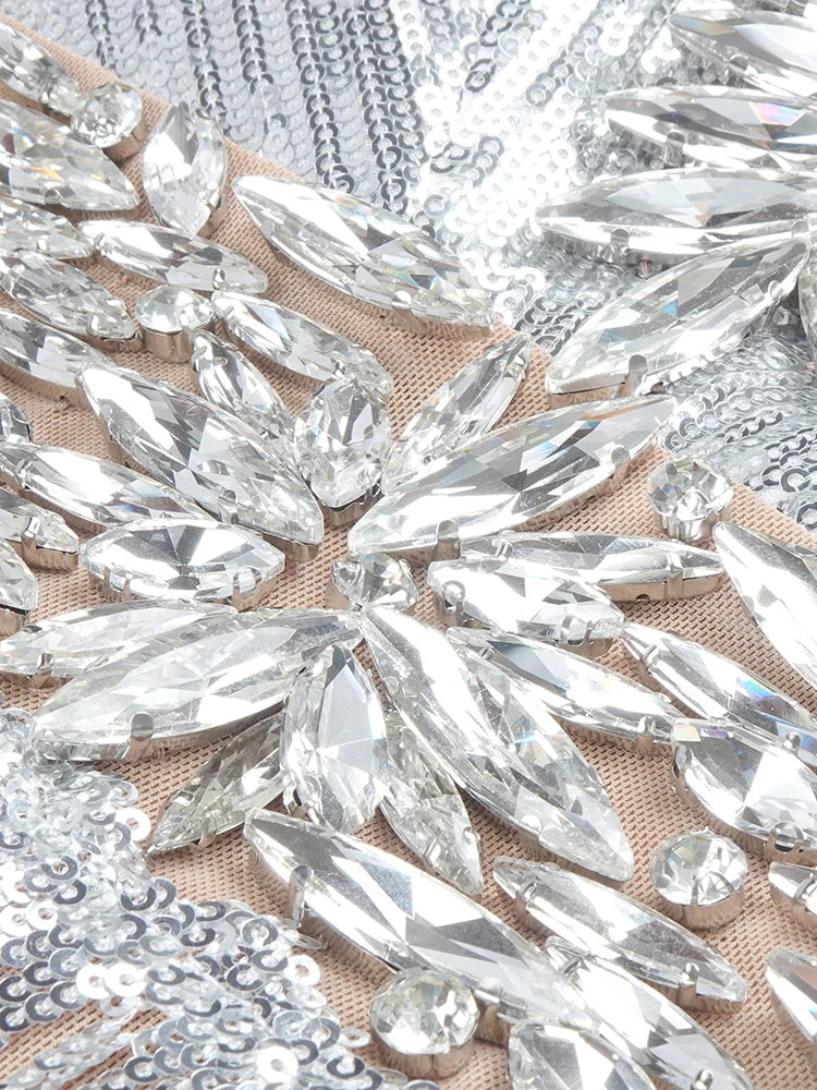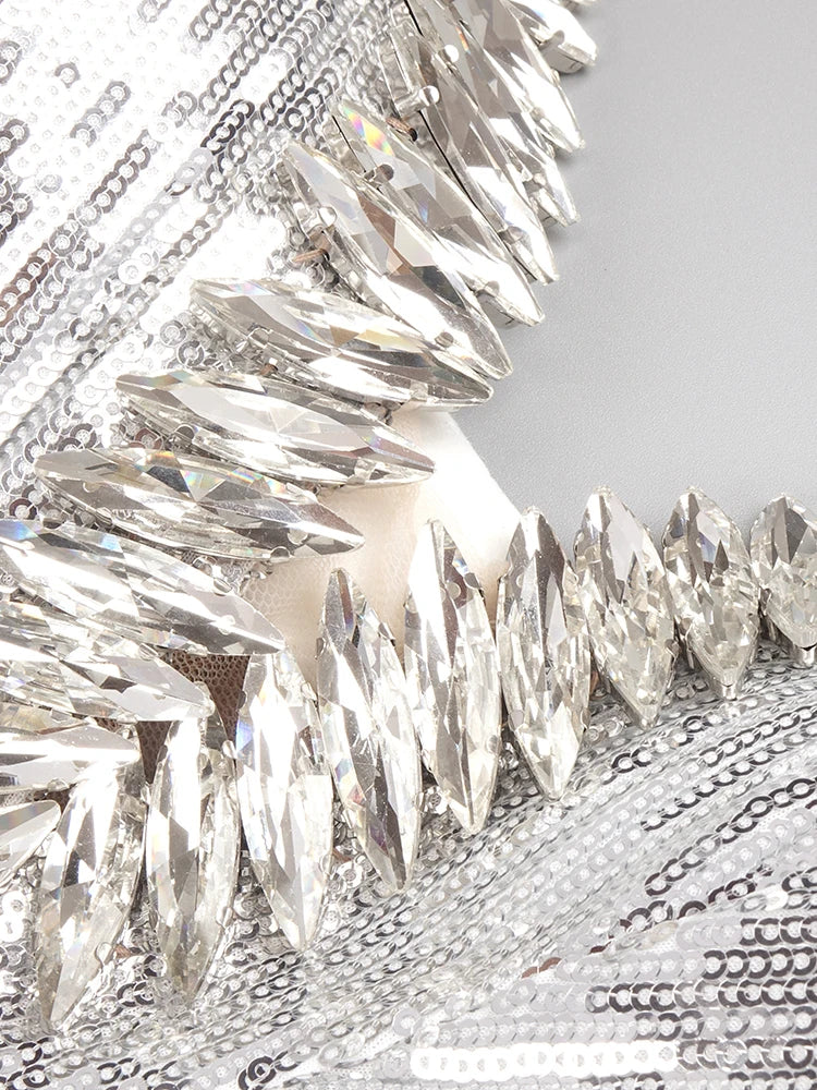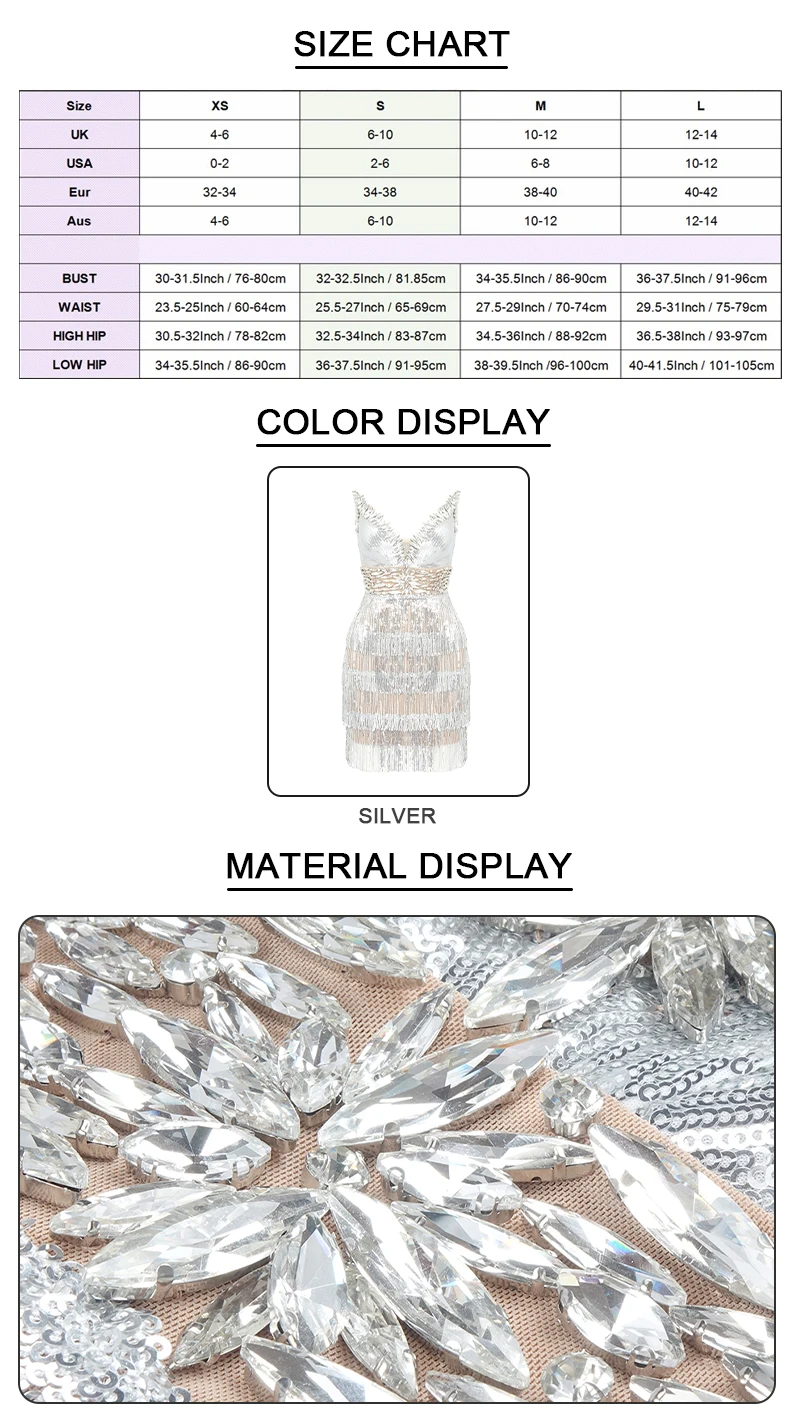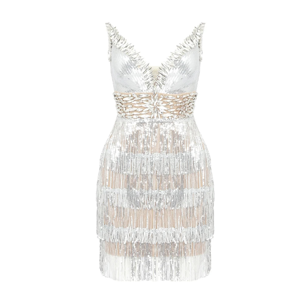 Dazzle at any event in this VC luxury party dress for women. Perfect for evening and formal occasions, this sleeveless mini dress features a sexy V-neckline and sparkling silver tassels that catch the light with every move. Its elegant yet bold design makes it an ideal choice for unforgettable nights out and special celebrations.