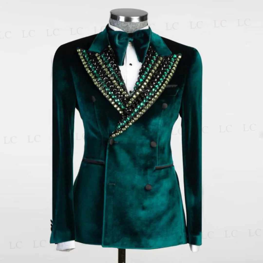 Luxurious Velvet One-Piece Blazer Men's Suit embellished with Diamonds, Crystals, and Beadings. This exquisite ensemble is perfect for Fashionable Formal Events, Prom, Weddings, Grooms, and available in Plus Sizes. Custom-made to ensure a perfect fit, elevate your style with this sophisticated and opulent suit.
