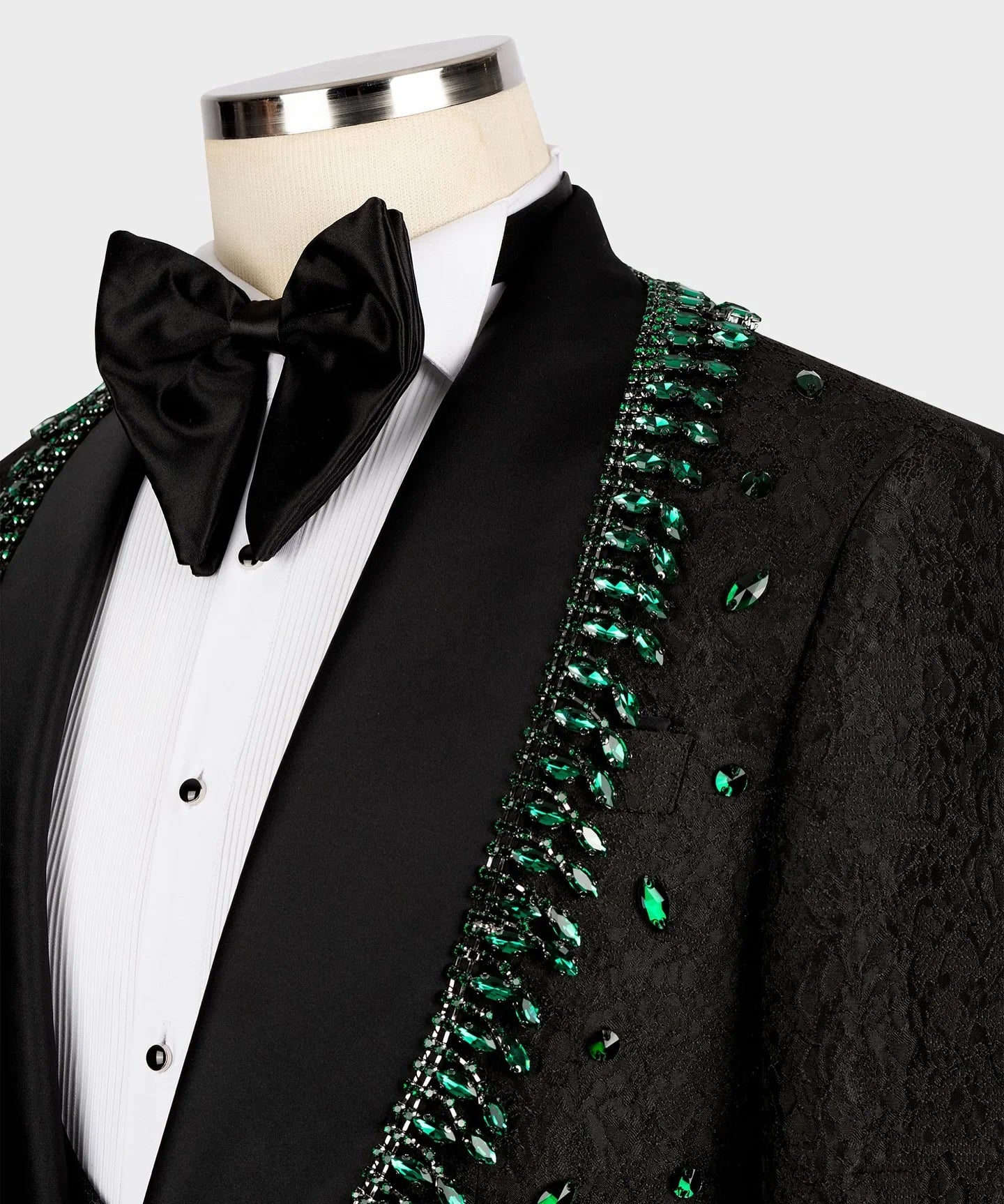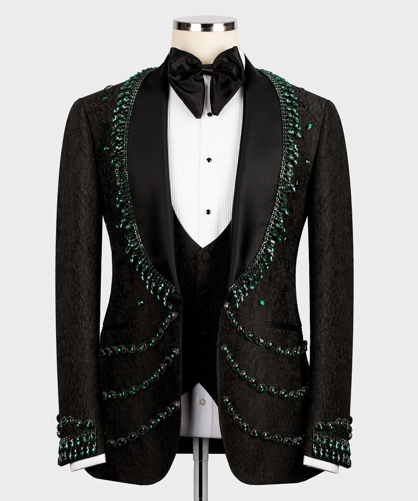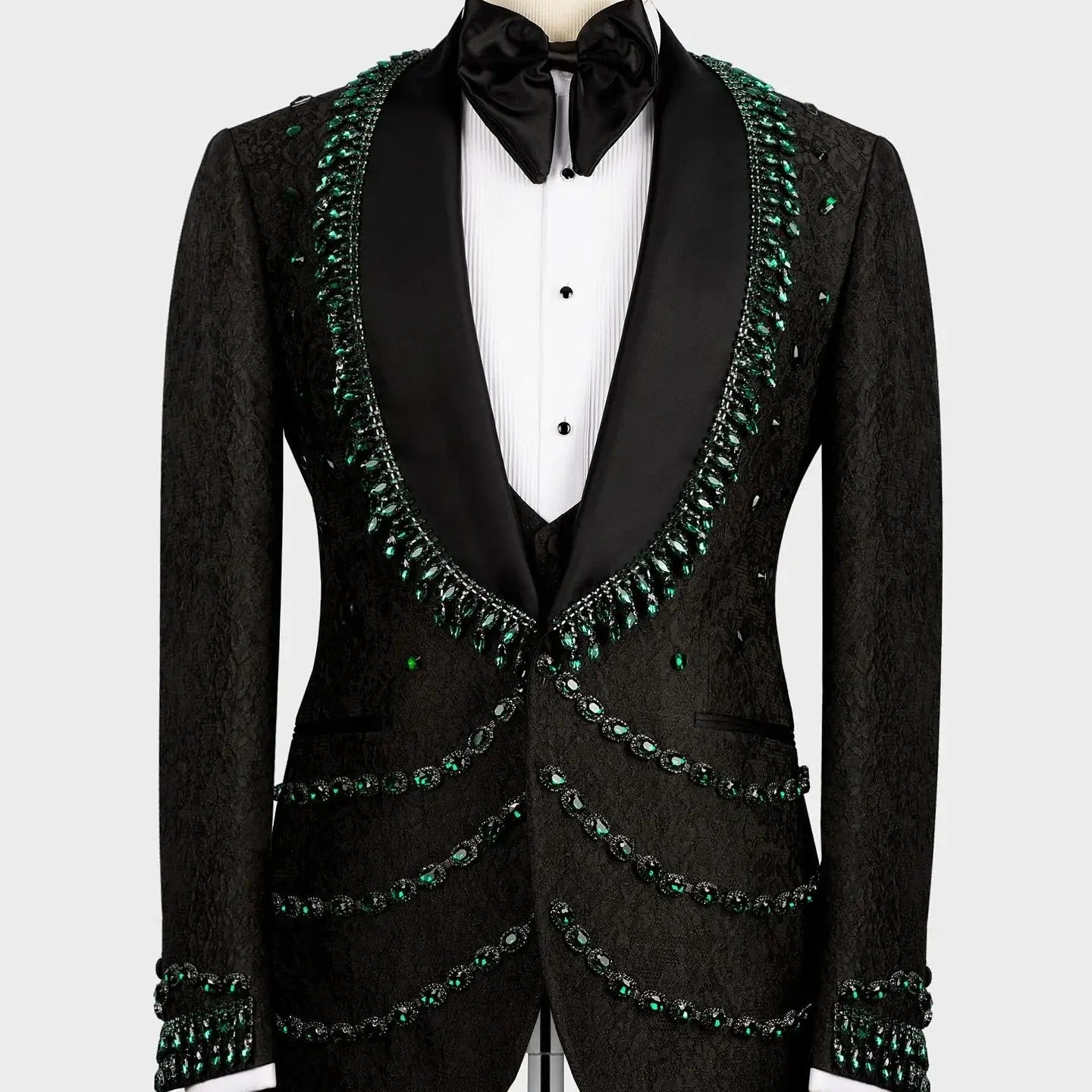 Make your wedding day distinctly memorable with this Vintage‑inspired, tailor‑made 3‑piece men’s suit. Combining heirloom jacquard texture with refined shawl lapels and delicate crystal beadwork, this jacket‑vest‑pants set delivers romantic elegance with couture-level tailoring—perfect for grooms who want a timeless, photograph-ready look