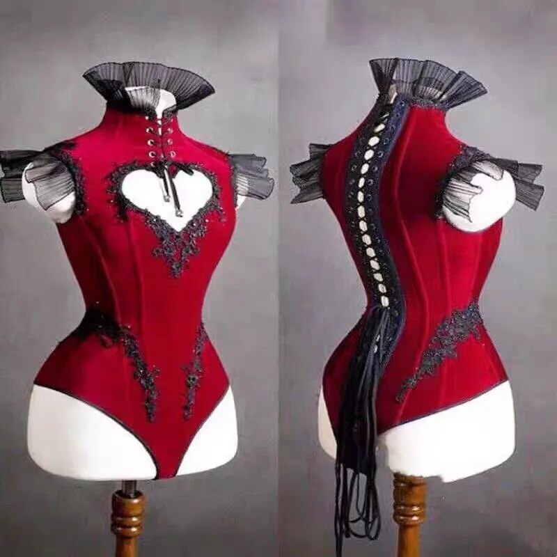 Vintage Red Heart Cutout Strap Bodysuit Gogo Costume Women Dancer Jazz Dance Leotard Nightclub Party Sexy Performance Stage Wear