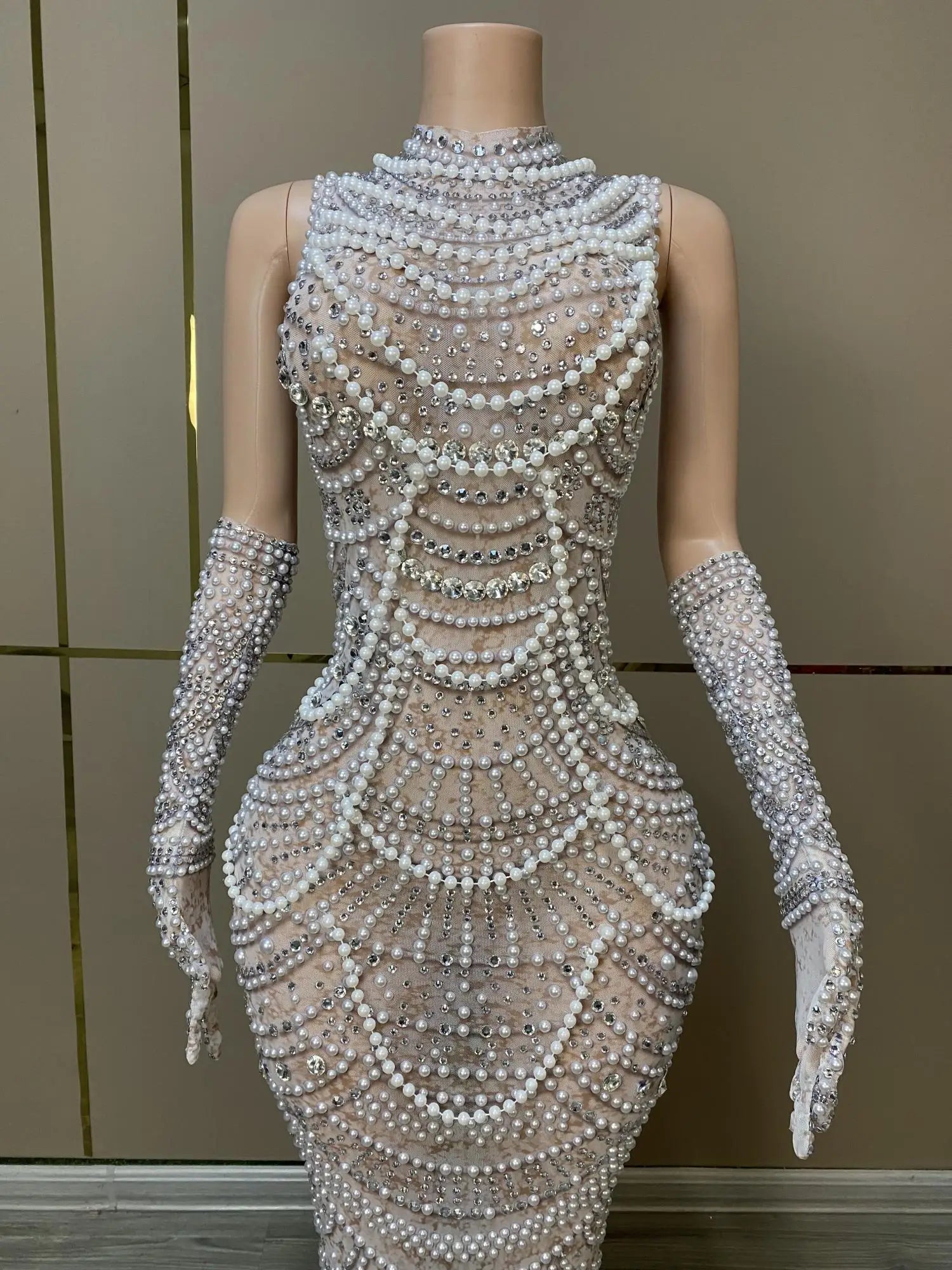 Vintage Sexy Long Wedding Dress Sleeveless Pearls African Women White Bridal Wedding Gowns with Gloves