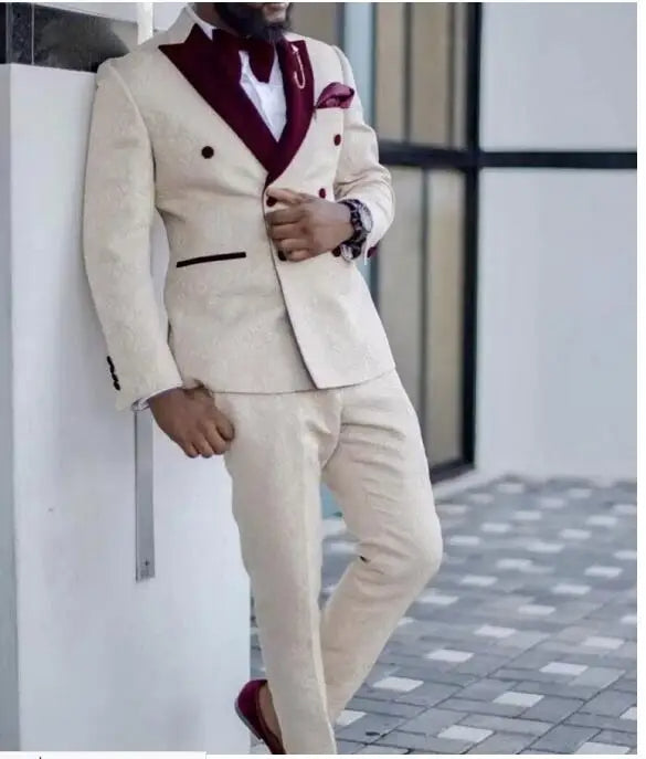 This formal men's suit in a slim fit features a stylish burgundy color with contrasting collars, making it an ideal choice for grooms and wedding attendees. The set includes a tailored blazer for a polished look, along with matching pants, perfect for weddings, proms, and other formal occasions.