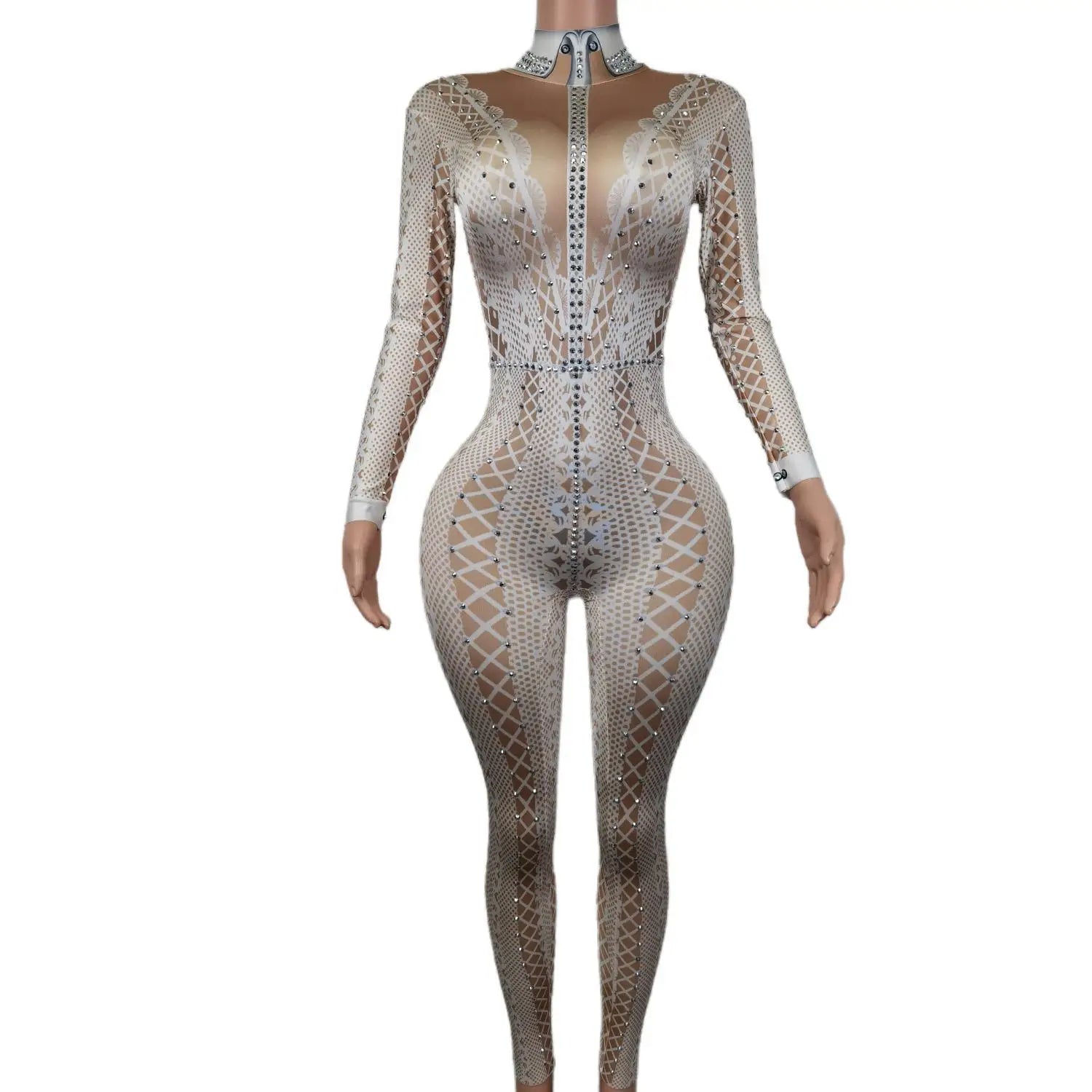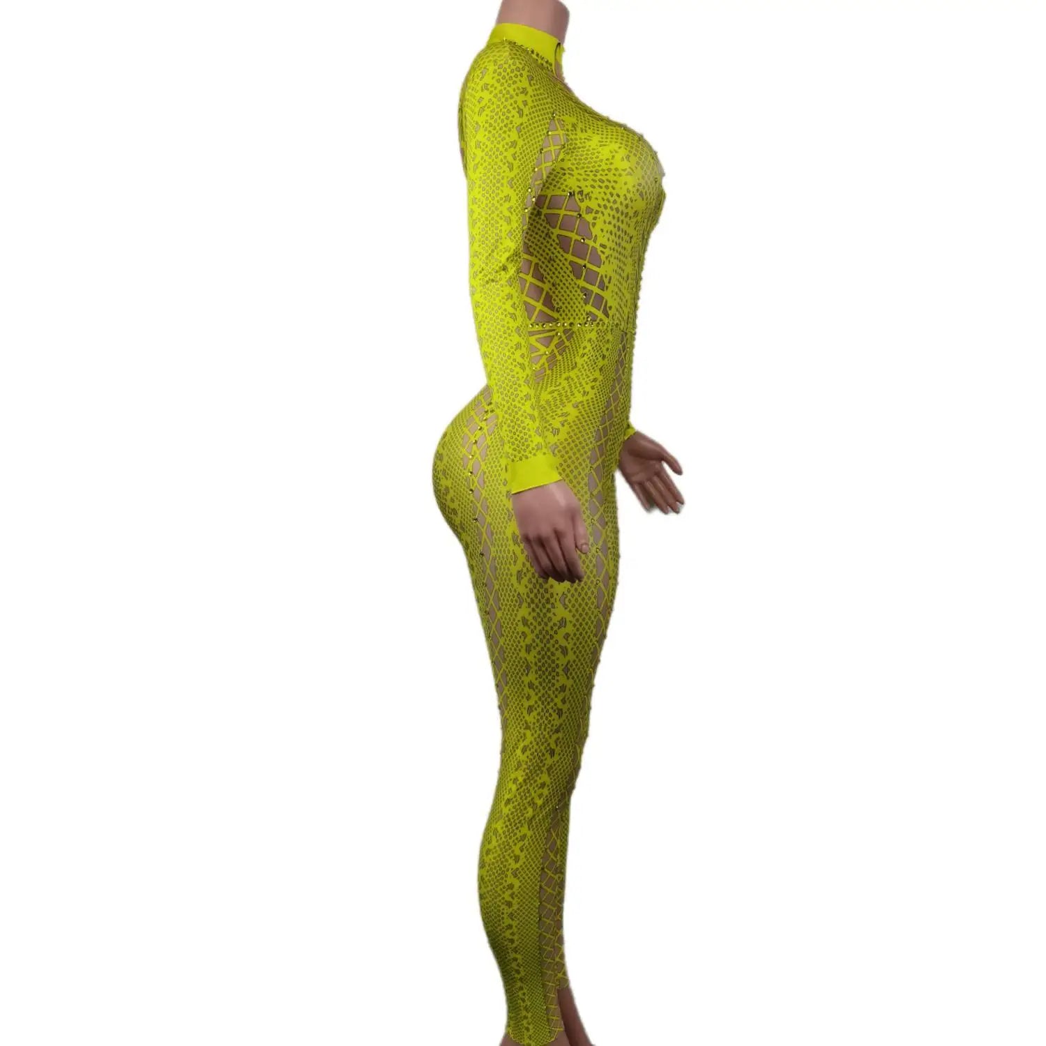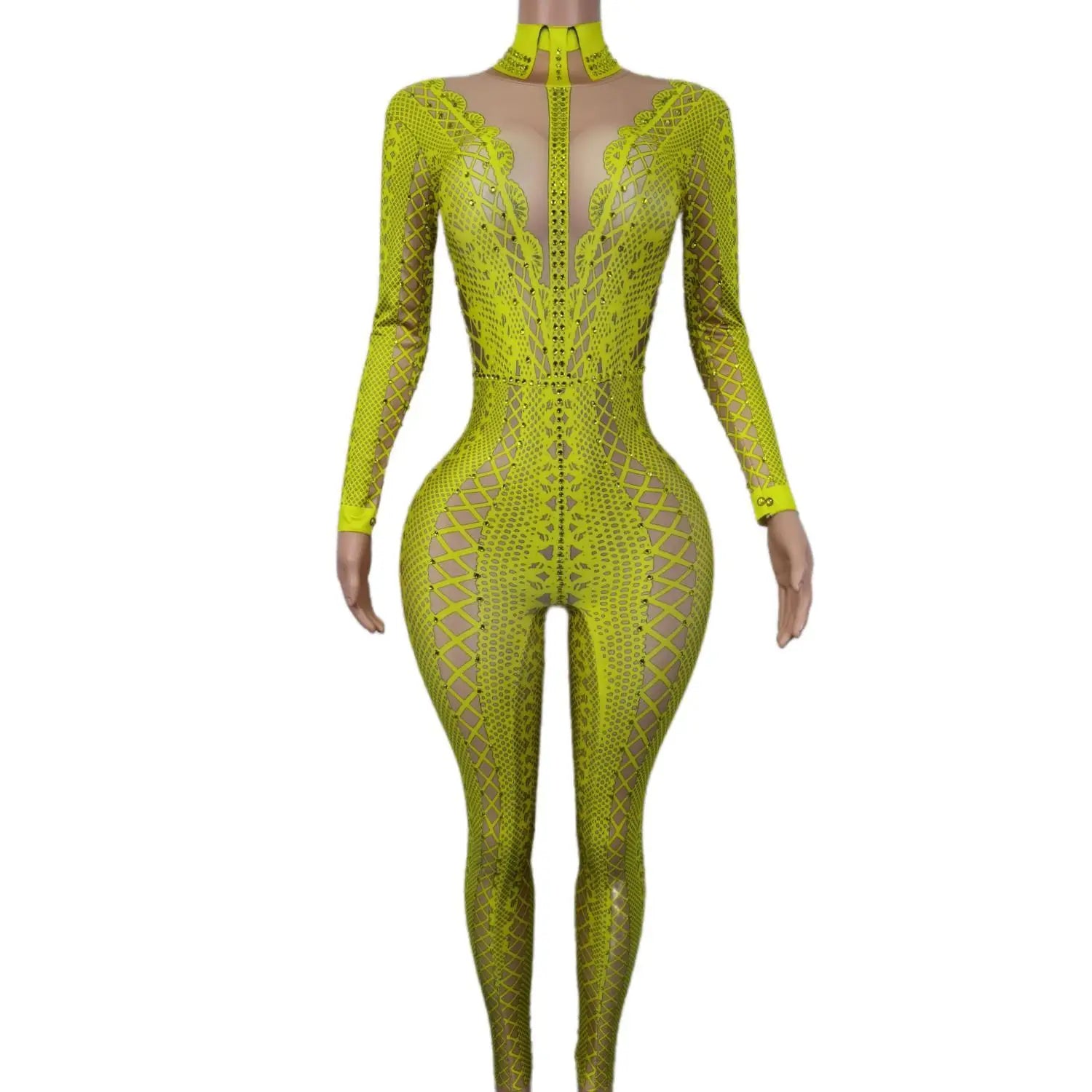 A bold, photo‑ready yellow jumpsuit designed for stage, club, and performance use: this piece combines all‑over printed patterning with precision rhinestone accents, a turtleneck for striking lines, long sleeves for added drama, and a tights‑style, leotard construction that supports movement and presents clean silhouettes under lights.
