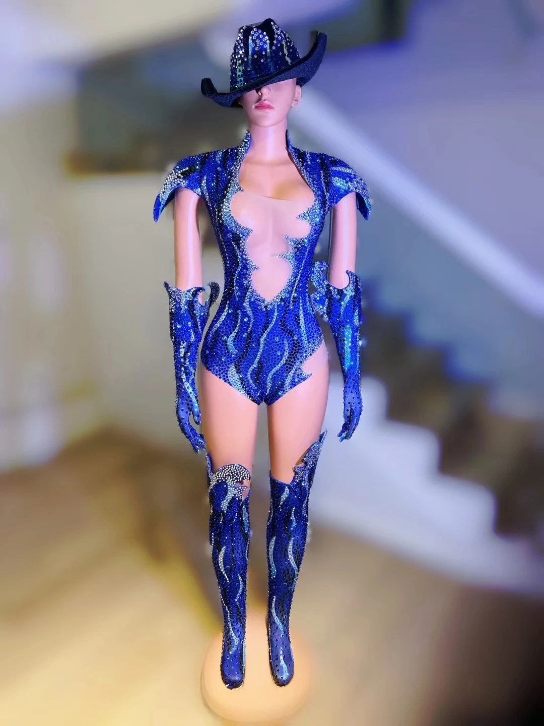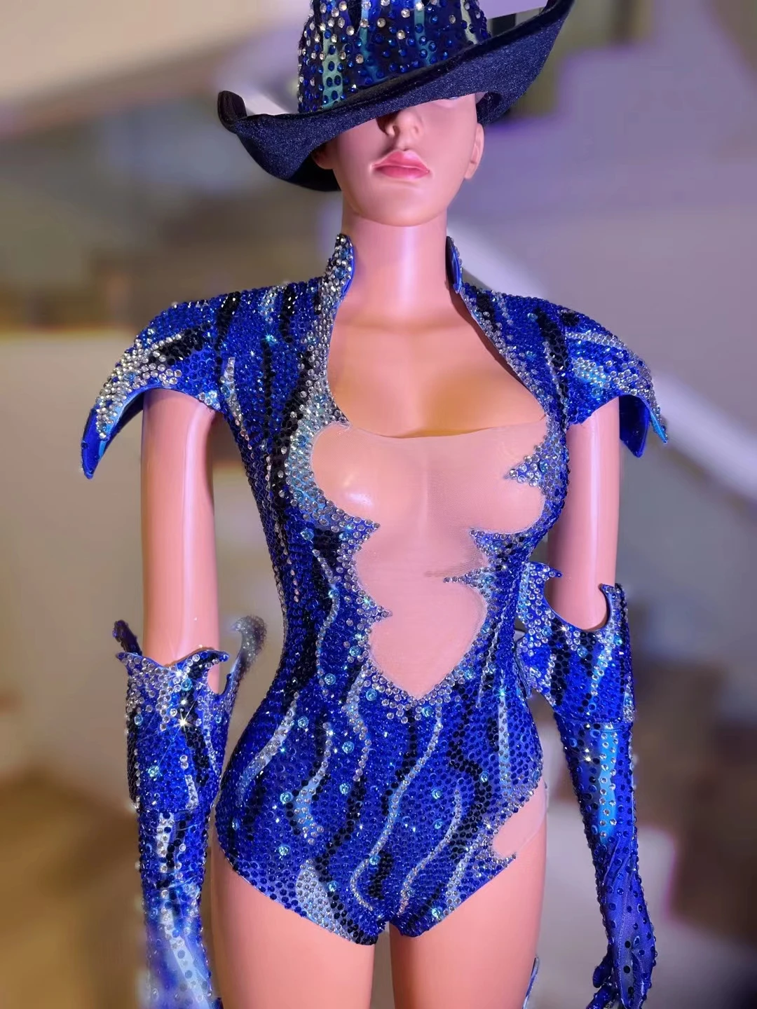 Women All Set Shinning Bodysuits Rhinestone Dance Costume with Hat Party Halloween Party Wear Celebrity Drag Queen Wear Fangao